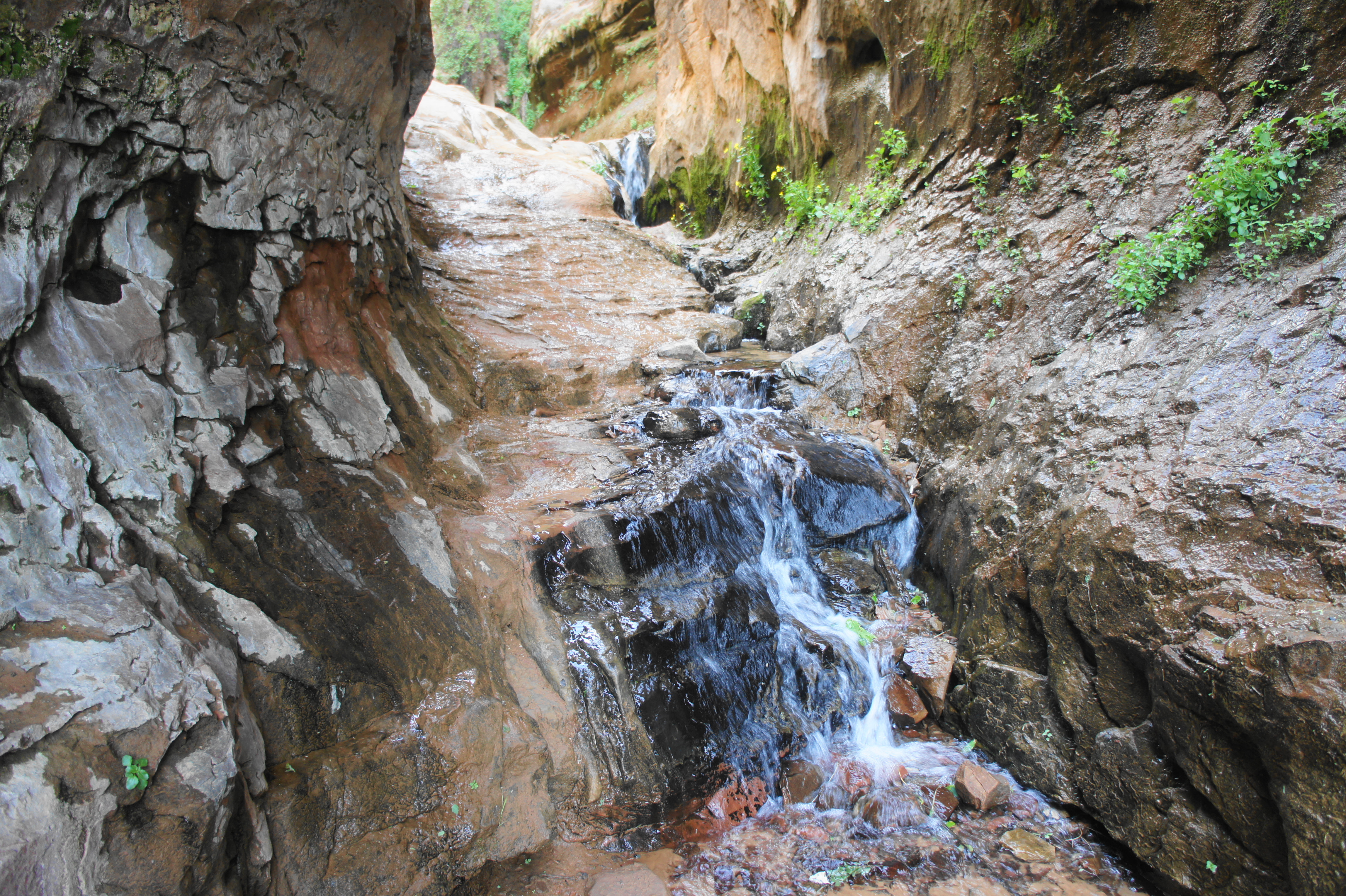 Climbing partway up the sandstone cliffs of Canaan Mountain, this short hike—located just over the Utah border from Colorado City, Arizona—ascends rocky and sandy terrain to a beautiful perennial waterfall, short slot, and bowl-shaped narrows resembling “The Subway” in nearby Zion National Park. Water Canyon is notable for its year-round stream, which gives life to dense vegetation in an otherwise very dry, desert environment. Ambitious hikers can continue on to the hightops of Canaan Mountain, but most visitors will turn around at the waterfall/slot situated about 1.1 miles from the trailhead.