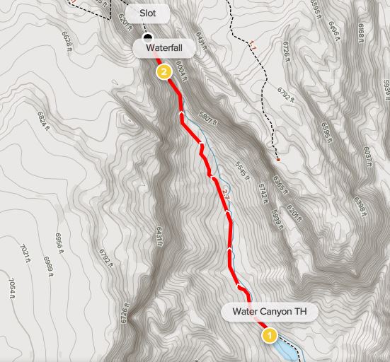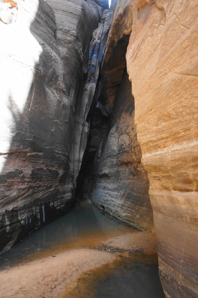 Onward passage requires ascending the throat of the falls or climbing a thin notch just off to the left; both lead up to a beautiful, fluted chamber surrounded by high walls. Here the sandstone splits into parallel chunks, each harboring some vegetation; some are passable partway before rising to near-vertical heights. A use path hugs a sandy slope on the left, doubling back to the south briefly before rising to the next level up. From here one can scramble across partly exposed ledges to a final slot—narrowing to a few feet across—which ends quickly at a murky pool. (Note: This sometimes hosts a beautiful waterfall, but it was not present as of mid-May 2021.)