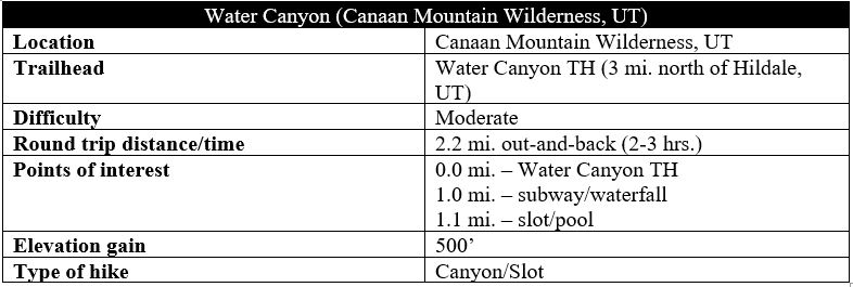 Water Canyon Trailhead offers access to the BLM-managed Canaan Mountain Wilderness, which protects a 44,500-acre tract of public space covering similar terrain as nearby Zion National Park. As visitors drive Water Canyon Road—a gravel track—north from Colorado City, Arizona and neighboring Hildale, Utah—the cliffs of thick Navajo sandstone begin to envelop the surroundings and rise nearly 2,000 feet above the canyon floor. Water Canyon Road first passes a series of residences and commercial “glamping” options, then continues past the Squirrel Canyon Trailhead on the right. The road ends with a set of two parking areas, separated by a stagnant pond. The far parking lot, closest to the start of the hike, is preferable but often fills up by mid-morning, requiring travelers to instead find a spot at the secondary lot about ¼ mile back. There are restrooms and a map at the trailhead.