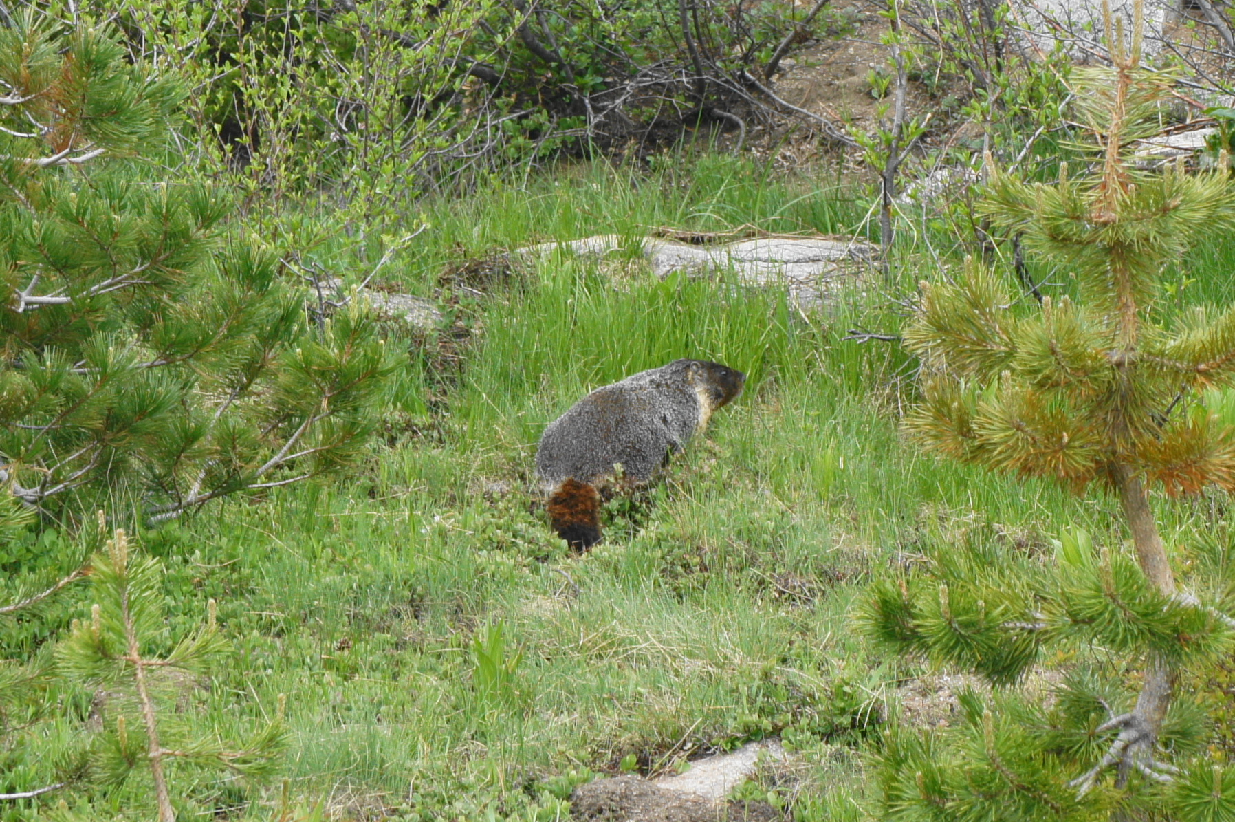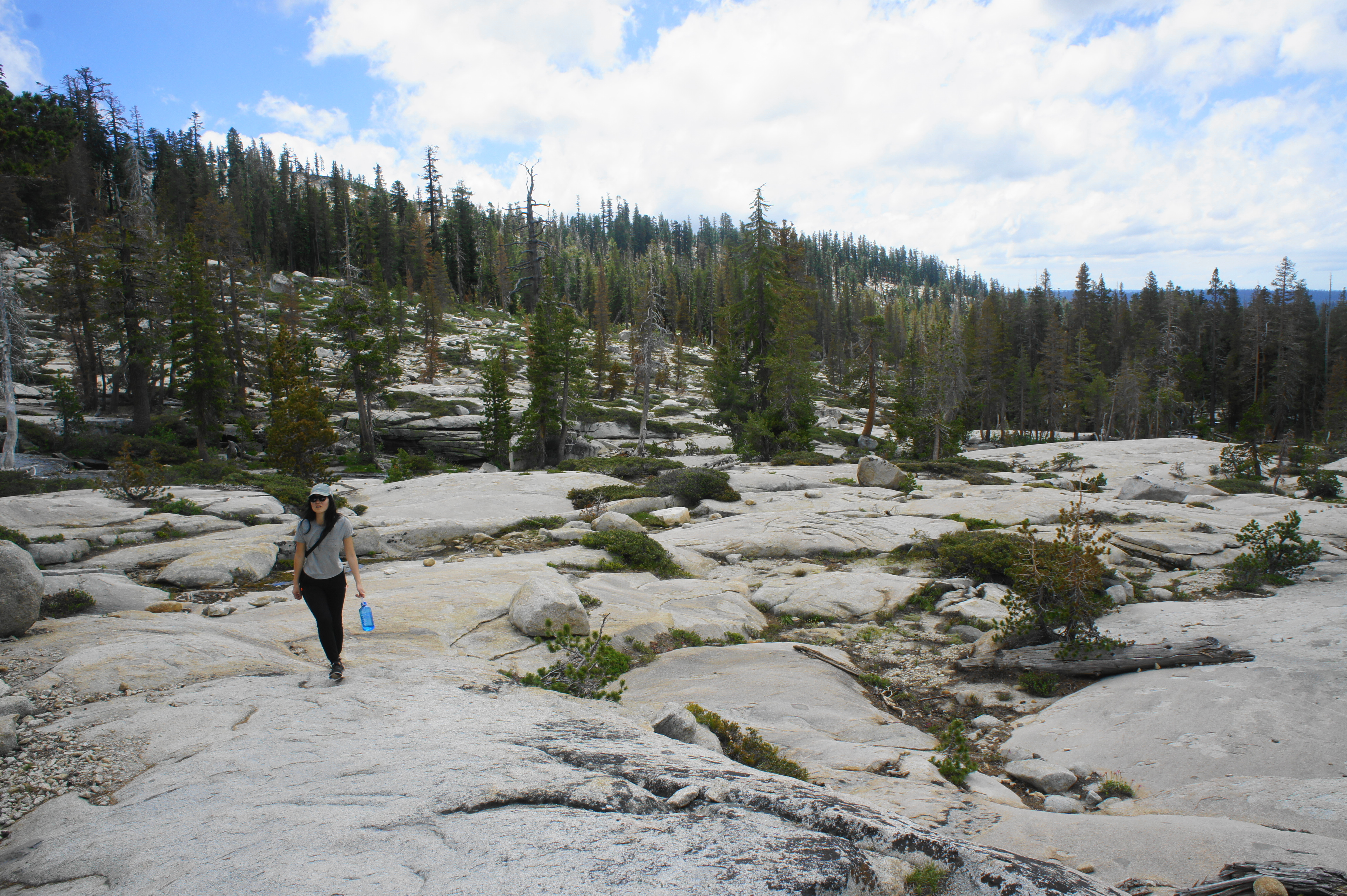From here the onward route rises to a vista overlooking a bowl of granite ahead, after which the trail drops to streamside again, traversing a coniferous moraine that includes meadows, marshes, and small pools from the seasonal snowmelt.