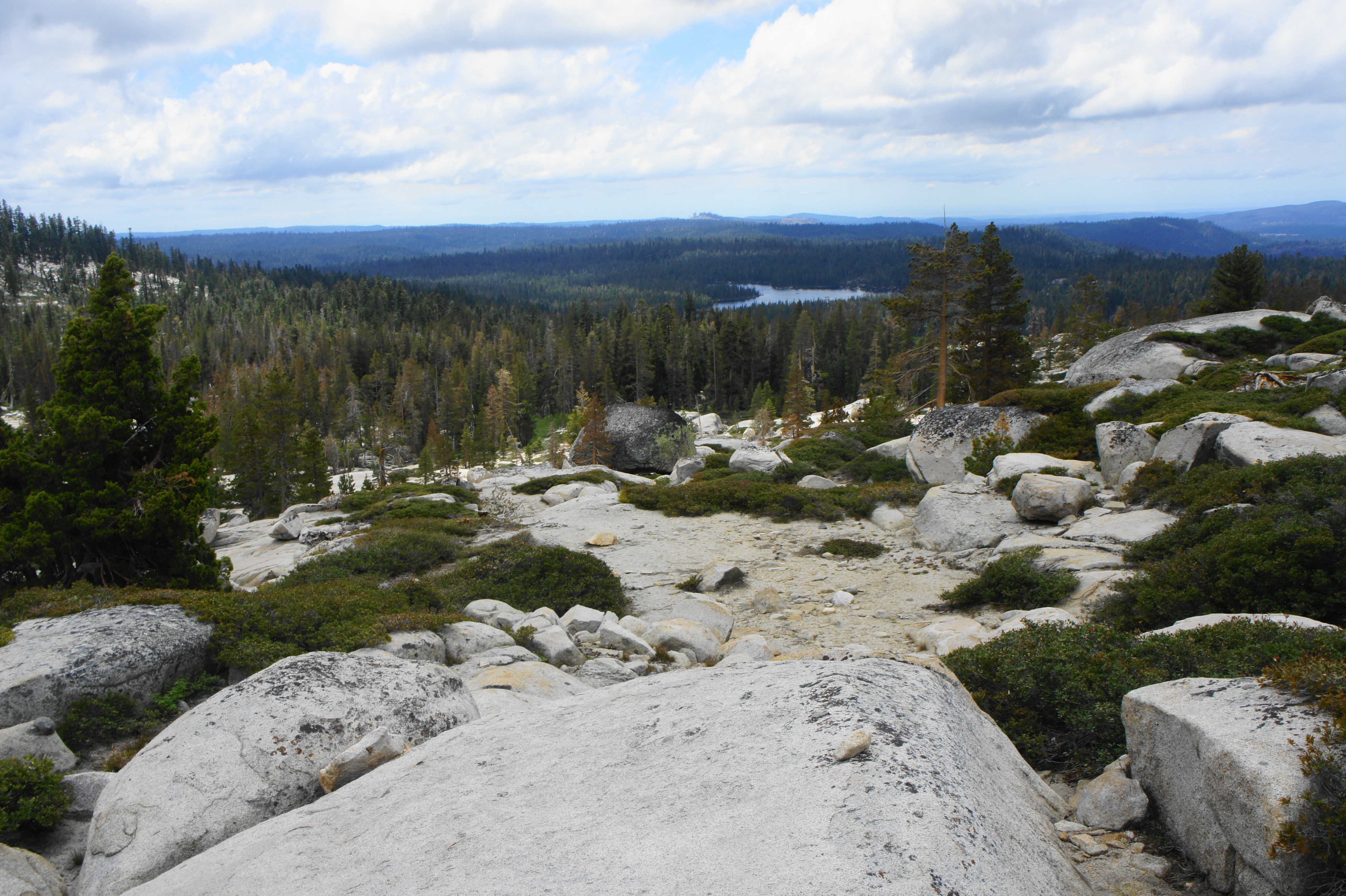 At about 1.8 miles, the hike reaches its first prominent views back over the moraine to Wrights Lake, with blankets of conifers and the Sierra foothills beyond. A nice overlook at around this point makes for a decent place to stop for lunch or a snack.