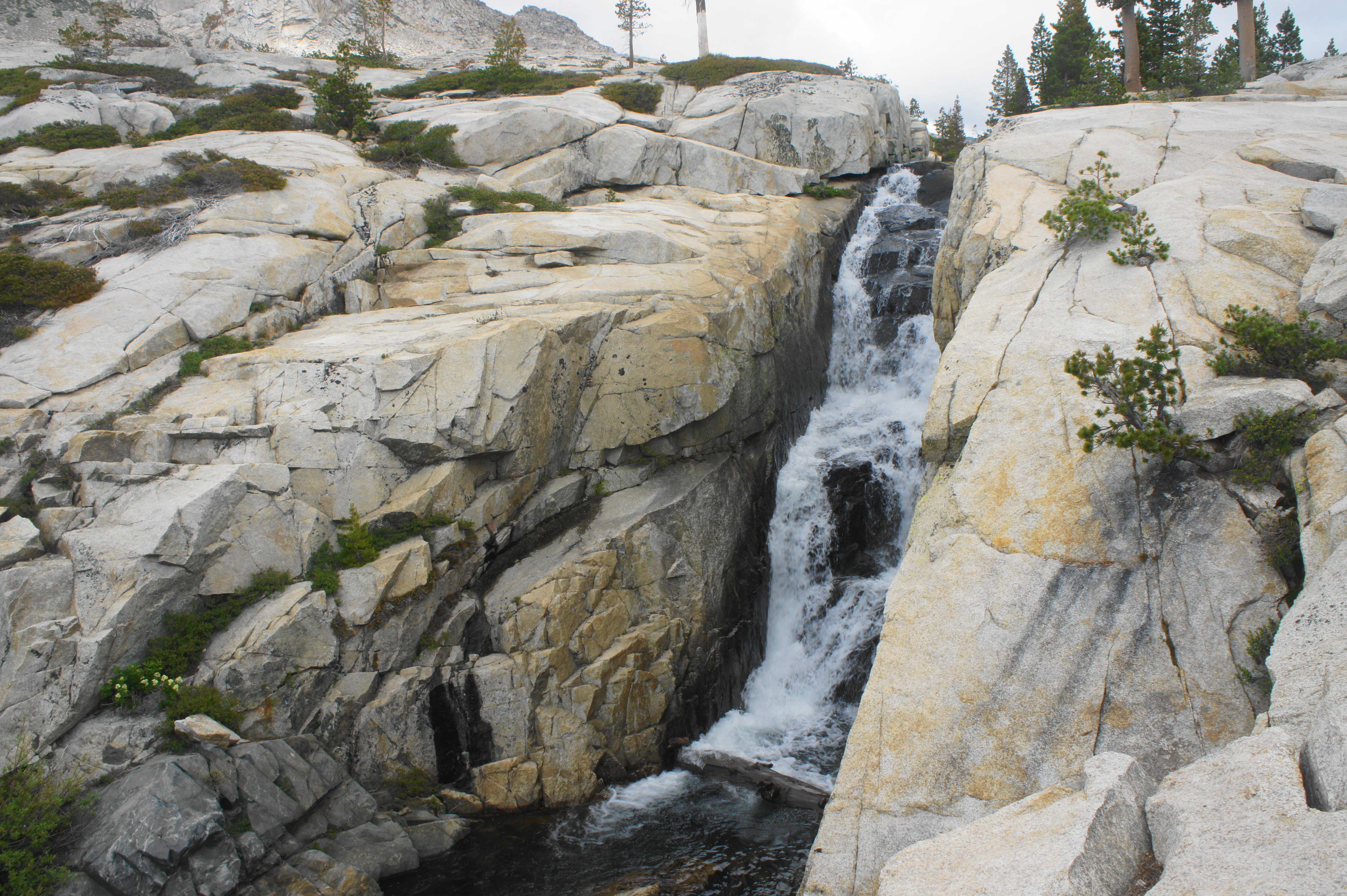 Beyond, the trail crests a ridgeline and then descends to another drainage, this one fed by Twin Lakes, which still remain out of view. After passing a roughly 10- to 12-foot cascade on the left, the trail rises to the edge of a narrow flume at about 2.4 miles, where the creek tumbles down a sharp waterfall wedged between granite slabs.