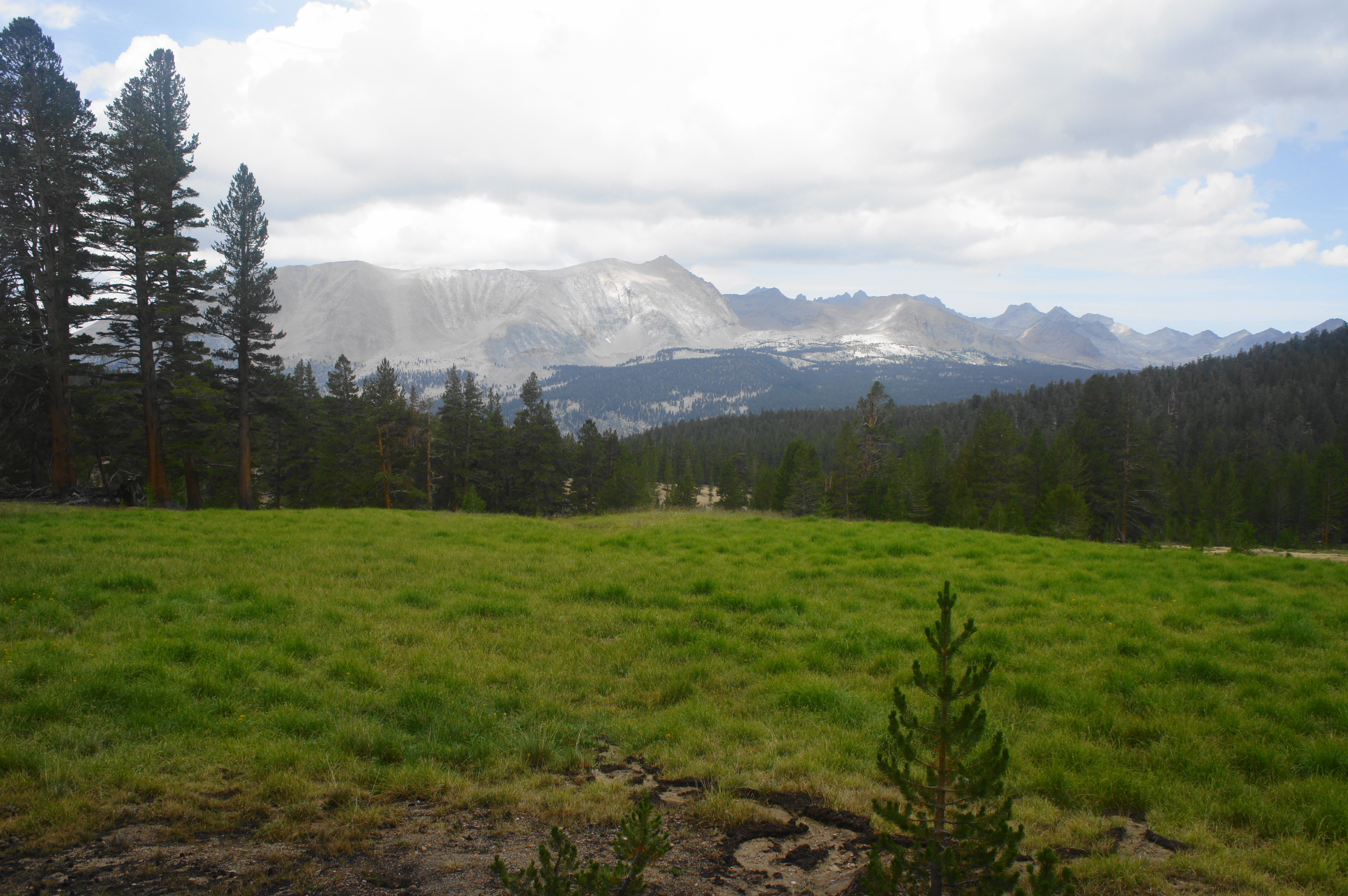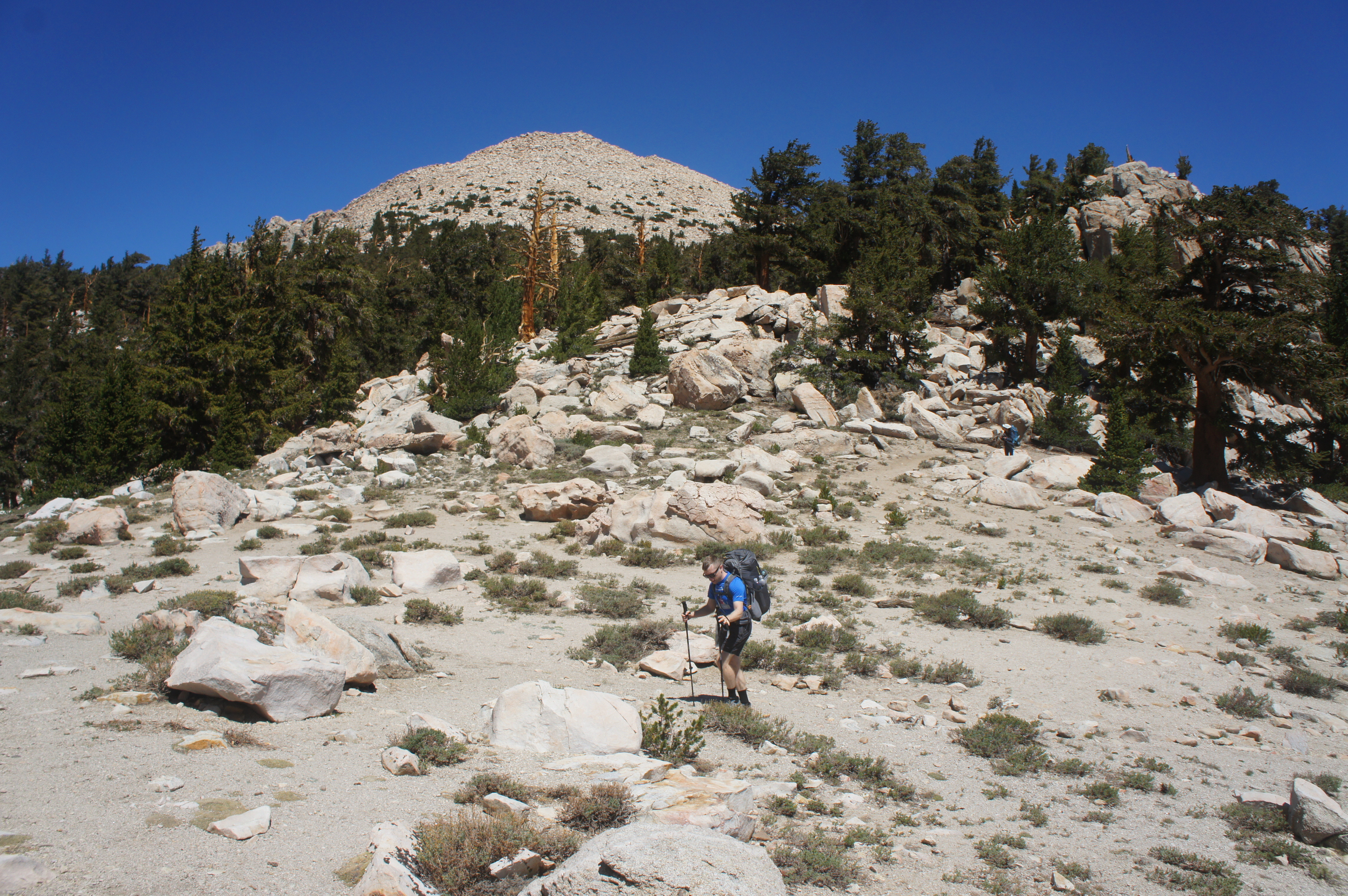 After visiting the lake, return to the PCT, cross the drainage (which may be dry), and begin a surprisingly difficult clamber, one of the steepest sections of the day. From here the rocky trail gains around 200 feet as it clears a ridgeline dotted with hearty foxtail pines and bird’s eye views of Chicken Spring Lake. On the other side of the ridge, hikers are greeted with an excellent look across the woody terrain of the Golden Trout Wilderness. The grassy patch to the southwest is Big Whitney Meadow, fed by Stokes Stringer Creek, which flows into Golden Trout Creek and eventually the South Fork of the Kern River. Beyond lies Johnson Peak (11,371’) and the Great Western Divide. Off to the south, hikers will eventually spot Olancha Peak (12,132’), a prominent summit that stands out as the highest peak in its immediate vicinity.