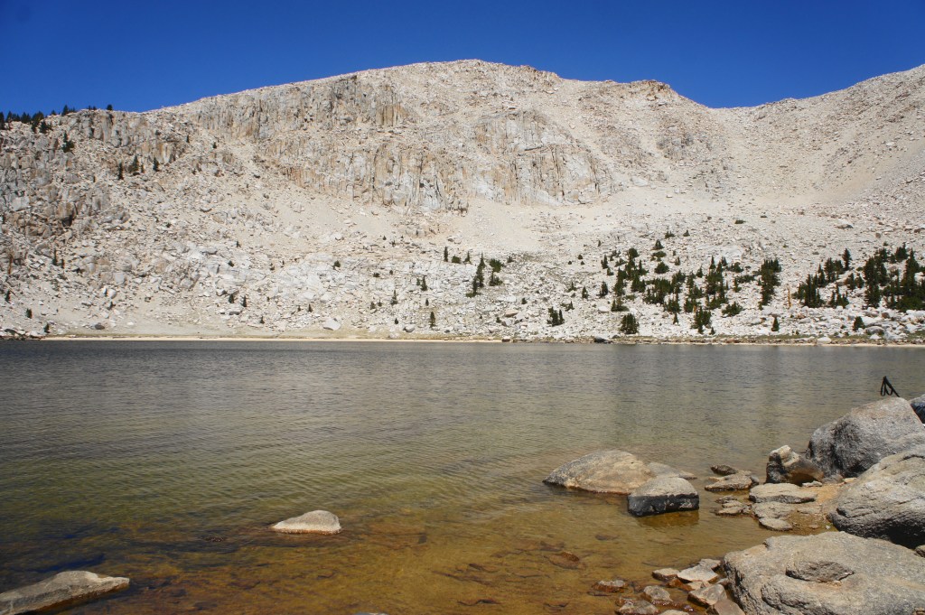 From Timberline Lake, the onward trail skirts the shoreline before rising to a densely wooded area with a nice campsite nestled up against a smooth granite wall on the right. After rising up above the timberline, the conifers are sparse and the granite boulders grow larger as the trail follows a wide depression between rocky slopes. The gently sloping path climbs to an open terrace that soon offers the first views of the entirely tree-less Guitar Lake, a very popular camping destination (especially for southbound JMT hikers heading to Whitney Portal). Coming in from the north, a nicely-flowing stream—which drains Arctic Lake, some 800 feet above—offers perhaps the last opportunity to fill up with water before the dry and desolate climb beyond.