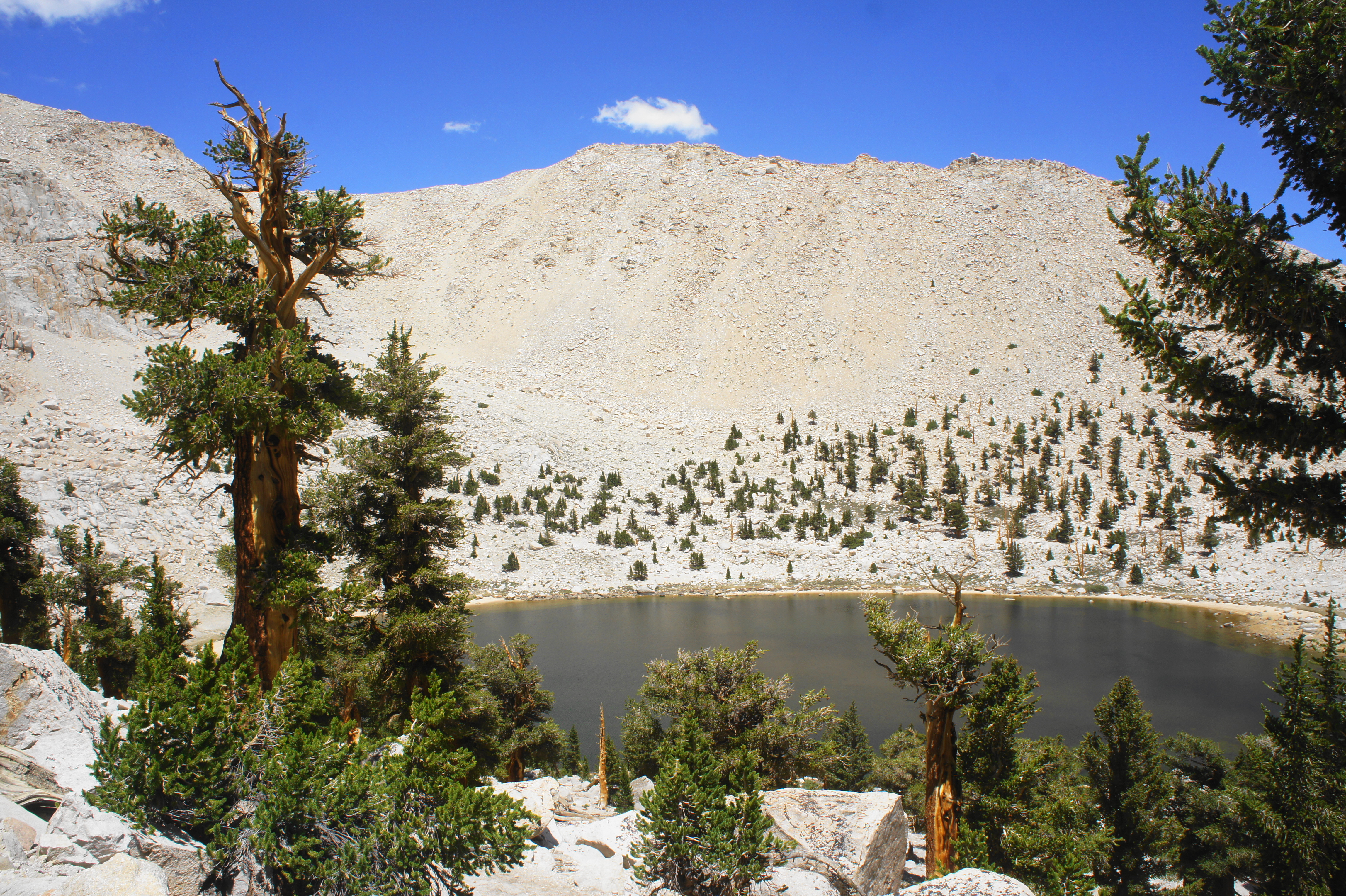 After traversing Bighorn Plateau, the JMT begins a steady descent into the Tyndall Creek watershed, beginning amid the foxtail pines before dropping back to the dry lodgepole forest. At a point a little over eight miles from Crabtree, the trail passes a camping area at the Tyndall Frog Ponds, a modest sight but less crowded than the area around Tyndall Creek below.
