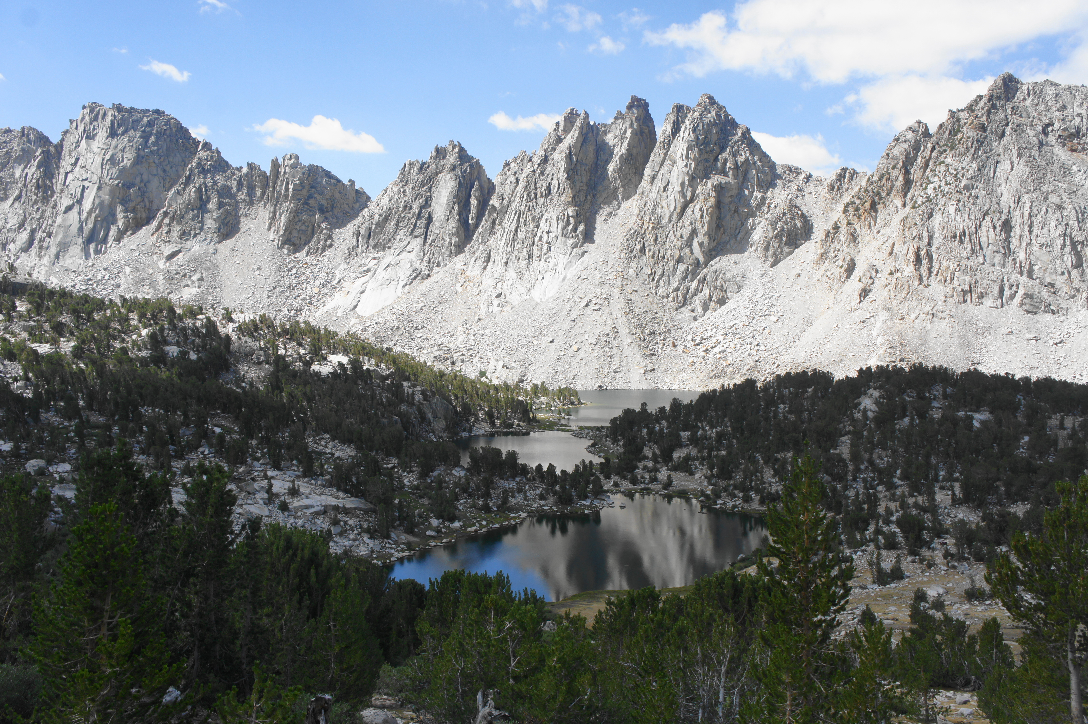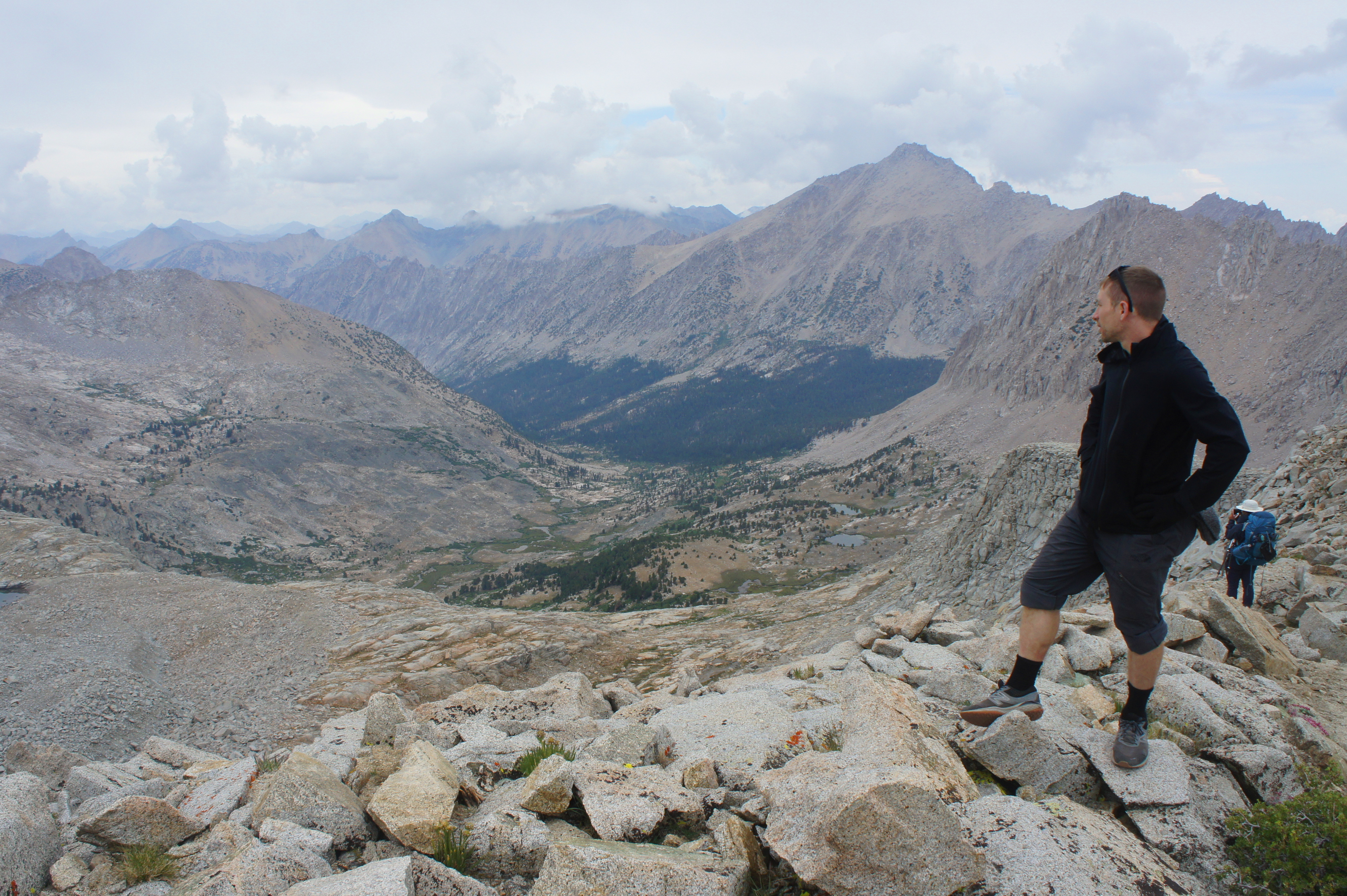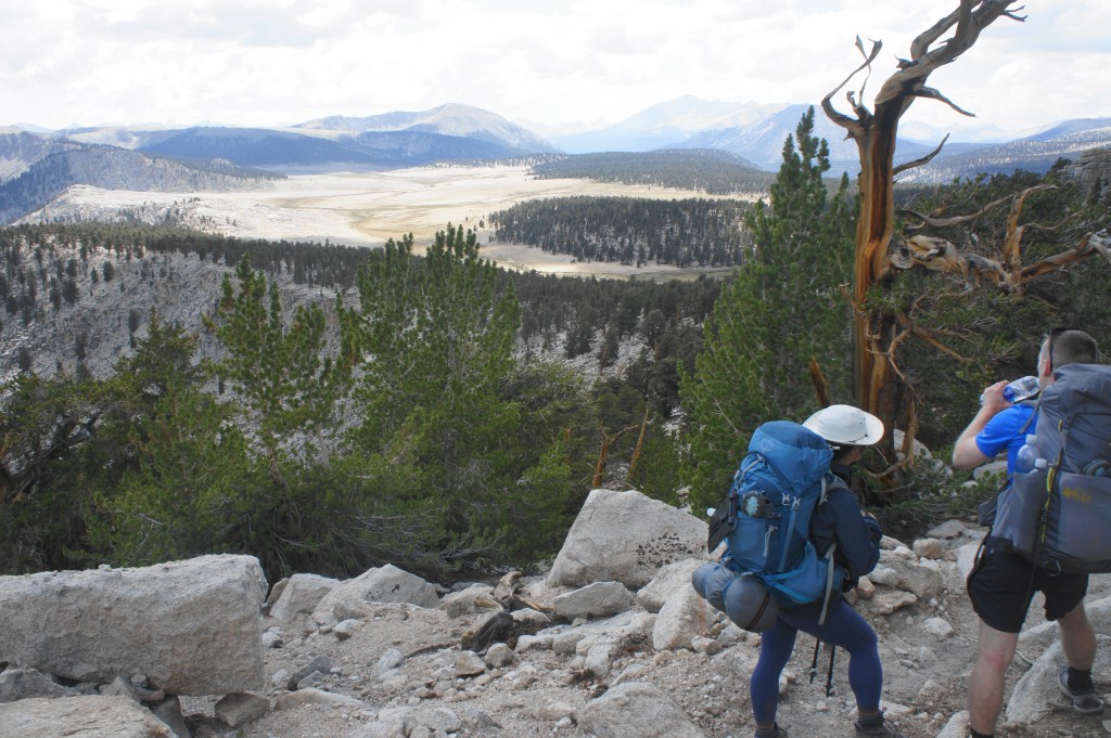 The views northward from the pass are simply spectacular, the first look into Kings Canyon National Park, where hikers will spend the next several days of the onward journey. Ahead to the north is a series of towering ridgelines, beginning with a jagged spine culminating in Center Peak (12,760’), followed beyond by the Sierra Crest, headlined by University Peak (13,632’), Mount Bradley (13,289’), and the Kearsarge Pinnacles. In the distance, hikers can preview some of the landscape of Leg 2 of the journey—including the area around Glen Pass and Pinchot Pass in Kings Canyon.