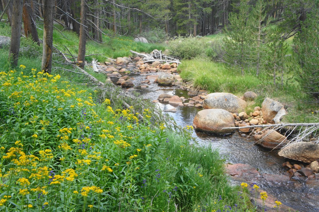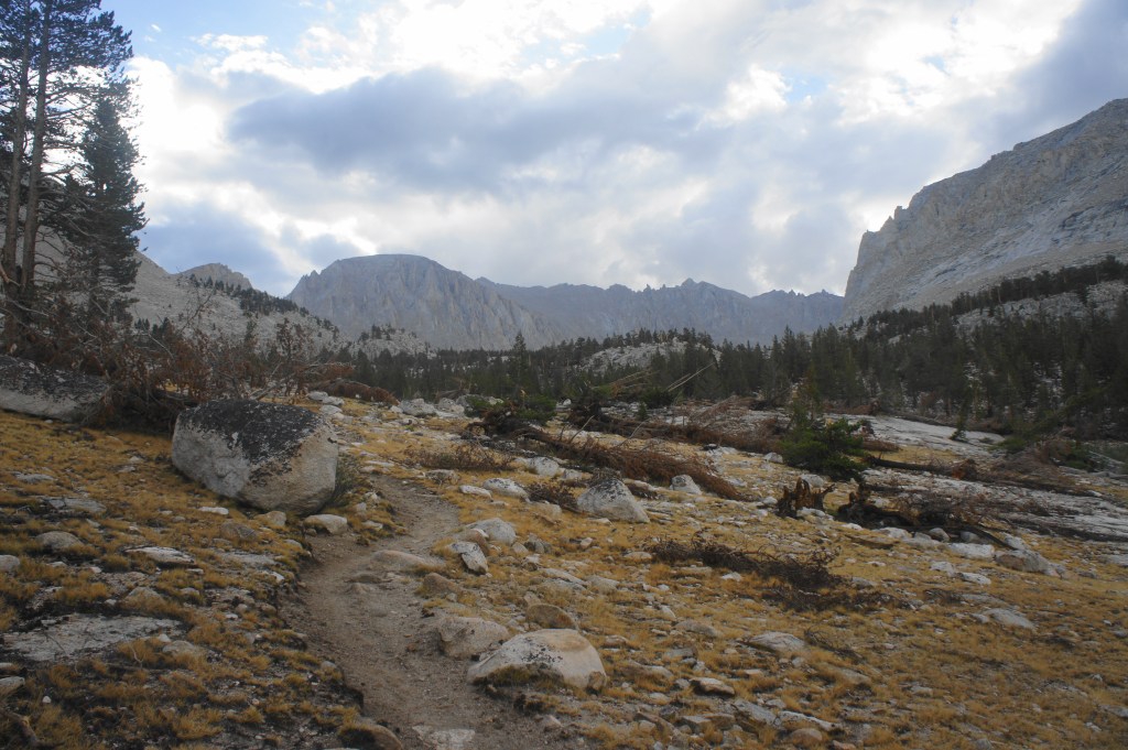 Tyndall Creek acts a staging ground for northbound JMT hikers preparing for the climb up and over Forester Pass (13,160’), the highest mountain pass encountered on the entire hike. From the main camping area along the west bank of the tumbling stream, the JMT continues northward, bounding around a lovely restoration area (no camping) and then skirts the edge of a lodgepole pine forest. It’s a short walk to the edge of a broad clearing and junction with the Lake South America Trail, which veers off to the left.