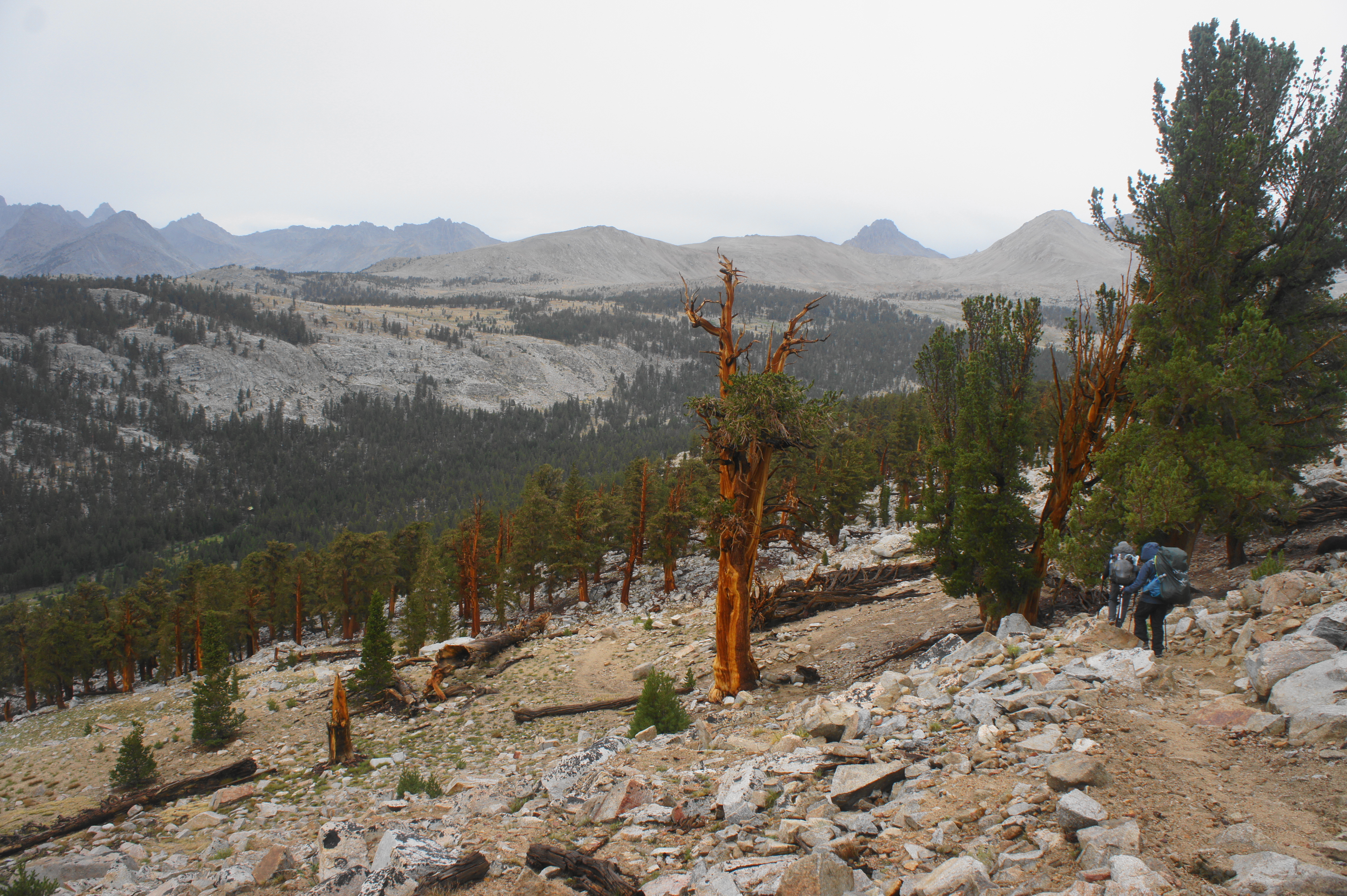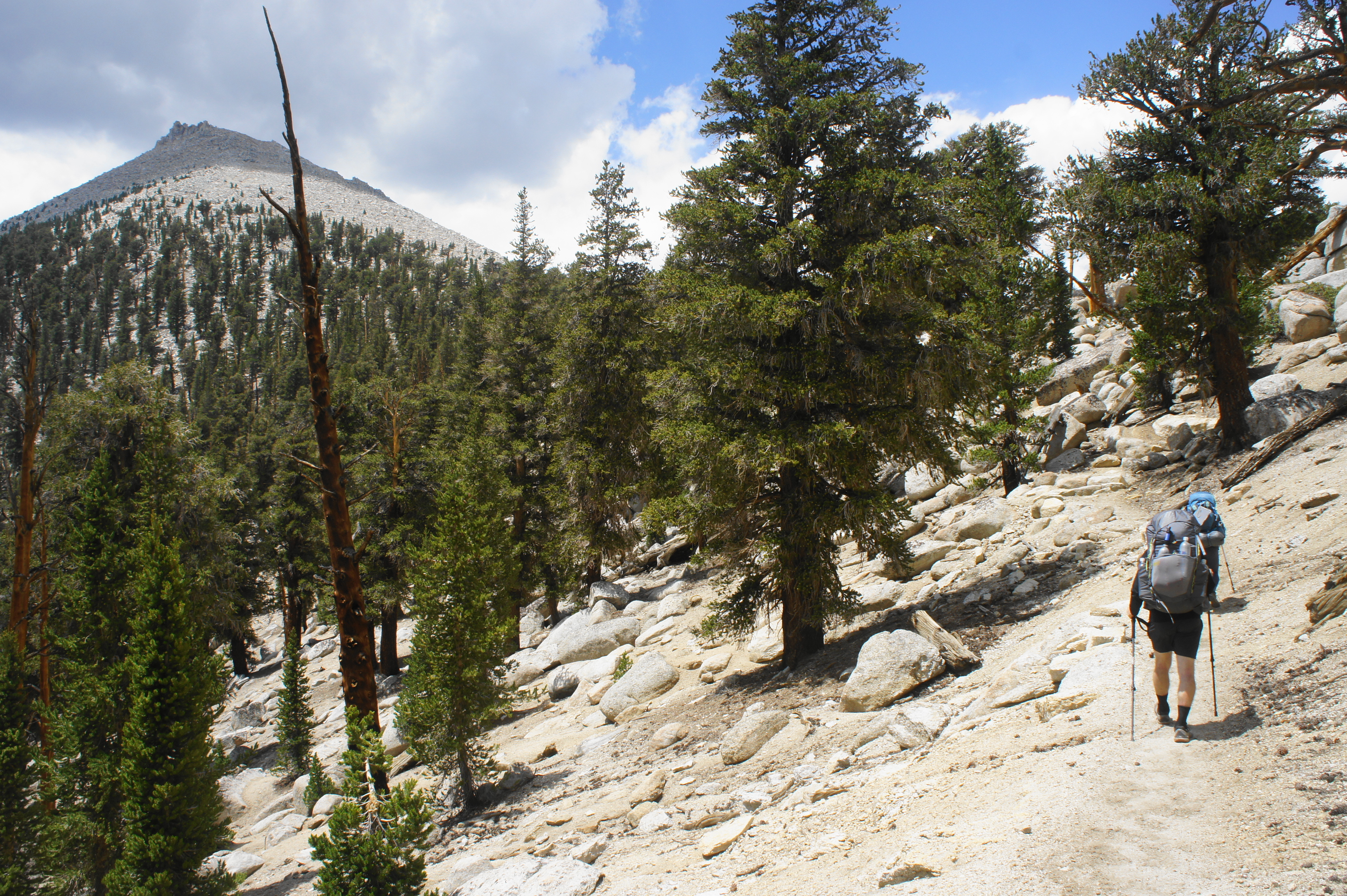 From here the JMT crosses three more drainages and then climbs mildly to a shady pass just shy of 11,000 feet, a bit of a teaser climb for the much longer ascent to come. As the trail crests the saddle and descends into the vast Wallace Creek watershed, sporadic views extend as far as Tawny Point (12,332’), Mount Tyndall (14,018’), and Junction Peak (13,888’) to the north.