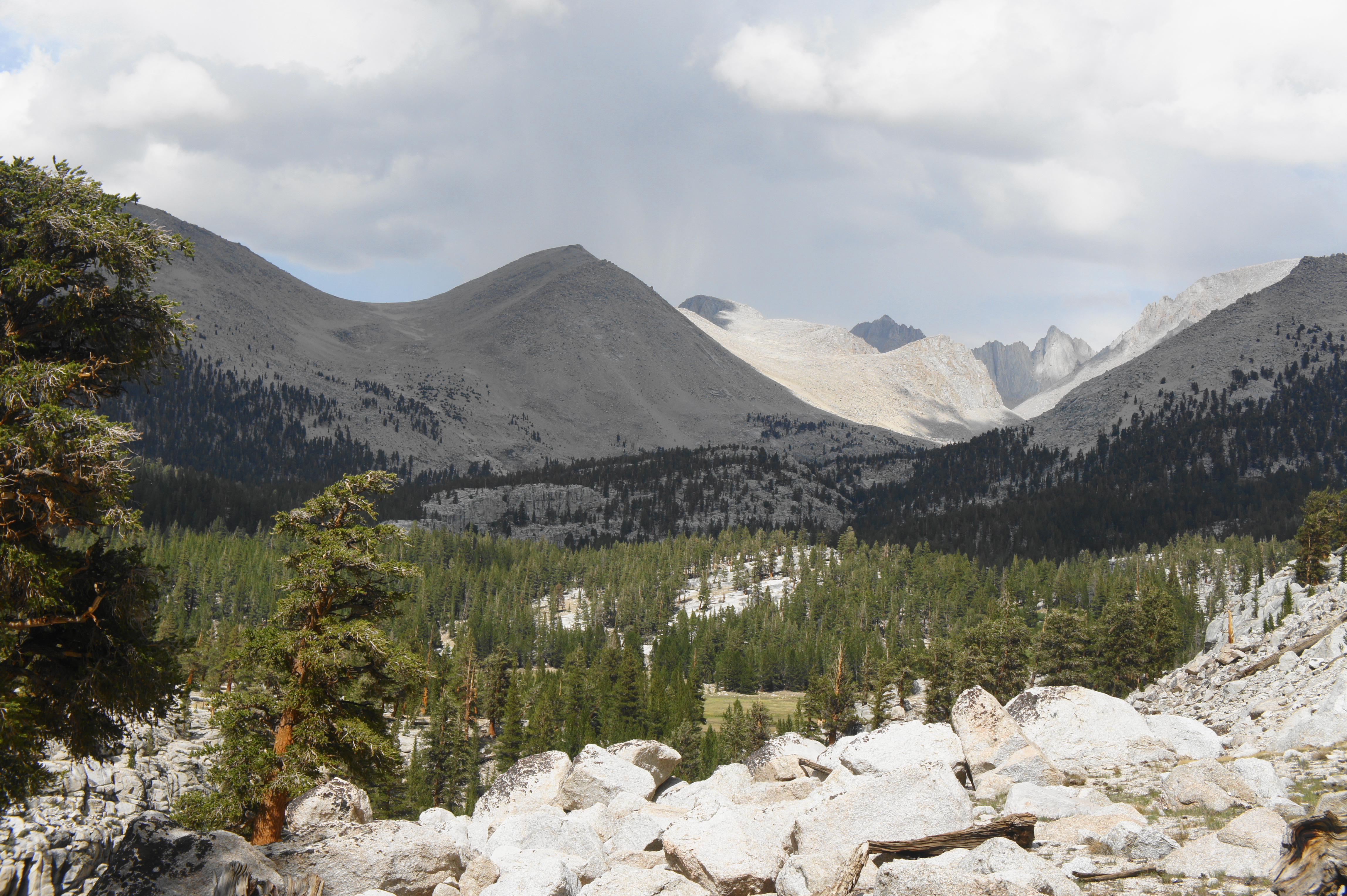 Trip Report: Beginning about a mile back on the PCT from the Rock Creek crossing, we covered the short trip to Crabtree on Day 2 of our journey. The climb out of the Rock Creek drainage to Guyot Pass was challenging, with steady gain but few switchbacks, but the rest of the day was relatively mild, with the sun finally coming out briefly as we reached Lower Crabtree Meadow. But, being late July, we were in the middle of a powerful monsoon season, and storm clouds threatened as we reached the main camping area at Crabtree in the mid-afternoon. A nasty thunderstorm had us scrambling for our tents, where we spent an hour and a half waiting out the rain and lightning. After moving our tents out of deep puddles, we got some better weather in the evening, enough to cook dinner and prepare for the next day—a 15-day hike to Mount Whitney—which would be our toughest day yet.