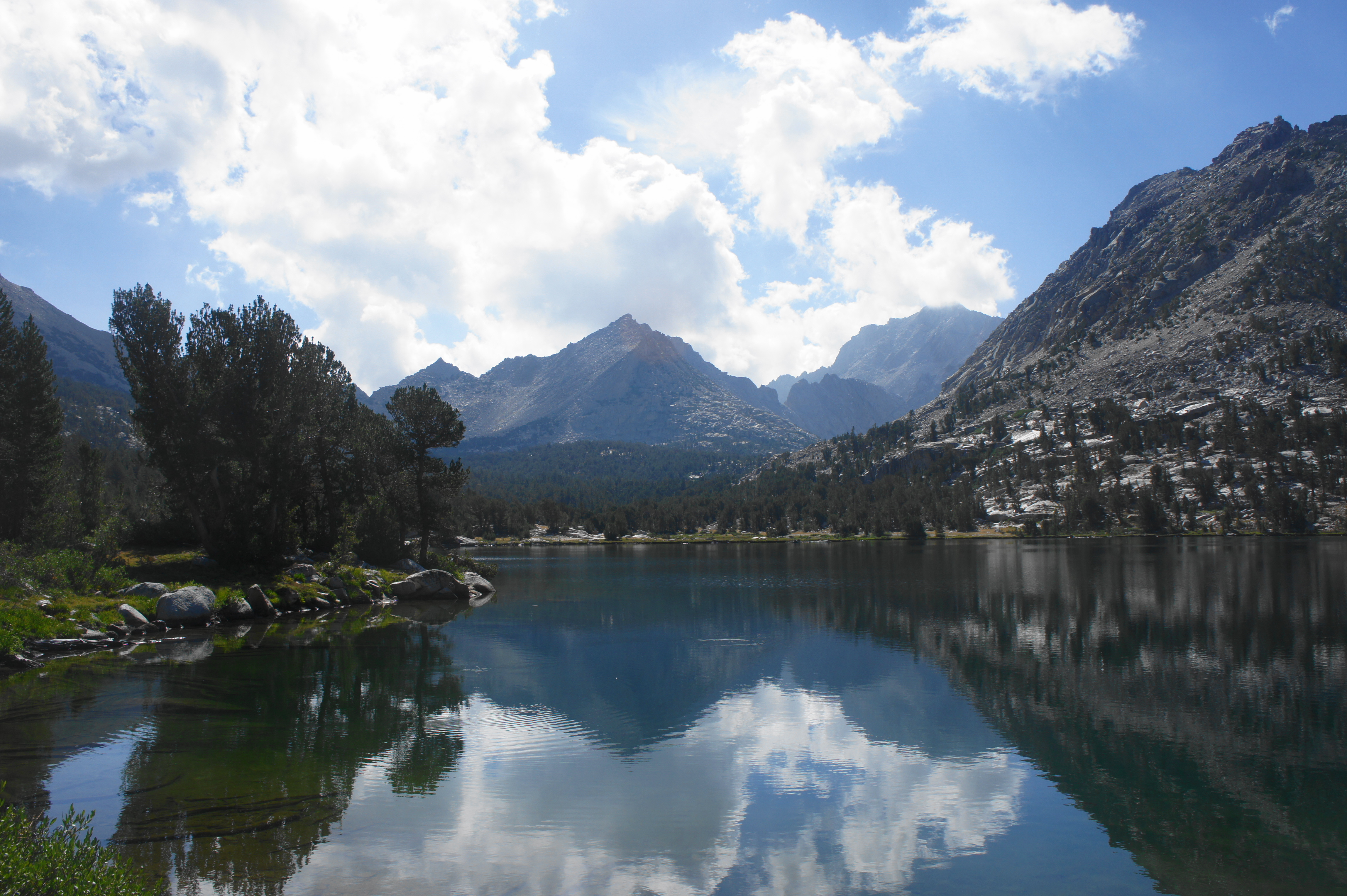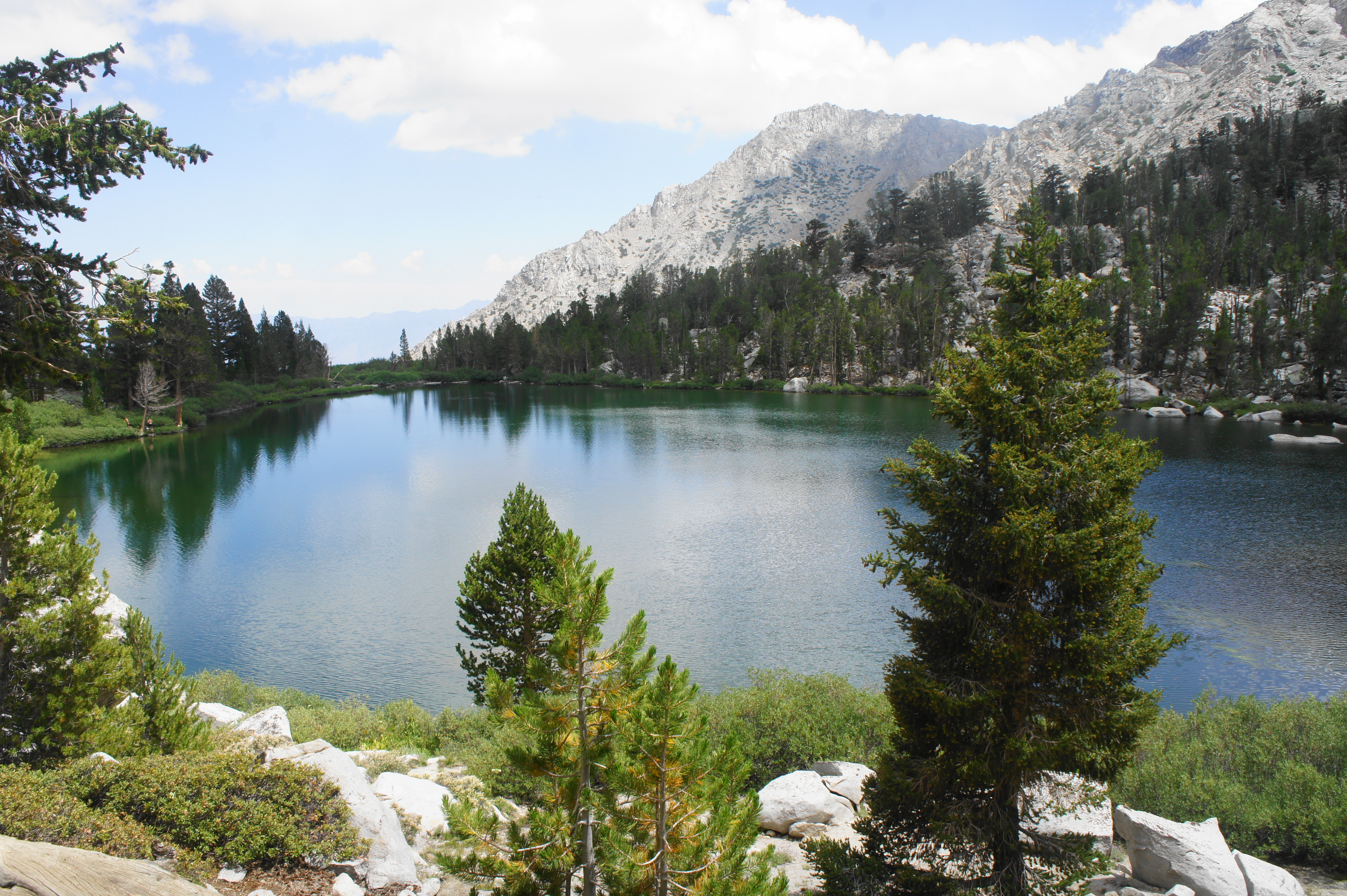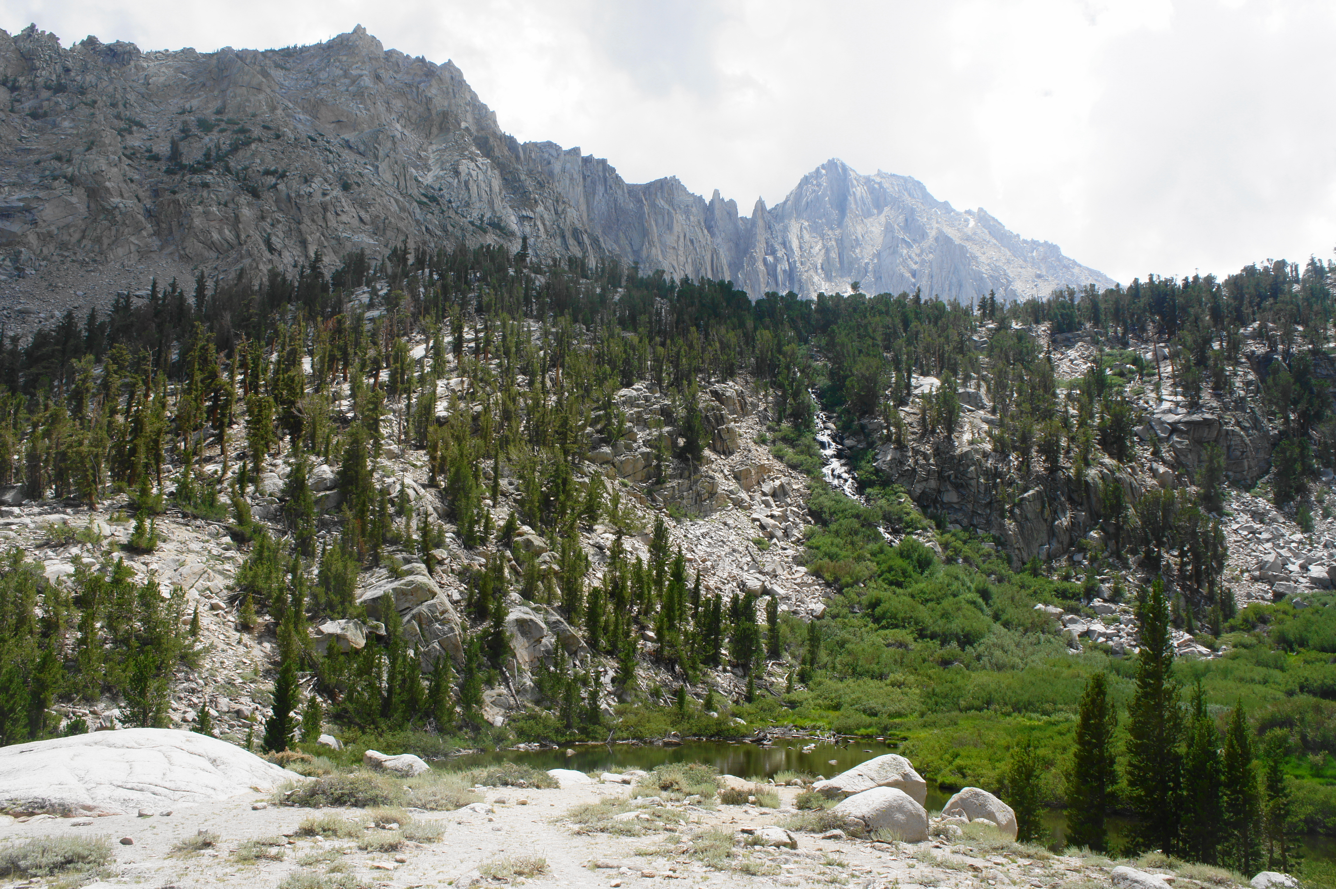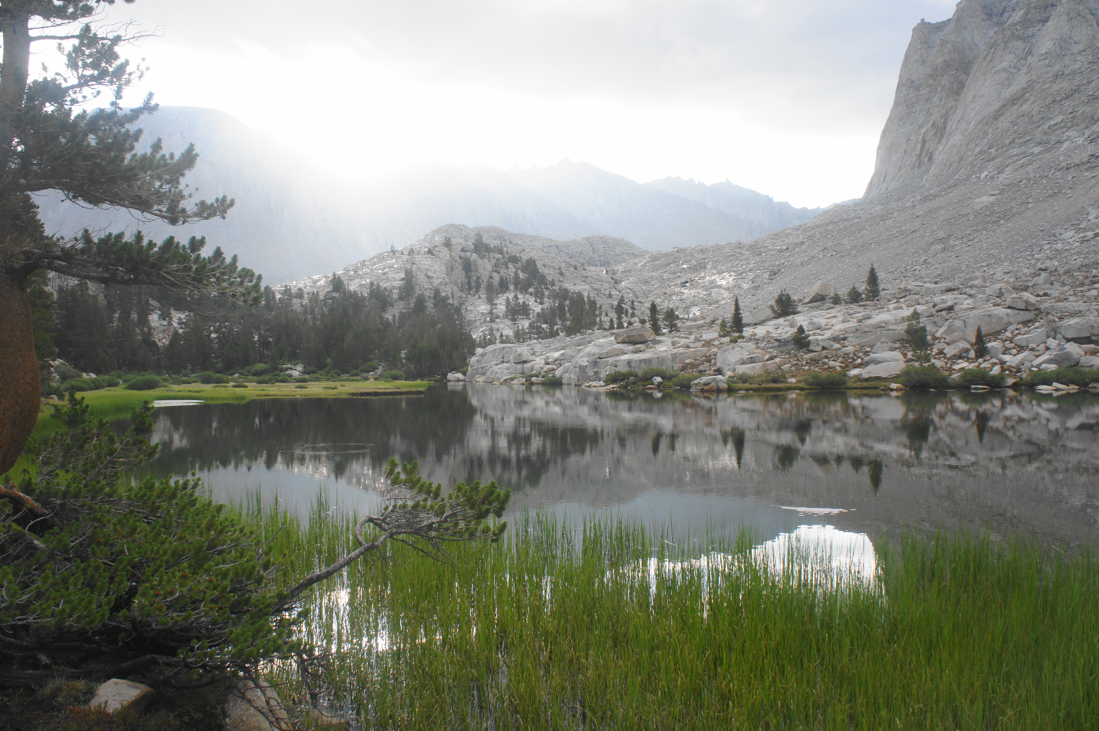 Next, the trail rises to mount a granite shelf, overlooking a narrow gorge carved by Whitney Creek. The rushing waters soon give way to a quiet, marshy area and the serene Timberline Lake, where camping is prohibited but the morning reflection of the Whitney ridgeline is spectacular. This is a lovely spot and the last lake in the subalpine ecosystem before the JMT moves up beyond tree-line.