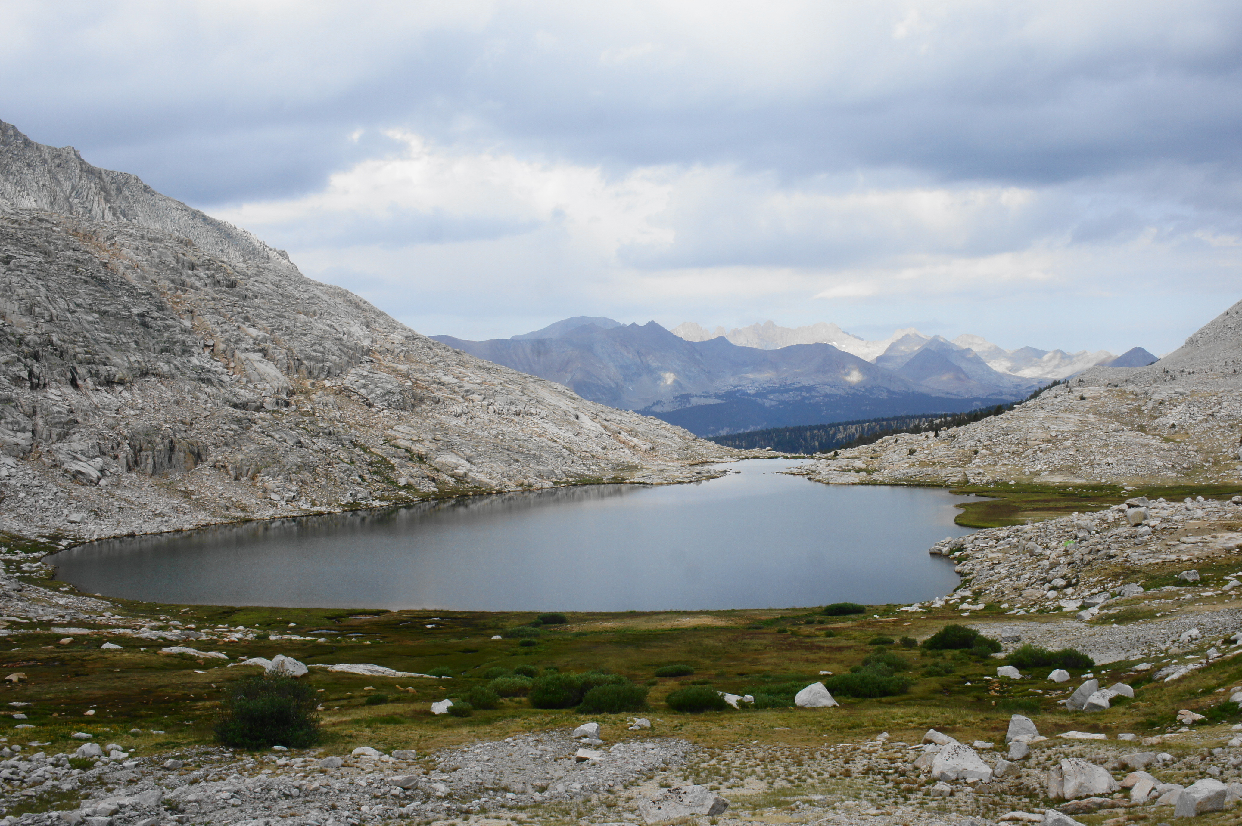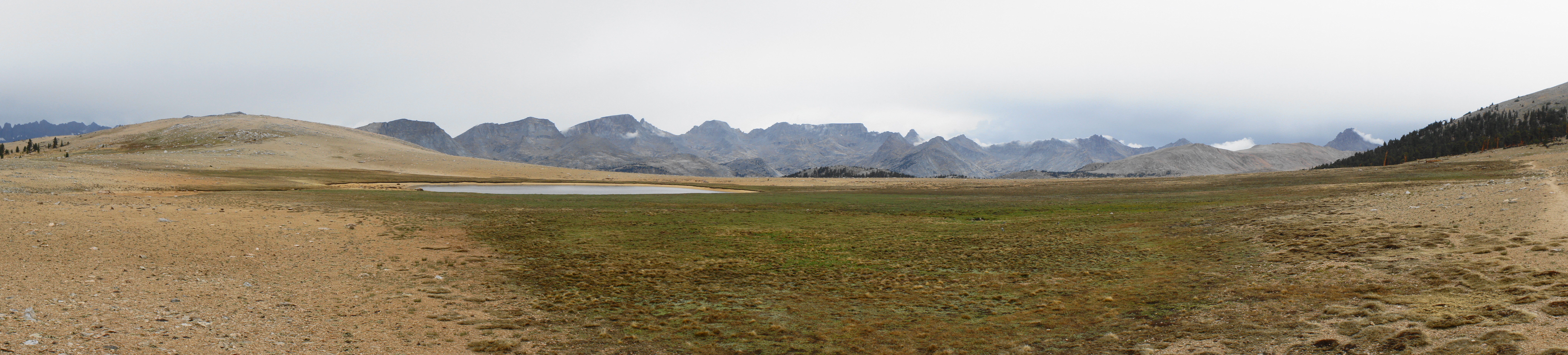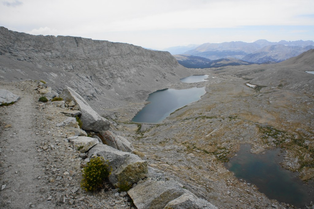 The next half-mile stretch is one of the most scenic of the entire JMT: the high altitude and barren landscape of Bighorn Plateau allows for sweeping vistas in nearly all directions, with the Great Western Divide unfolding to the north and west and Mount Whitney behind to the south. A shallow and serene pool gathers water off to the left; this is a popular spot for camping – but the exposed flat would not be great in the event of lightning.