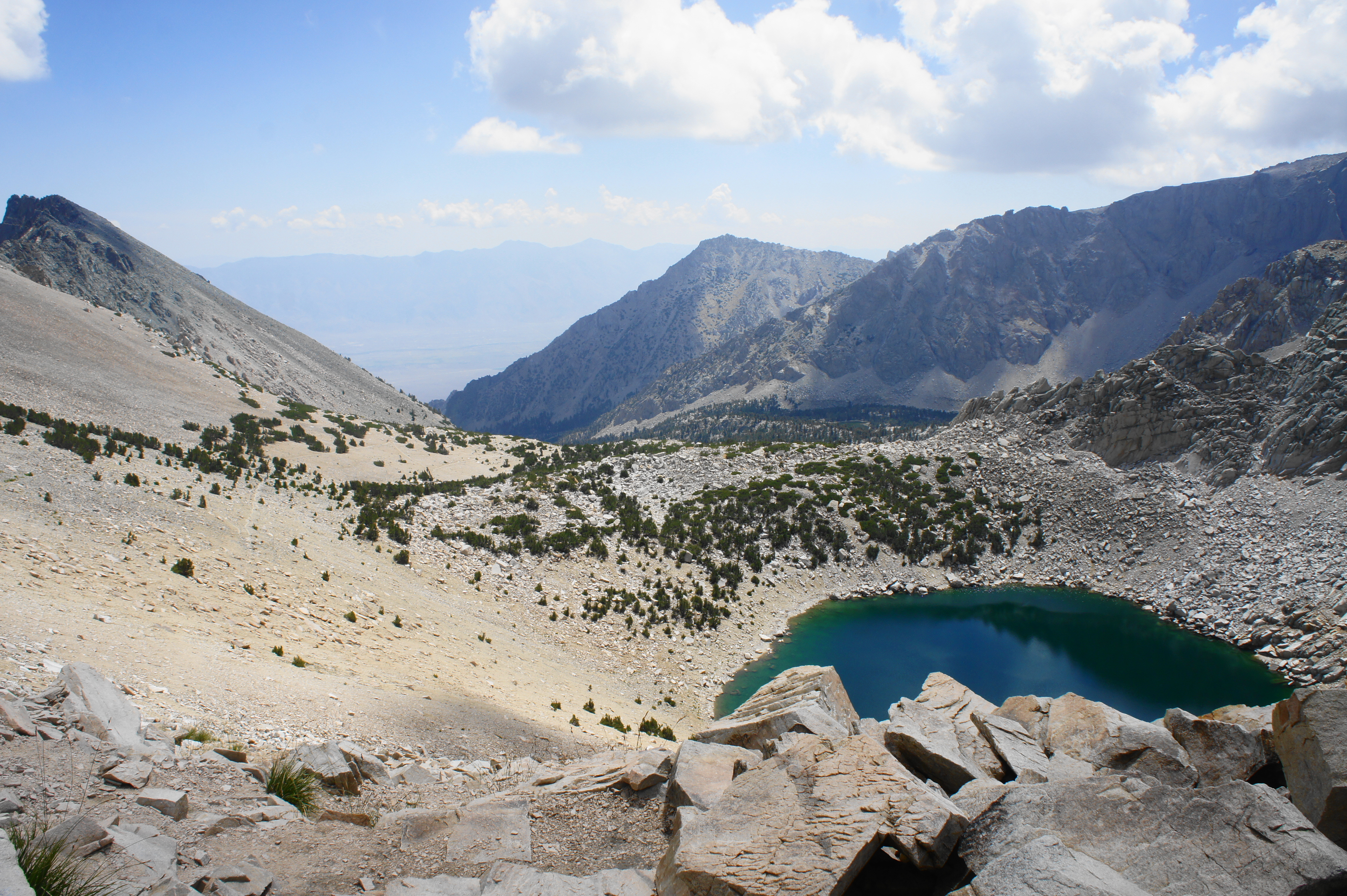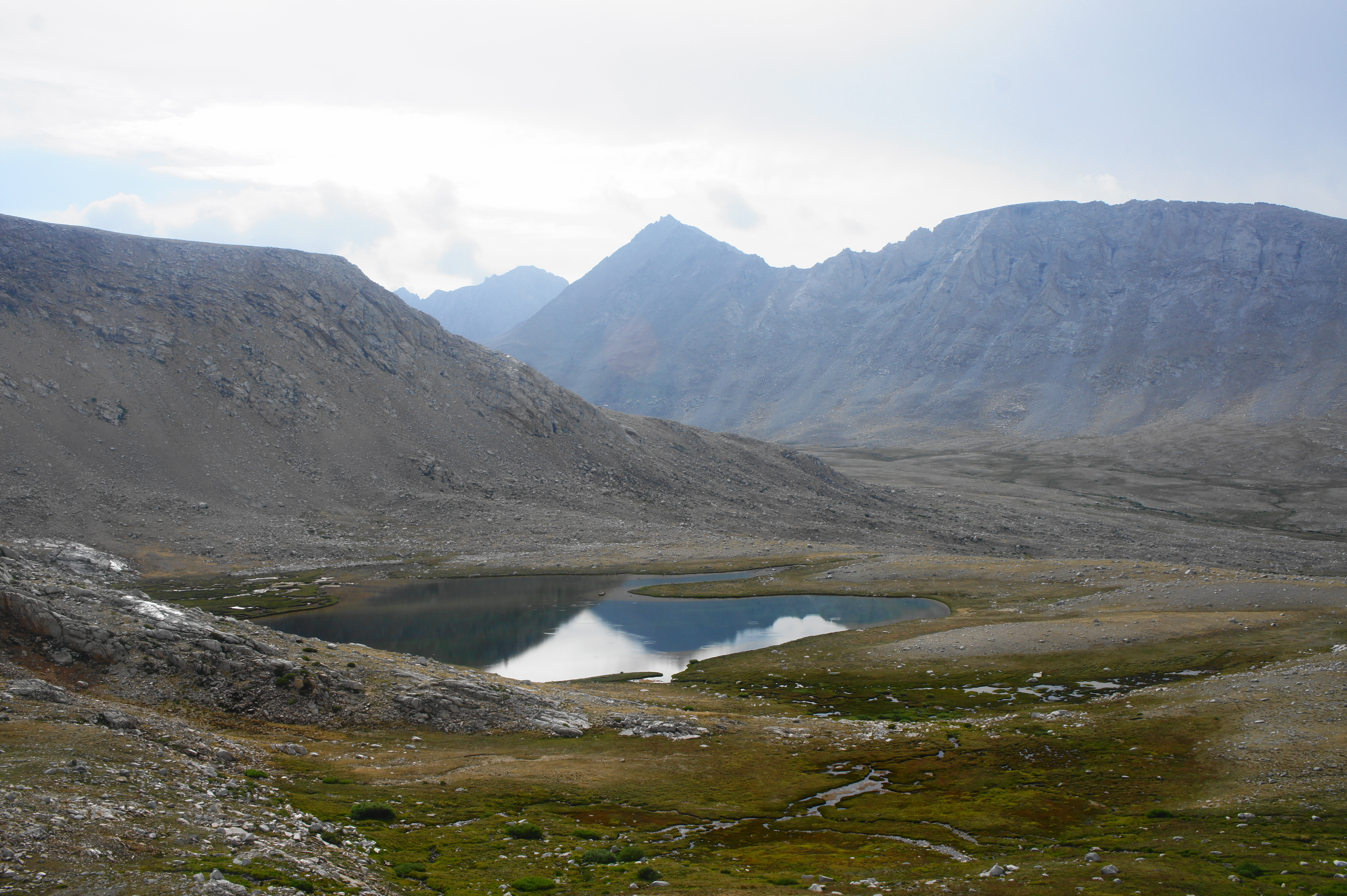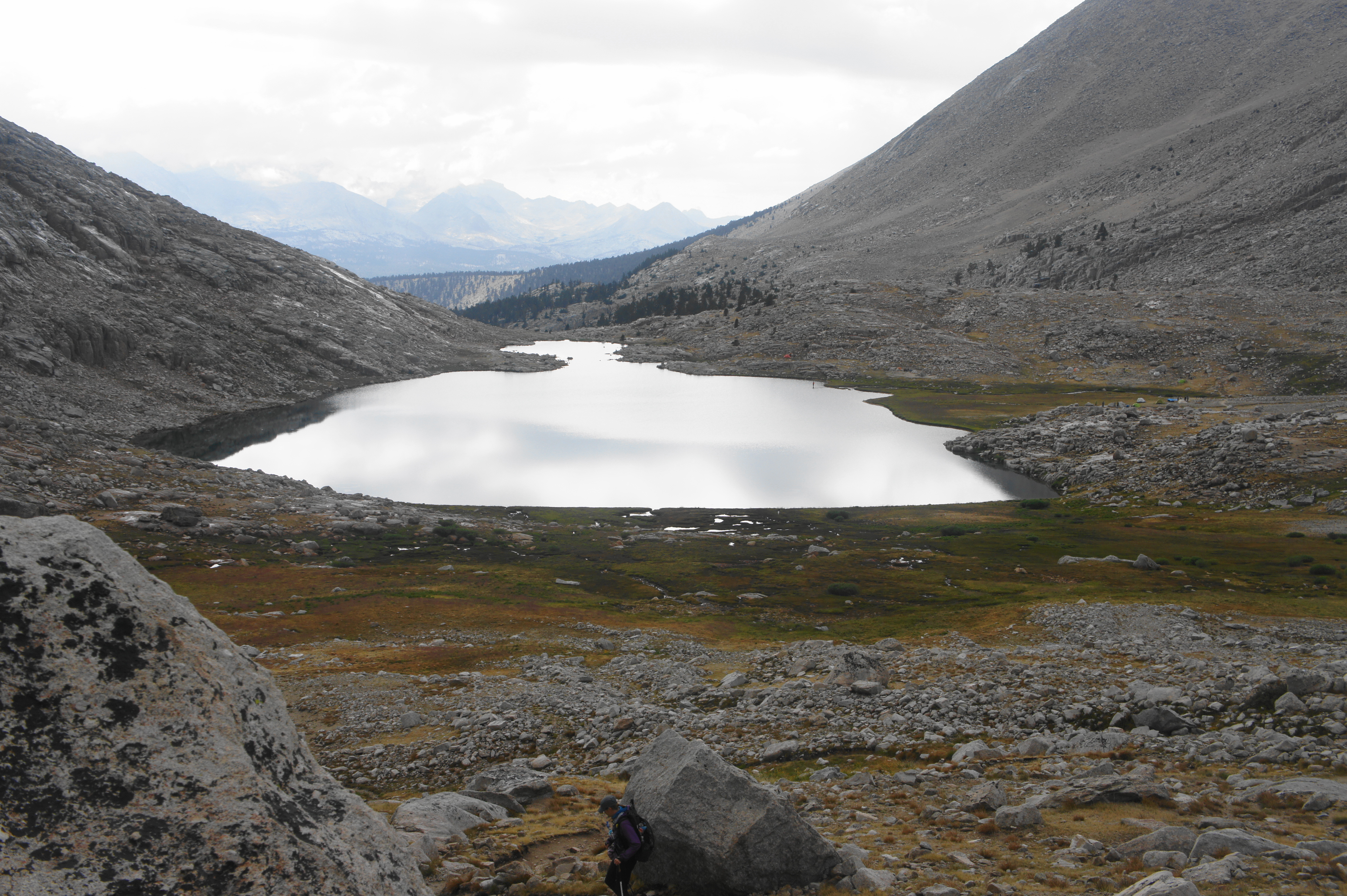 The next half-mile stretch is one of the most scenic of the entire JMT: the high altitude and barren landscape of Bighorn Plateau allows for sweeping vistas in nearly all directions, with the Great Western Divide unfolding to the north and west and Mount Whitney behind to the south. A shallow and serene pool gathers water off to the left; this is a popular spot for camping – but the exposed flat would not be great in the event of lightning.