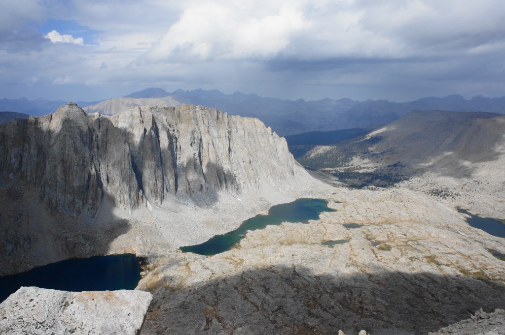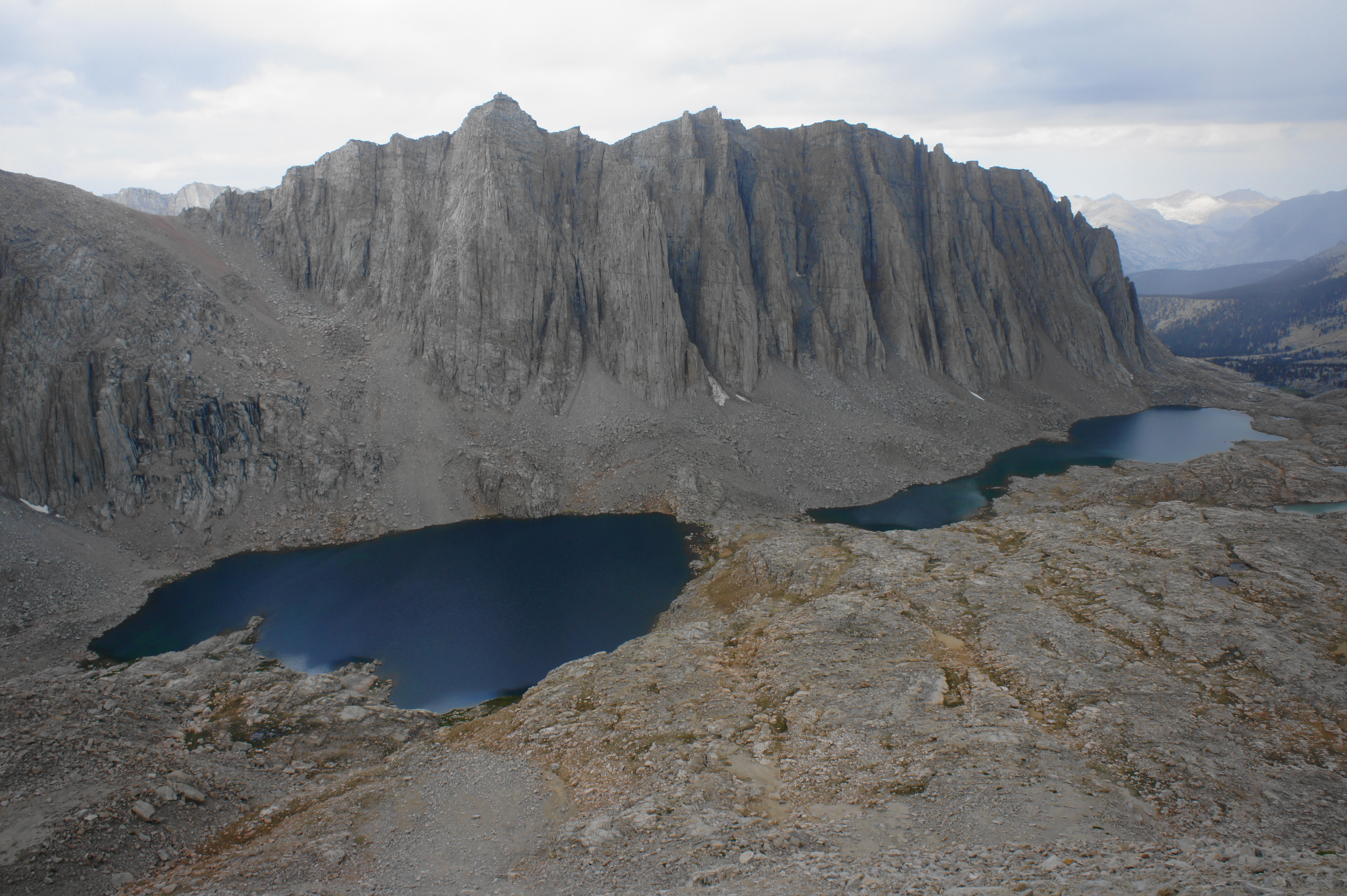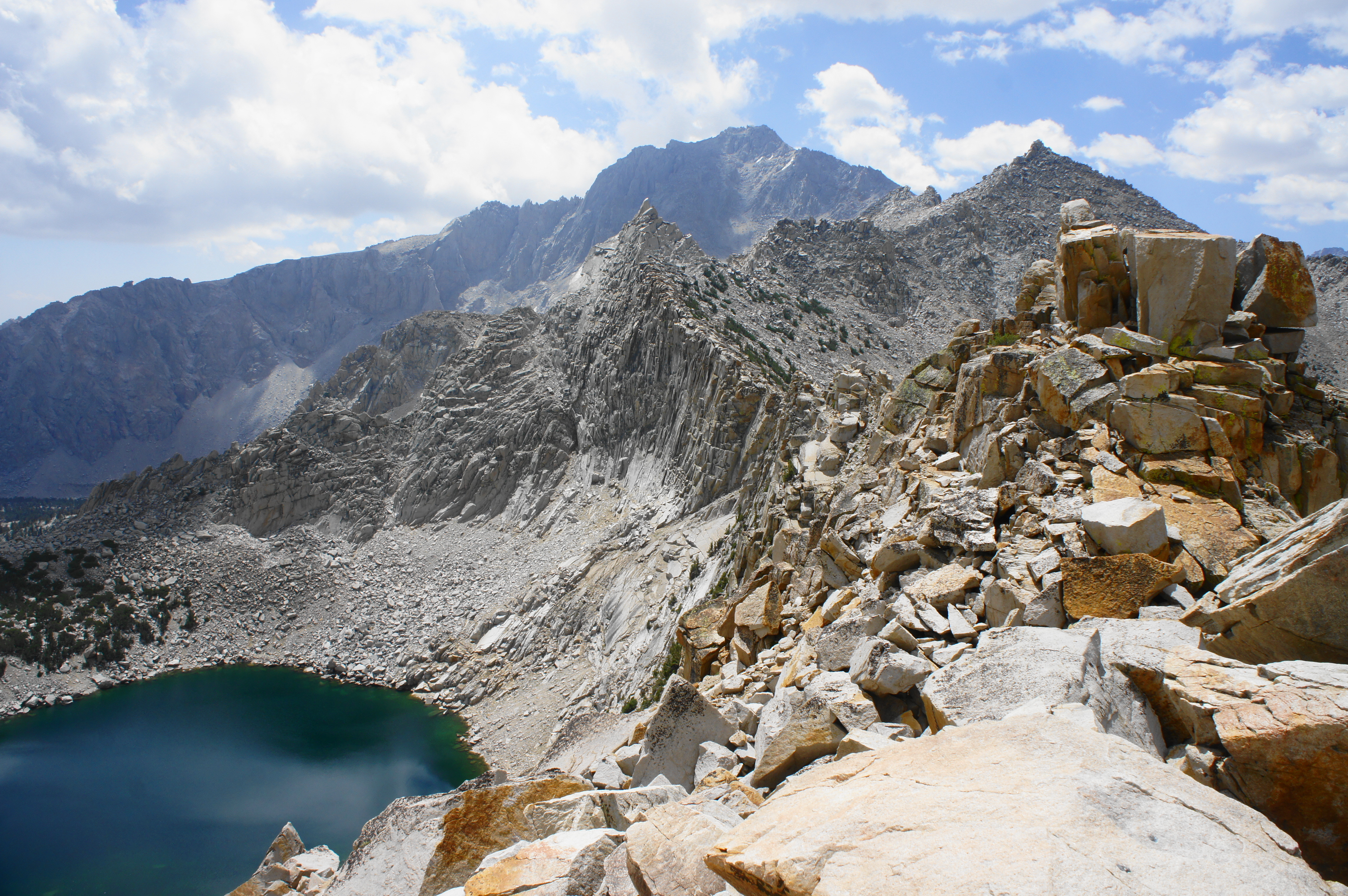 Having mounted the Sierra Crest for the first time since Mount Whitney, one can also see eastward down to Owens Valley. The turquoise pool directly below is Big Pothole Lake, the first in a series of watering holes peppered along the basin between here and Onion Valley. The impressive promontory to the south is University Peak, which overlooks both the Bubbs Creek area and Owens Valley.