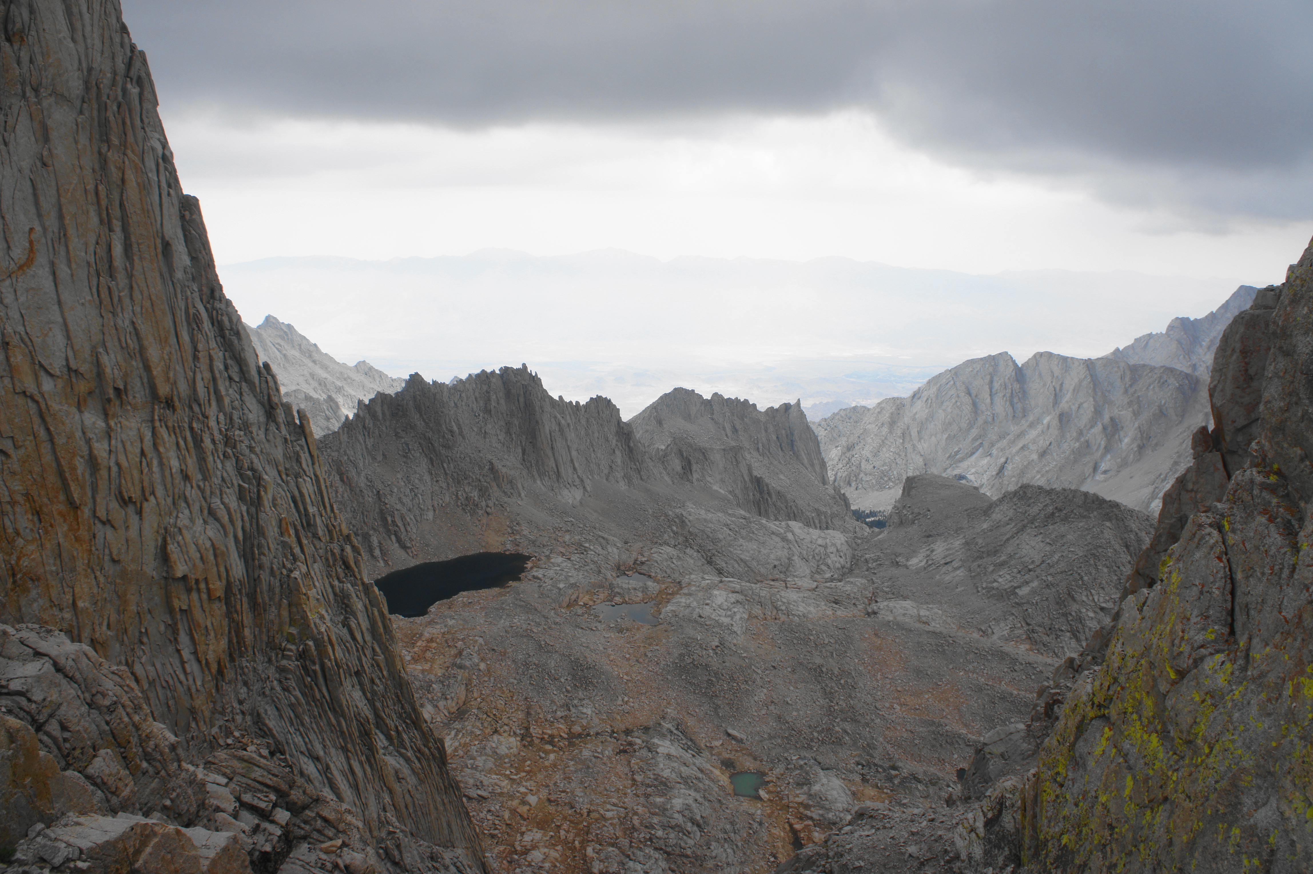 After cresting a cleft between the main ridge and a jagged clutch of spires, the trail actually descends for a short while, reaching a set of window-like notches with precipitous drops down to the east. At many of these windows, hikers get a view down toward Owens Valley and Lone Pine, with a barren landscape resembling Mordor in between.