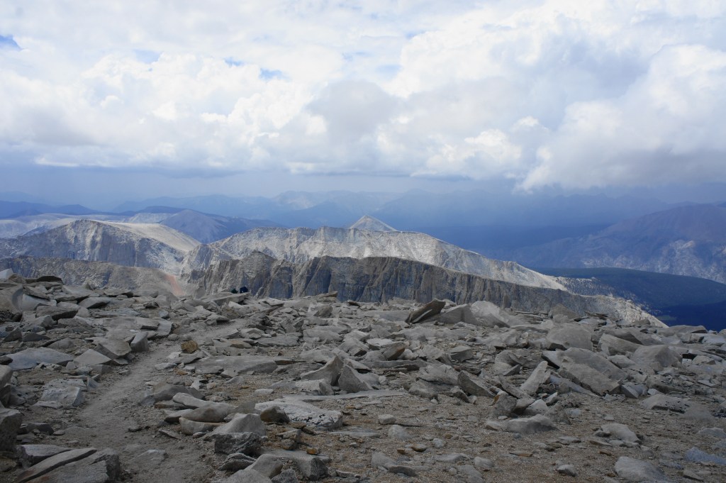 If the weather holds, the vistas from Mount Whitney are aplenty. To the east lies Owens Valley and the Inyo Mountains, with the various forks of Lone Pine Creek immediately below. The view south is even better, with clean views of Mount Langley, Mount Mallory (13,850’), and other high peaks, with Owens Lake (dry) and even the Death Valley area visible beyond. To the southwest lies Hitchcock Lakes and Crabtree, as well as much of the terrain covered in previous days, including the Guyot Pass area and Rock Creek drainage. The Kaweah Peaks and Great Western Divide continue to dominate the landscape to the west, while a northward view previews some of the terrain passed in future days on the JMT, including the Kings-Kern Divide, Mount Williamson (14,375’), and even the distant peaks of the Palisades (14,242’) in Kings Canyon National Park.