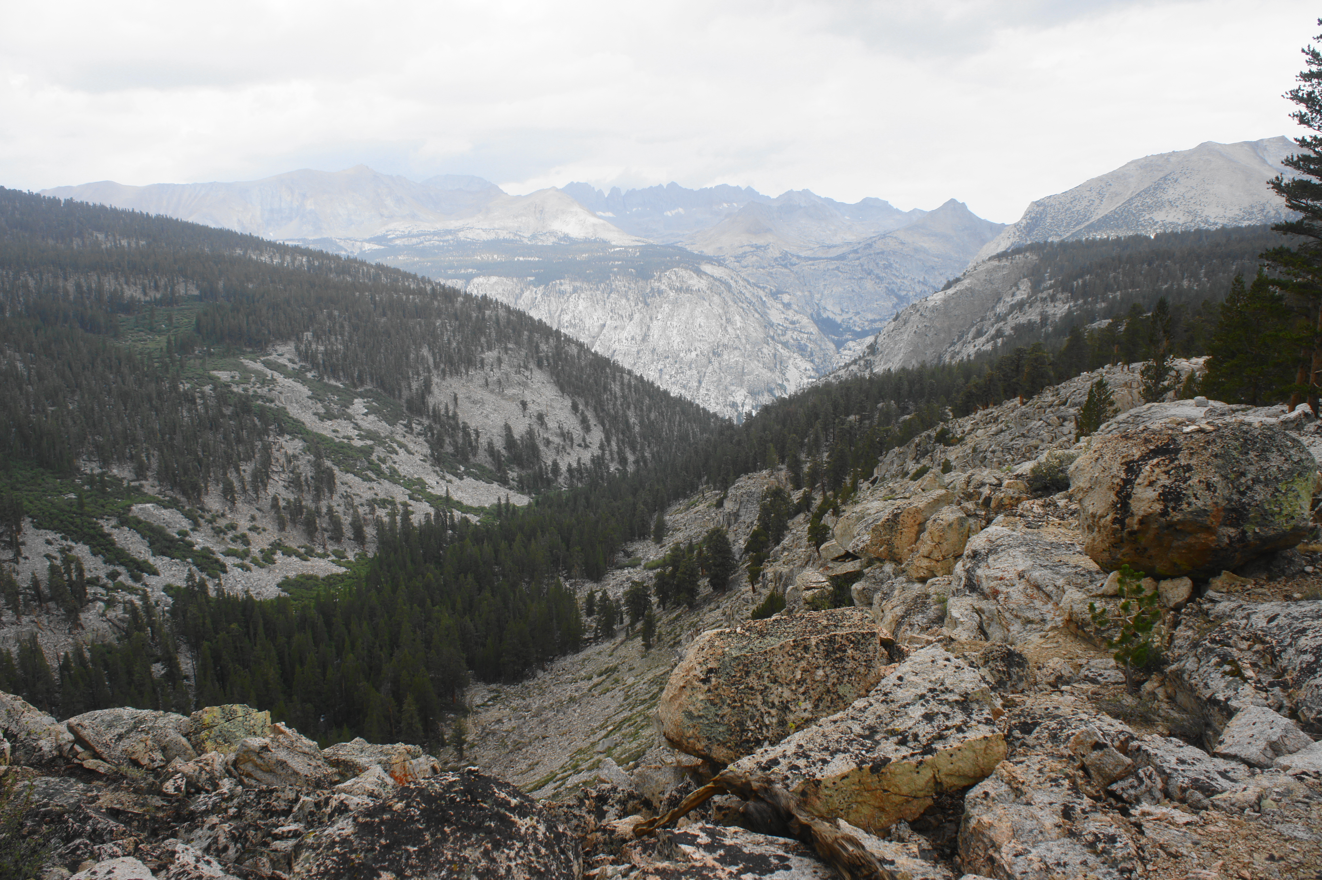 The other side ushers in another climb that makes up the 600 feet in elevation lost, plus an additional 400 feet. After passing a junction with the High Sierra Trail, which leads down to Kern Canyon and its associated hot springs, the JMT leaves behind a field of popular campsites, rising steadily to the west. About 1/3 mile up from the junction, the trail rounds a right-hand bend, revealing a lookout to the left with outstanding vistas to Kern Canyon and the Kaweahs.