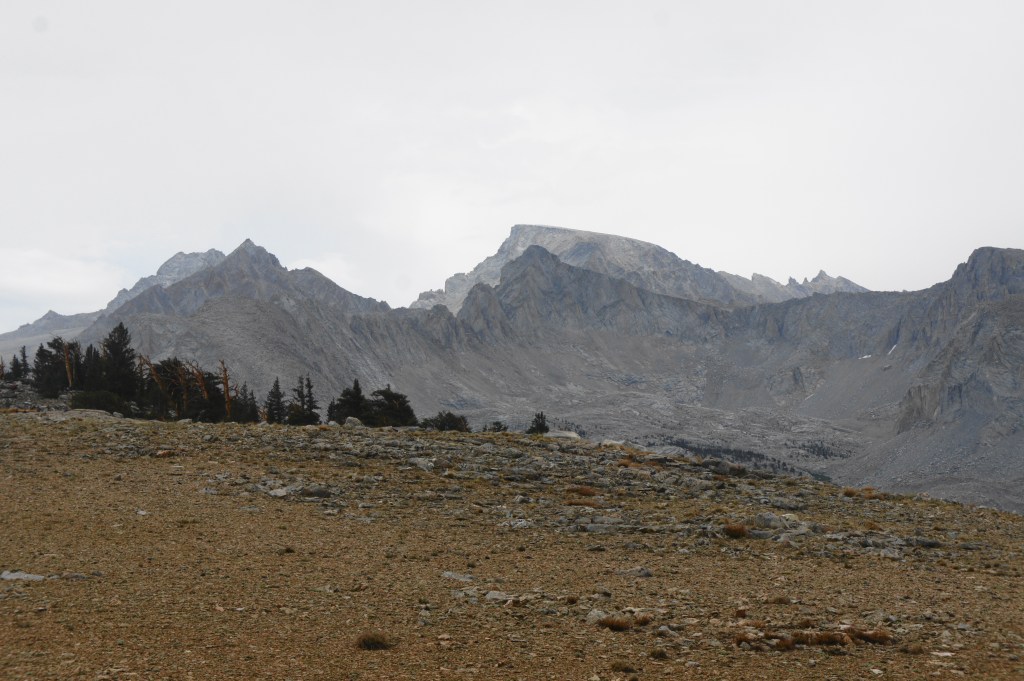 Hikers do have a fine view from here looking north to the terrain to come: Caltech Peak (13,833’), Diamond Mesa, Junction Peak (13,888’), with Forester Pass in the middle, a little less than five miles’ walk from this point. The frame to the east is dominated by Mount Tyndall (14,018’).