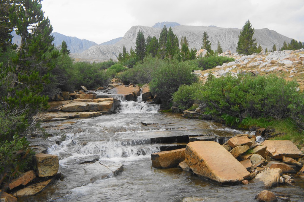 About 8.8 miles from Crabtree (JMT Mile 16.1), hikers reach a trail junction at the banks of Tyndall Creek. The route heading left leads to the often-unmanned Tyndall Creek Ranger Station, with Kern Canyon beyond. Bearing right, the JMT continues north, quickly approaching an open area, with the perennial drainage surrounded by low brush. Stay left at the junction with the Shepherd Pass Trail, then cross the creek, entering a very popular camping area. The best tent spots lie up the trail on the right after about 1/10 mile—past the bear locker on the left and near a set of lovely stairstep cascades, just below a restoration area where camping is prohibited. However, this is not typically a place for solitude.