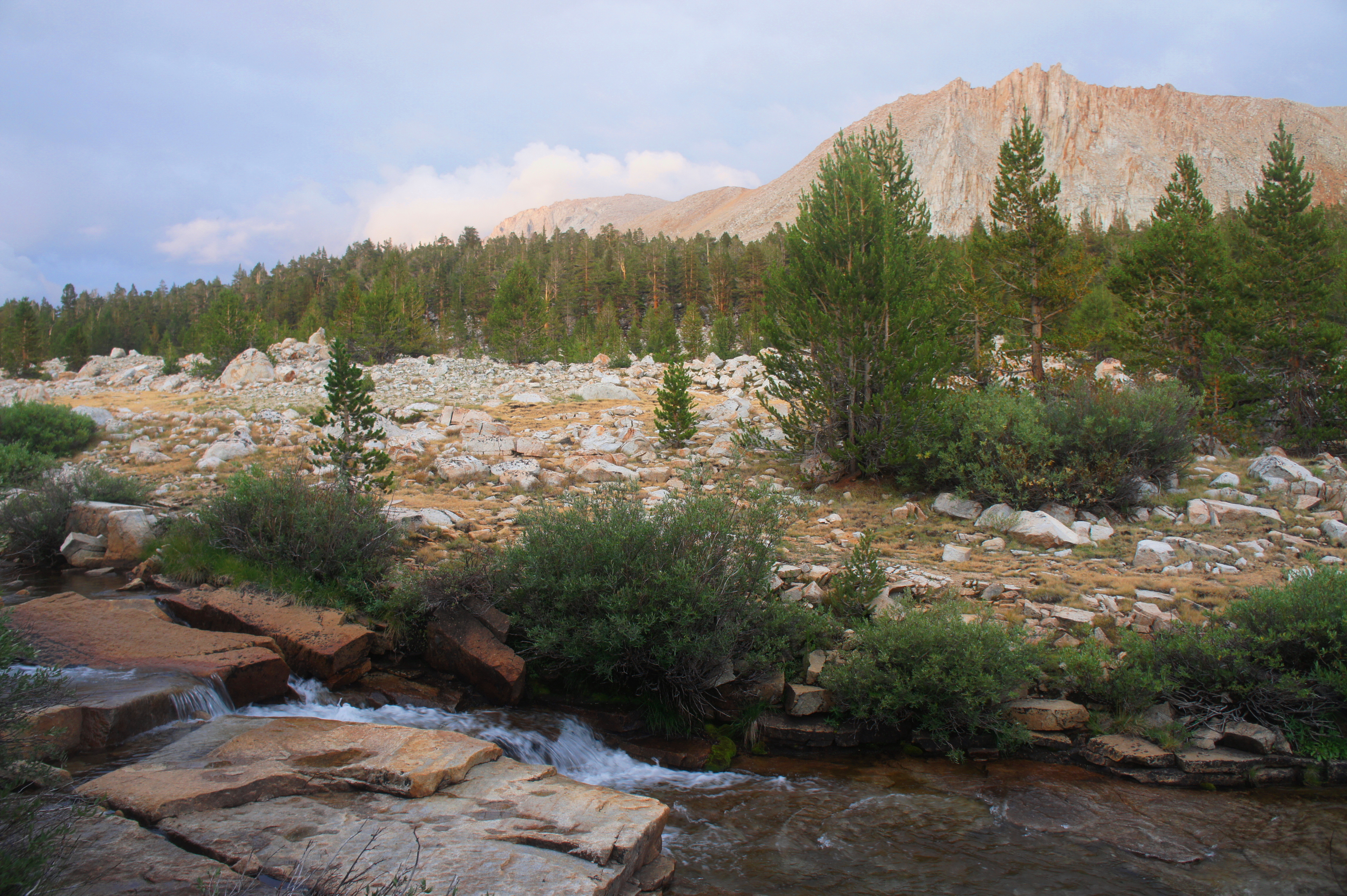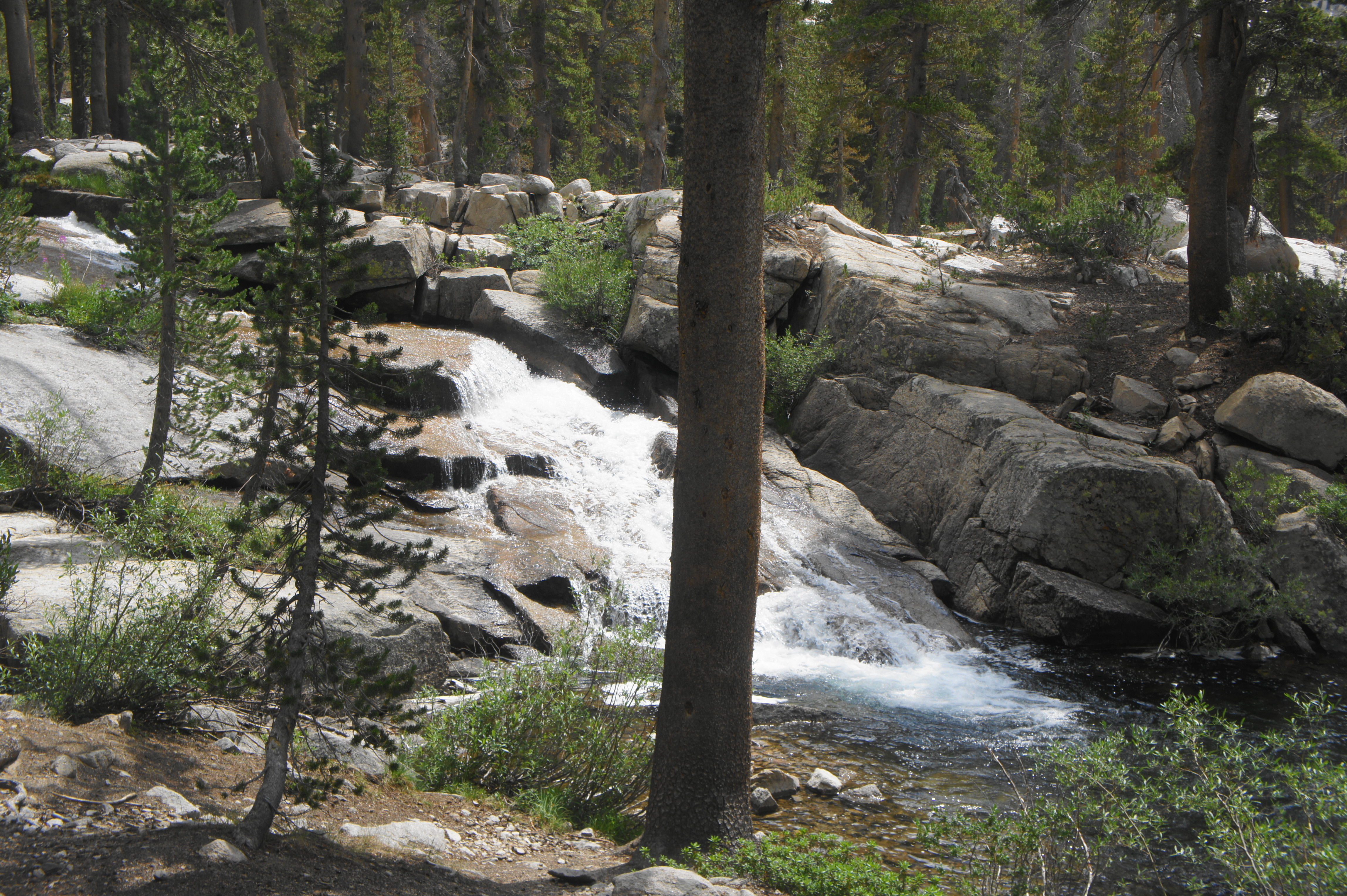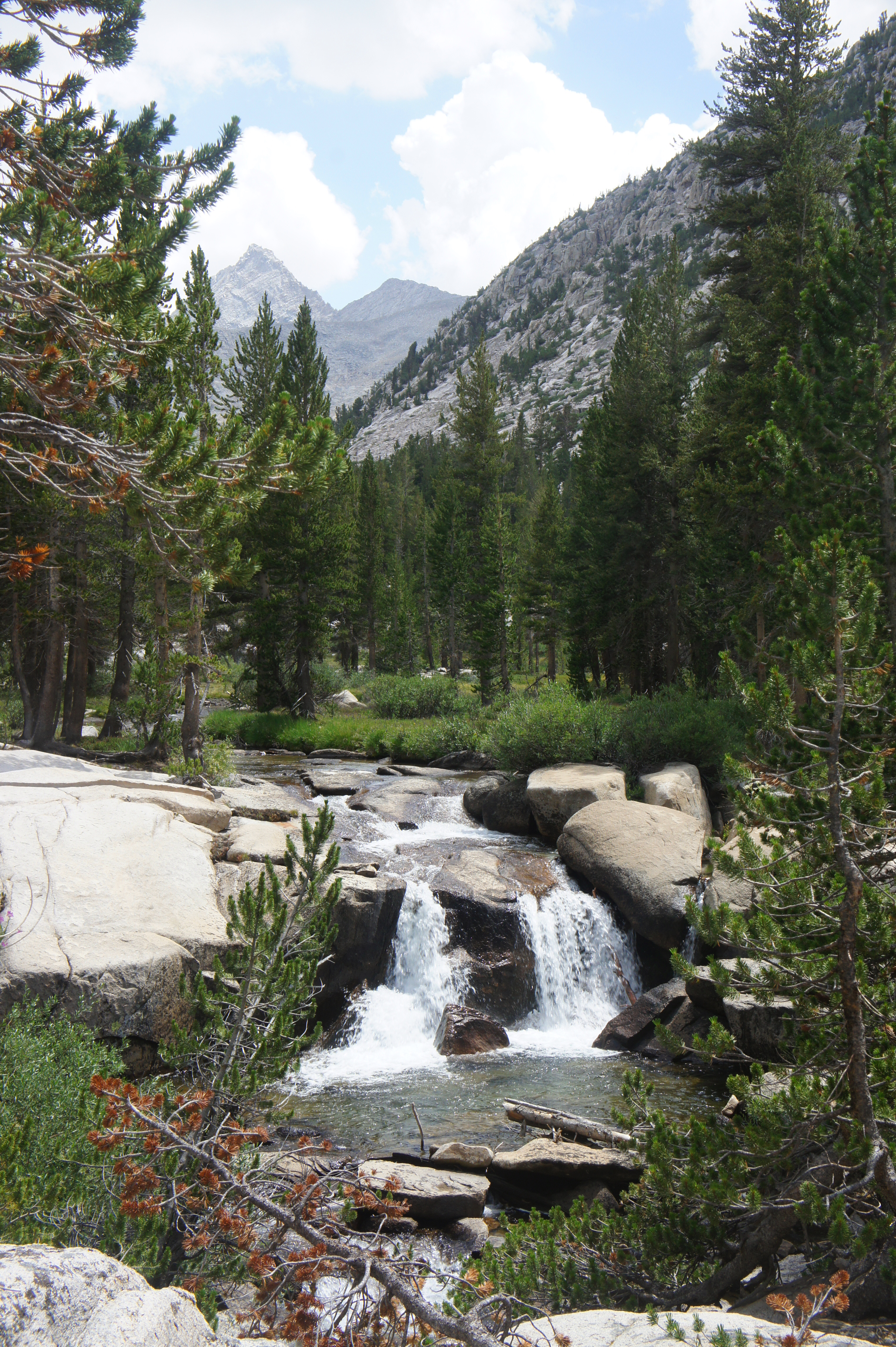From the junction with the Bubbs Creek Trail, near Lower Vidette Meadow, the northbound JMT abruptly leaves the valley floor, beginning a nearly 1,000-foot climb in just over a mile. After about 6/10 mile and 500 feet in gain, the wooded trail briefly levels and hugs a perennial stream (fed by Bullfrog Lake above) with a couple of nice campsites. Above is an imposing talus slope and a sun-soaked wall of granite cliffs.