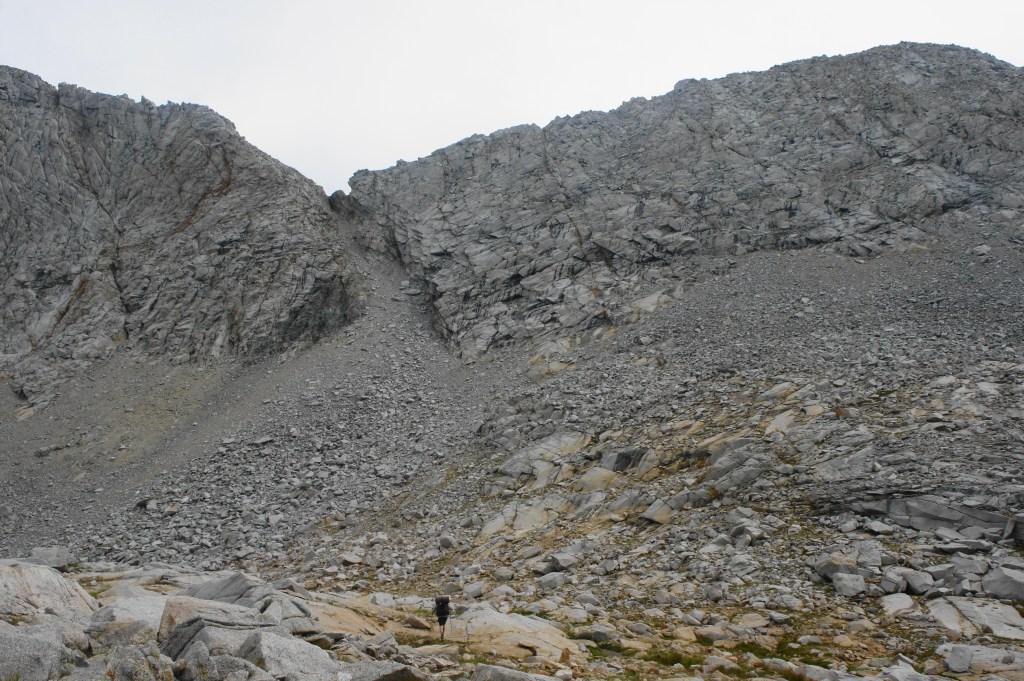 After passing a series of pinnacles and Mount Muir (14,012’), the trail settles into a steady, stony ascent toward the bulky western slope of Mount Whitney. In the final stretch, the JMT swings suddenly to the west, reaching a slope with new and spectacular vistas down to Wales Lake and the Wallace Lake drainage to the northwest.