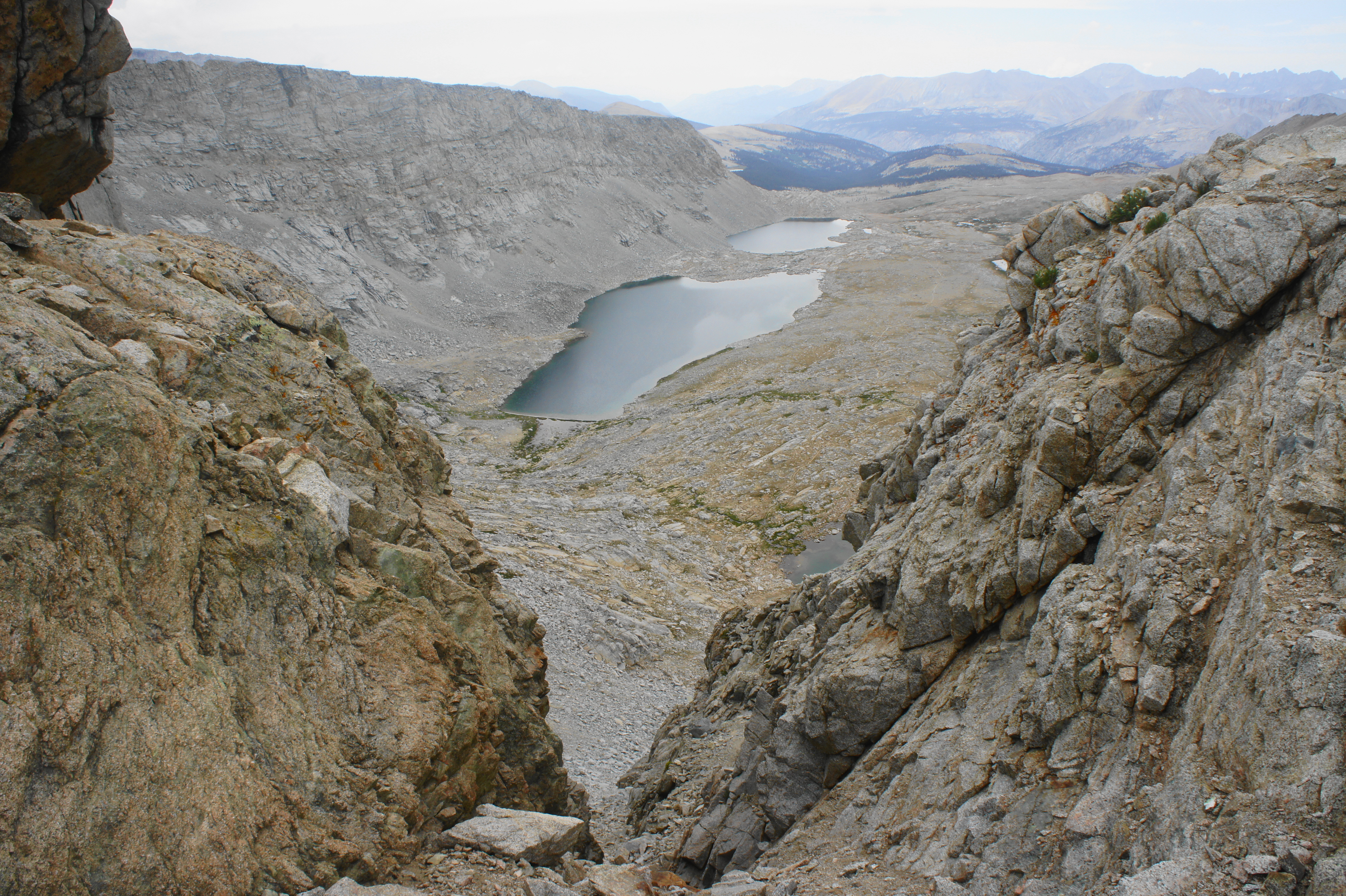 After more than 600 feet in gain from the final Tyndall Creek crossing, the trail reaches a narrow notch with window views back down to the two unnamed lakes, with the Tyndall Creek drainage, Kern Canyon, and the Kaweahs beyond. From here another short set of switchbacks leads to the crest of Forester Pass, the highest pass on the JMT. Here one is also likely to encounter a number of southbound JMTers, who had a much longer and arguably tougher climb to reach the pass from the other side.
