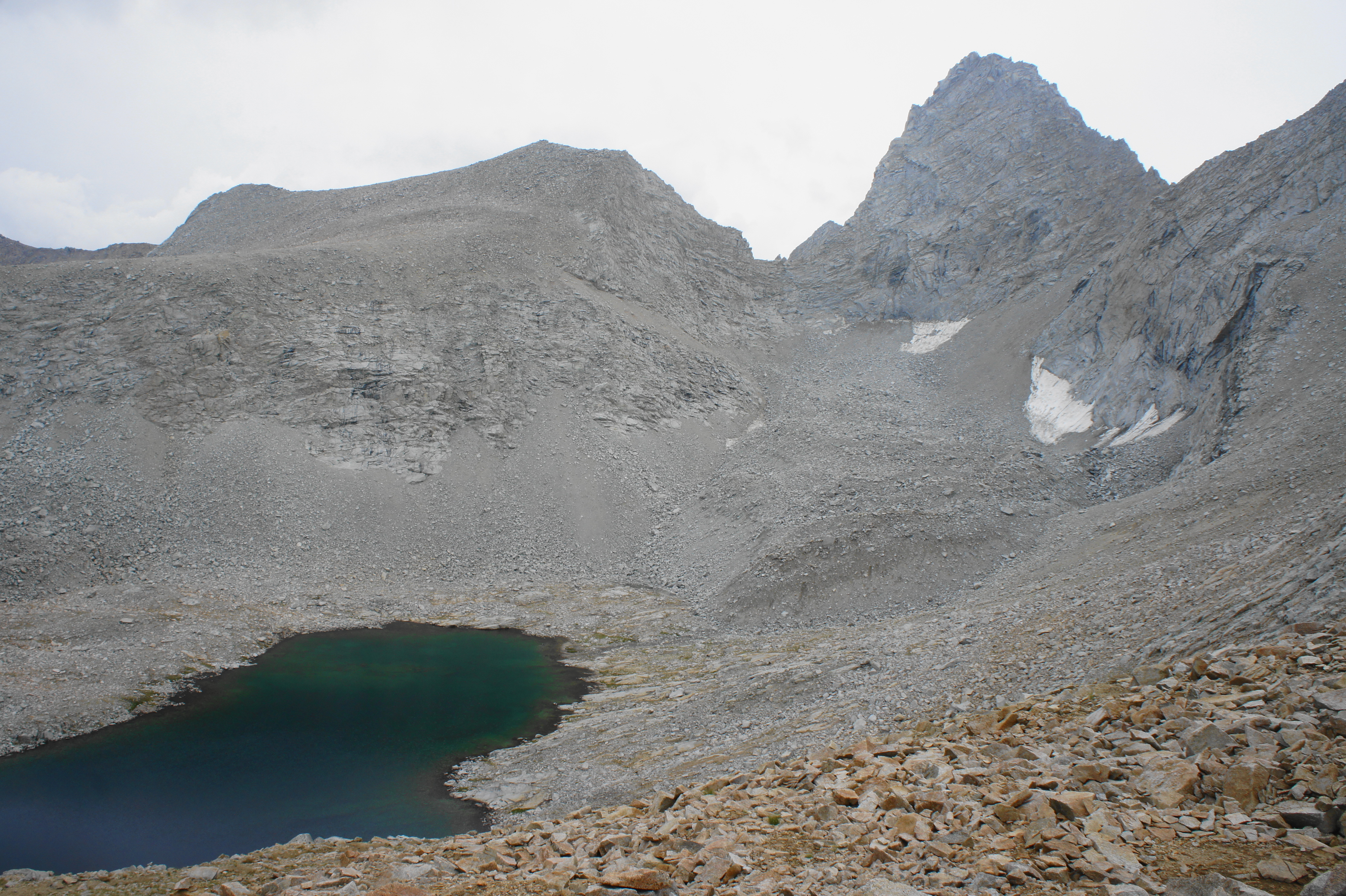 Descending from Forester Pass, the northbound JMT continues by zig-zagging down a talus slope then briefly levels off as it skirts a sharp grade dropping to an unnamed lake on the right. The aquamarine tarn is fed by snowmelt coming off Junction Peak (13,888’), an imposing summit situated at the intersection of the Kings-Kings Divide and Sierra Crest. Thereafter the trail skirts a high ridgeline with an even more precipitous drop off to the left, opening up excellent views down the canyon toward University Peak and the Kearsarge Pinnacles.