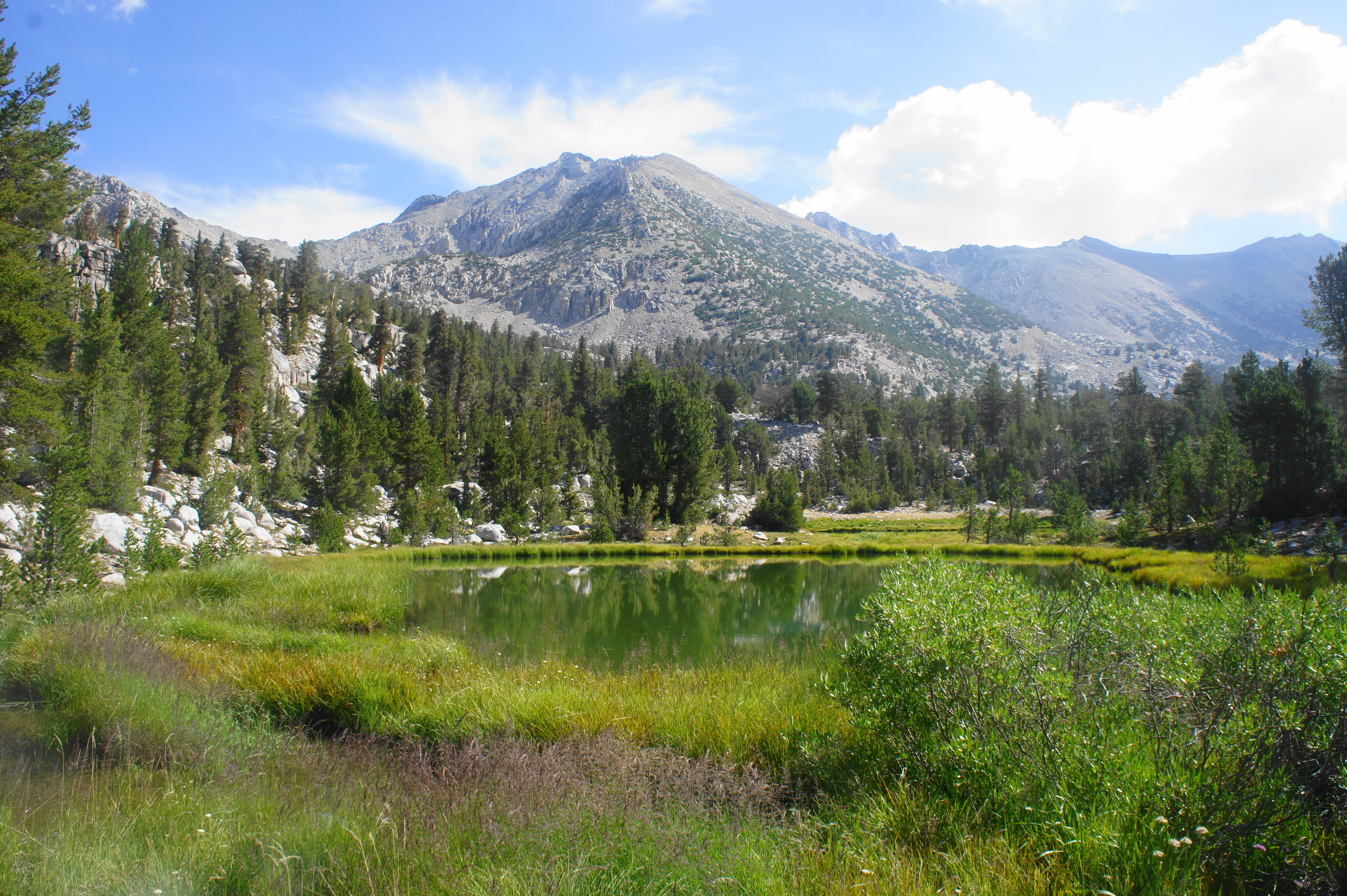 Rising through lodgepole forest, it is a short walk from the second creek crossing to a junction with the trail to Bullfrog Lake and Kearsarge Pass, your cue to exit the JMT to the right. After another hundred yards or so in the woods, the landscape begins to open up as hikers pass a grassy pond on the right, with imposing Mount Rixford (12,888’) beyond.