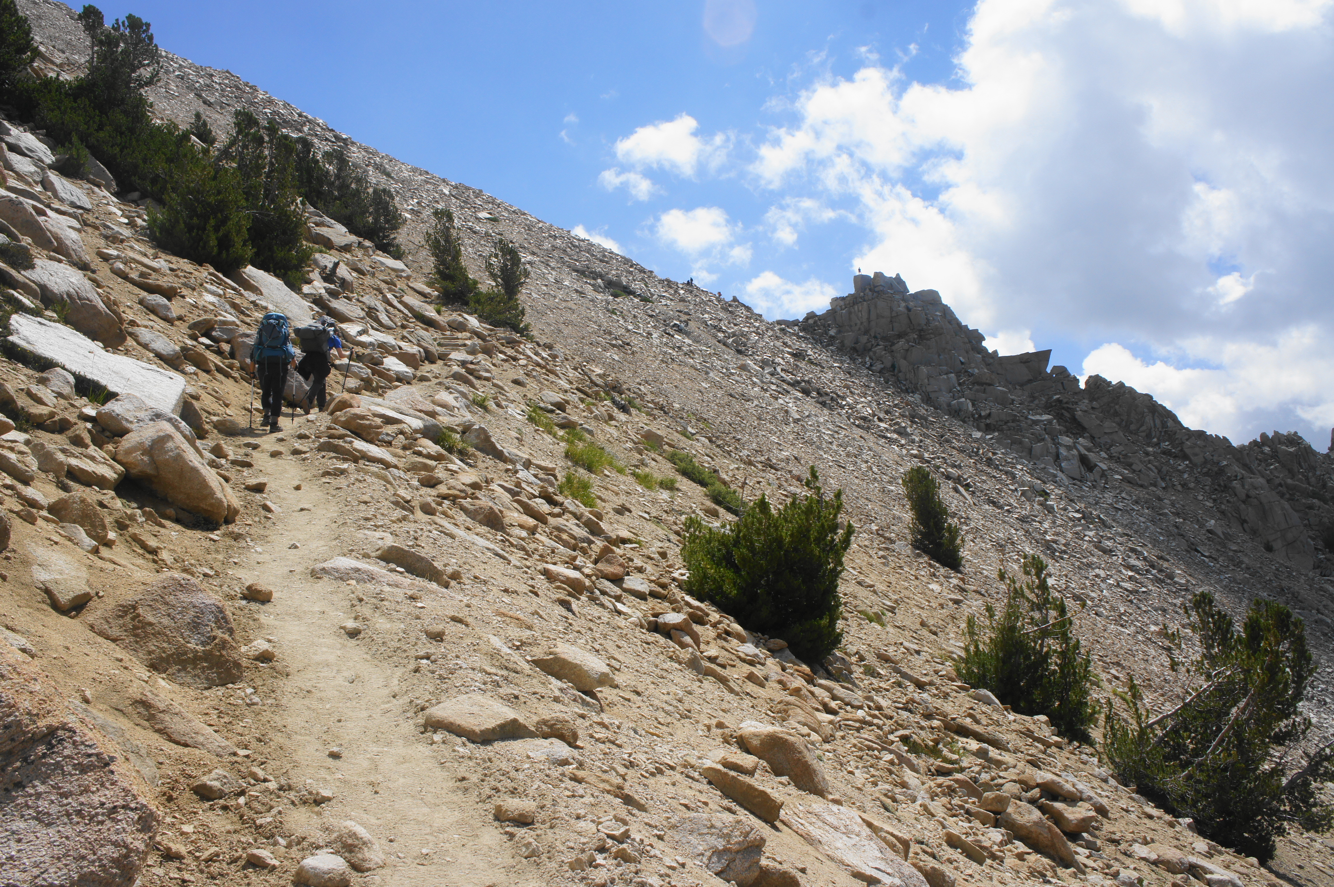Even though Forester Pass looms just ahead, it is still not obvious entirely where the trail goes from here, as the wall beyond appears sheer and impassable. Sure enough, however, the JMT begins to climb steeply to the right, clearing a talus slope and switchbacking to the base of a series of stony ledges. The trail work beyond is an impressive feat of construction, with the route over the pass completed in 1931 (prior to this point the JMT was routed east through Junction and Shepherd Passes). Here the switchbacking trail appears carved straight into the bulging granite, with a shelf just wide enough to offer passage for hikers.