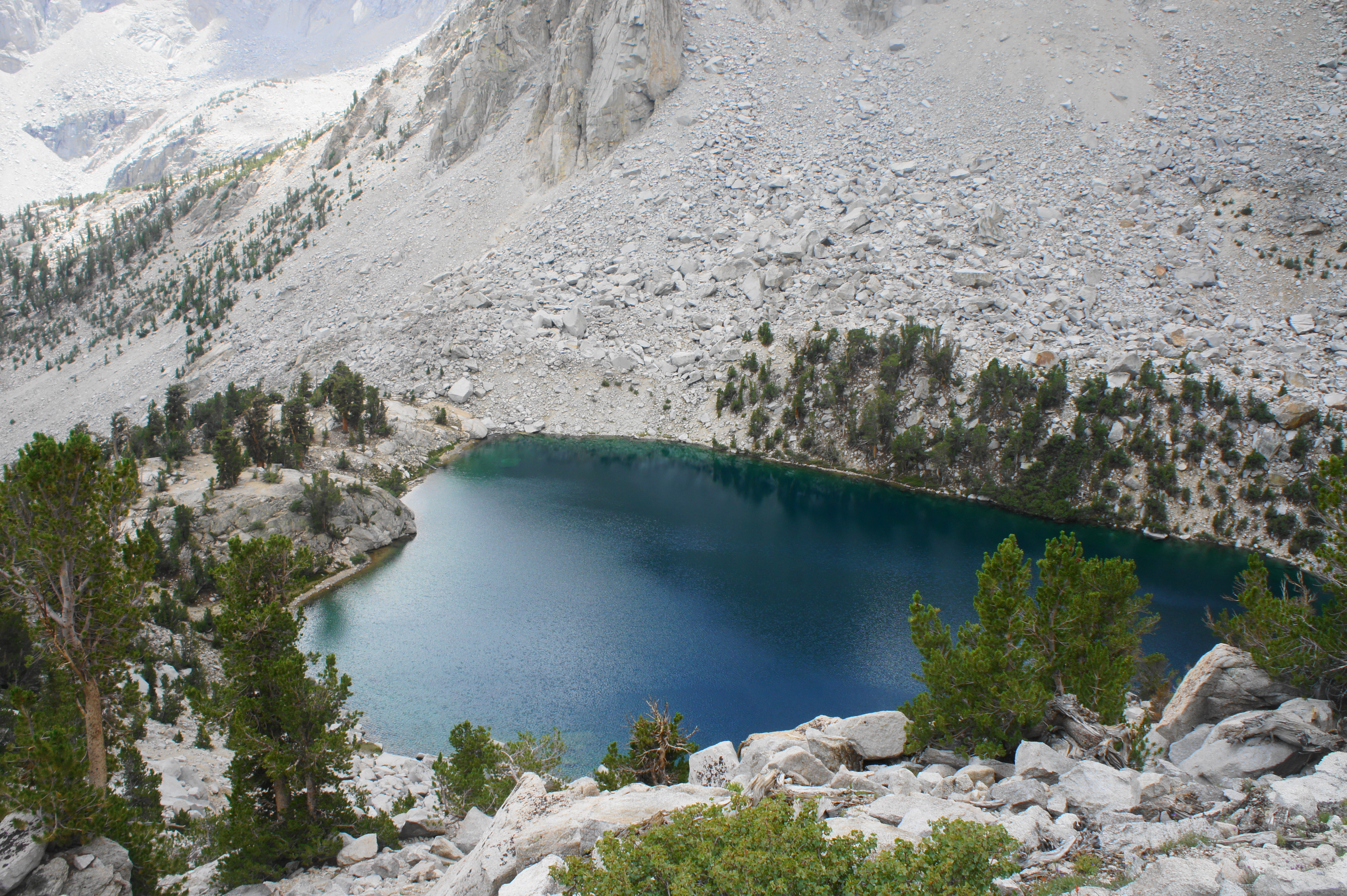 Though the most obvious trail leads straight in the direction of Big Whitney Meadow, this is not the PCT. Rather, hikers will want to turn right, following a reasonable grade as it hugs the south-facing slope of the main mountain divide. The mostly uphill track leads for 6/10 mile to a junction that is easy to miss: just before crossing a small drainage, a 0.2-mile spur trail leads right and climbs to Chicken Spring Lake, a worthy detour and good place to fill up on water for the onward journey.