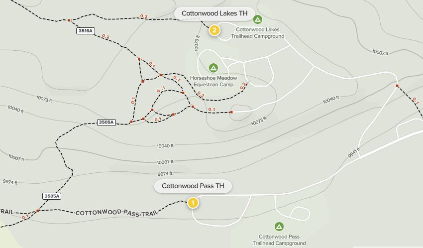 For many, due to permit constraints, the scintillating, multi-week journey on the John Muir Trail (JMT) begins not on the JMT at all, but along one of the many side trails that eventually connect with the main track. One popular destination for beginning the hike is Horseshoe Meadow, a high-altitude staging area at about 10,000 feet on the eastern flank of the Sierra Nevada—a 23-mile drive from Lone Pine, California. From Horseshoe Meadow, a network of paths offers access through Inyo National Forest to Sequoia National Park and the Golden Trout Wilderness. Two trailheads are of relevance for JMT hikers—Cottonwood Pass and Cottonwood Lakes—and are about a half-mile apart, with separate parking areas and backpacker campgrounds. A Cottonwood Pass or Cottonwood Lakes permit—which is good for the entire JMT journey—allows hikers to spend the night prior to your start date at the trailhead. (Note: There are 18 and 13 first-come, first-serve walk-in sites, at the cost of $6/night, at Cottonwood Pass and Cottonwood Lakes, respectively.) Although both the Cottonwood Pass and Cottonwood Lake routes both provide access to the Pacific Crest Trail (PCT), the hike as described here follows the former, offering slightly easier and shorter access to the PCT/JMT corridor.