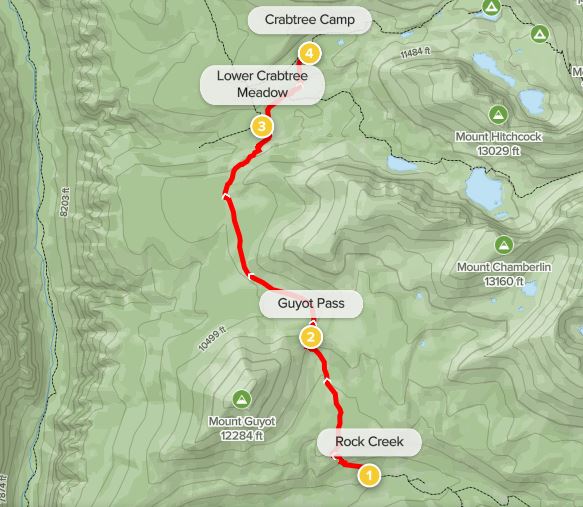 After about 2.5 miles of relatively level terrain, the PCT begins to descend in earnest into the drainage carved by Siberian Pass Creek. By now, hikers can see across the woody valley of Rock Creek to Mount Guyot (12,300’), the most prominent peak to the northwest. After about a mile of descent, hikers pass a small meadow bounded by thick granite slabs, then the trail zig-zags down switchbacks toward the main Rock Creek drainage. Crossing a marshy area at around 12.5 miles, there is some seasonal stream access and a campsite frequently used by trail crews. Thereafter, it is a relatively short walk to the next trail junction, situated about 12.8 miles from the start.