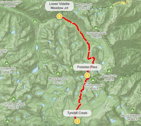 Tyndall Creek to Lower Vidette Meadow via Forester Pass (13 miles)