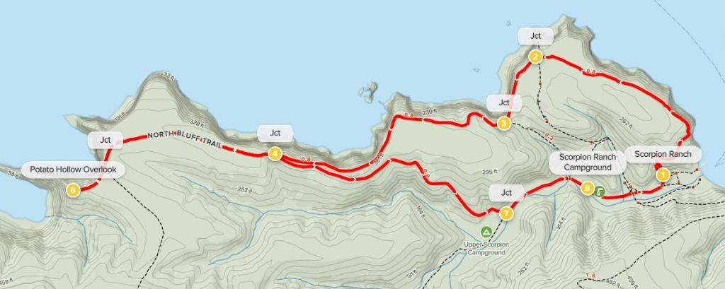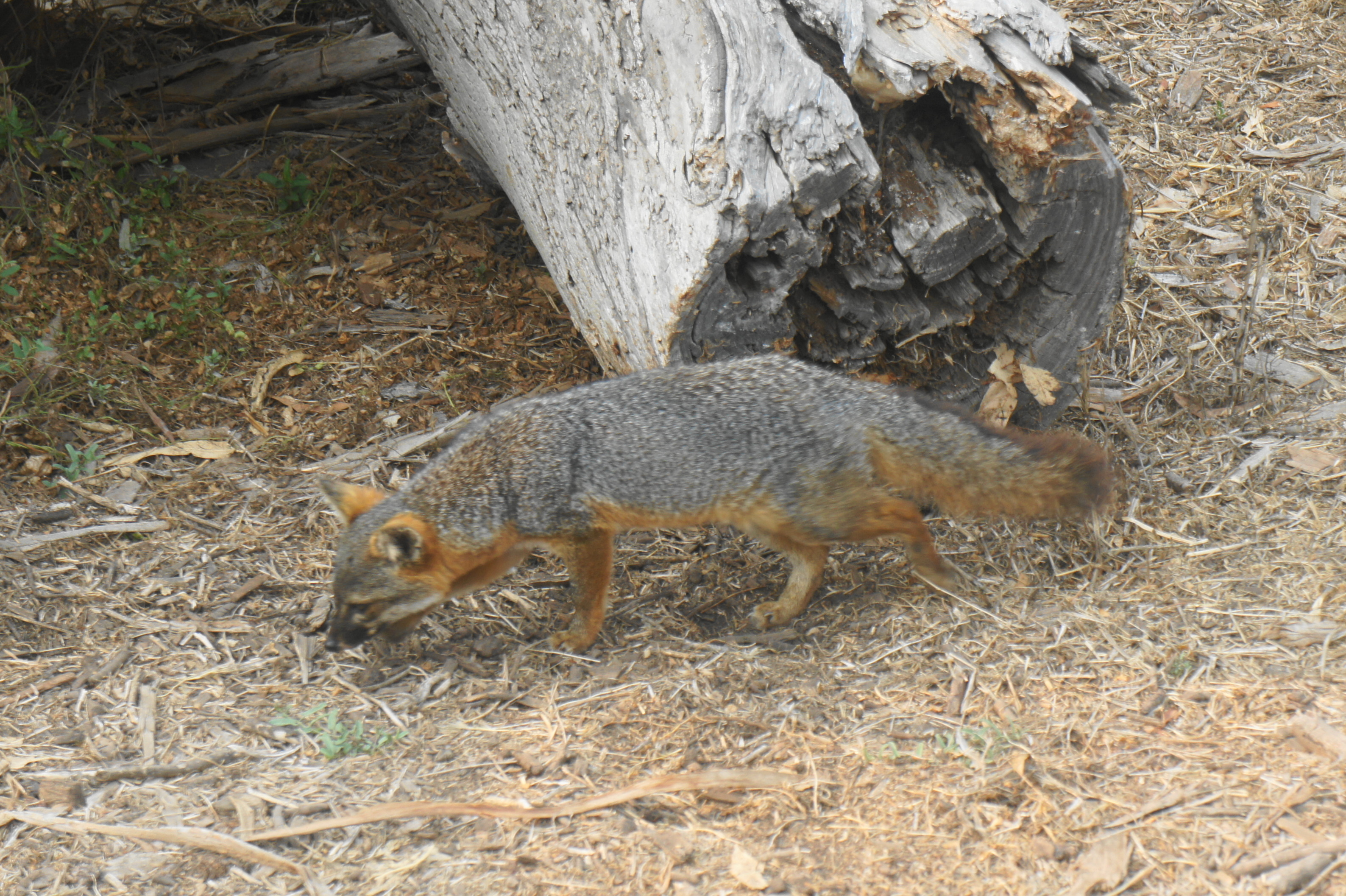 Enjoy this popular viewpoint, then return the way you came for about ¾ mile, returning to the junction of the Potato Harbor Road and North Bluff Trail, this time bearing right. Follow the descending road as it overlooks scrubby Scorpion Canyon and passes several prominent displays of diatomaceous earth on the left. The eucalyptus forest of Upper Scorpion Cove Campground eventually comes into view, and the road descends to a junction at the four-mile mark. Bear left, then walk along the wide and level path, where you are sure to encounter the island fox, a smaller relative of the mainland gray fox that is found only on the Channel Islands.