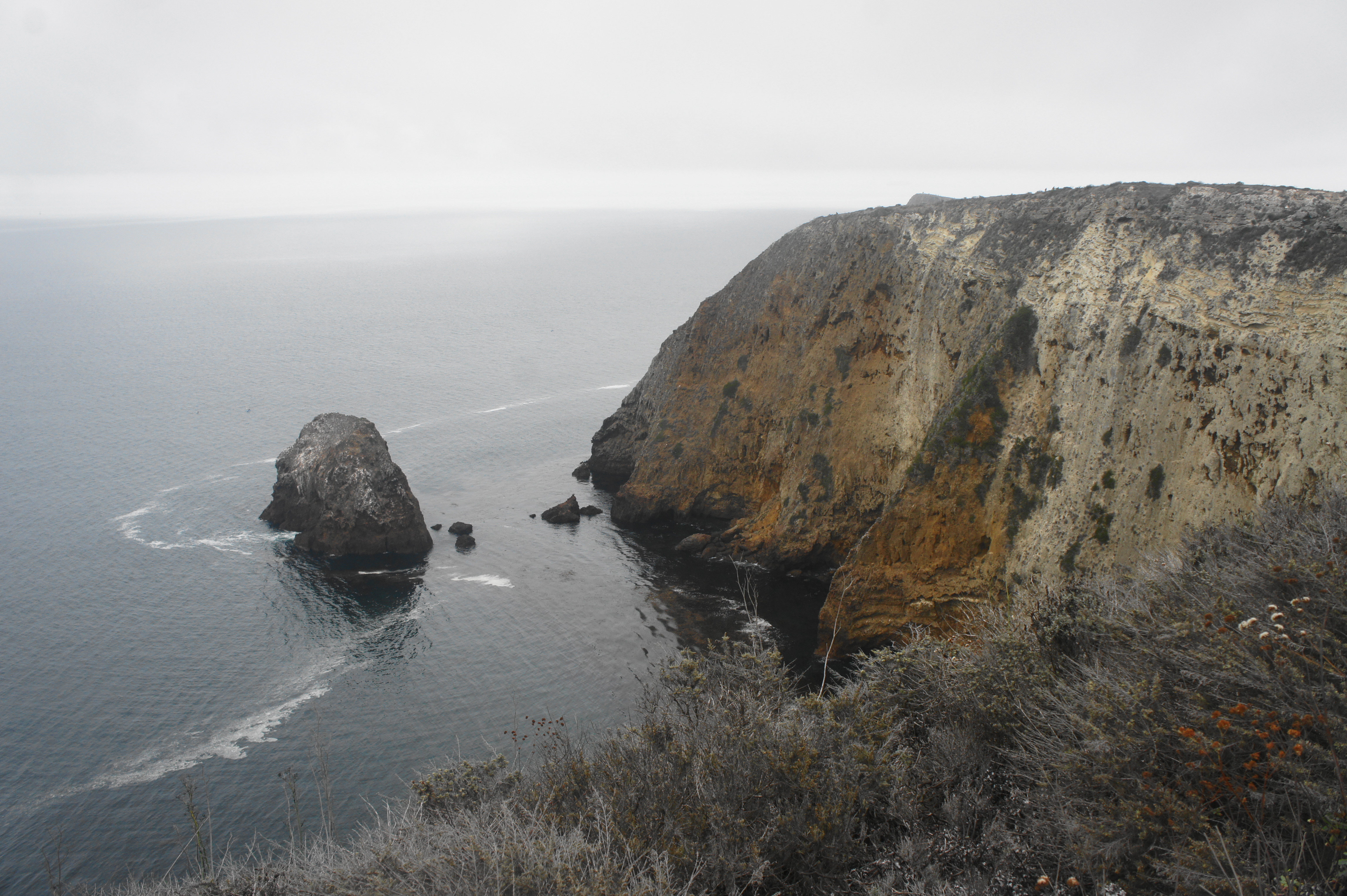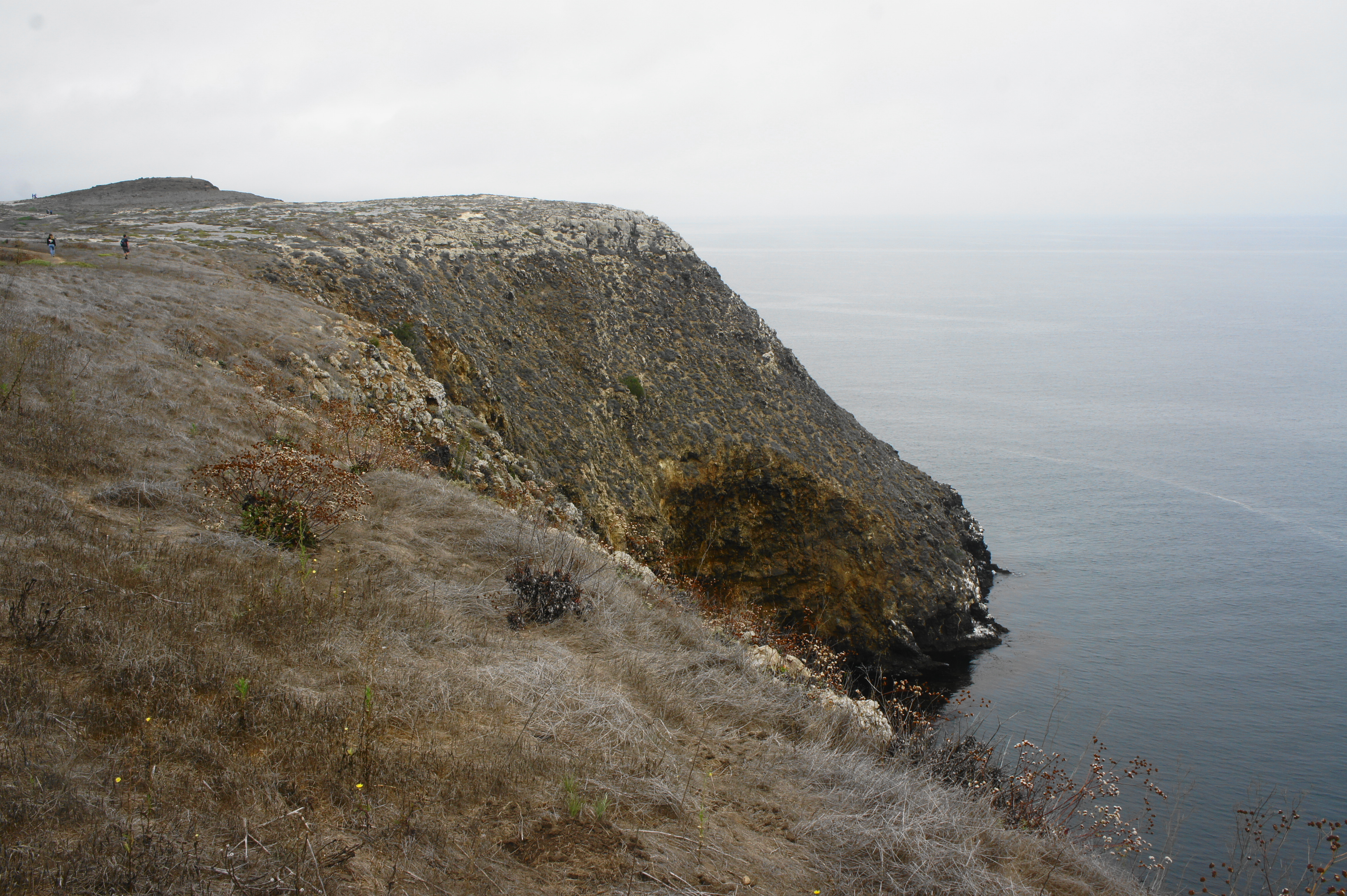 Rising high out of Scorpion Valley, the Cavern Point Trail turns north and passes an overlook at about ¼ mile. Here one can glimpse some hearty native plants clinging to the edge of the cliffs: after the island was overrun by domesticated sheep and cattle in the late 1800s, much of the native plant life was devastated—surviving only in areas such as the precipice of the bluffs, out of reach for livestock.