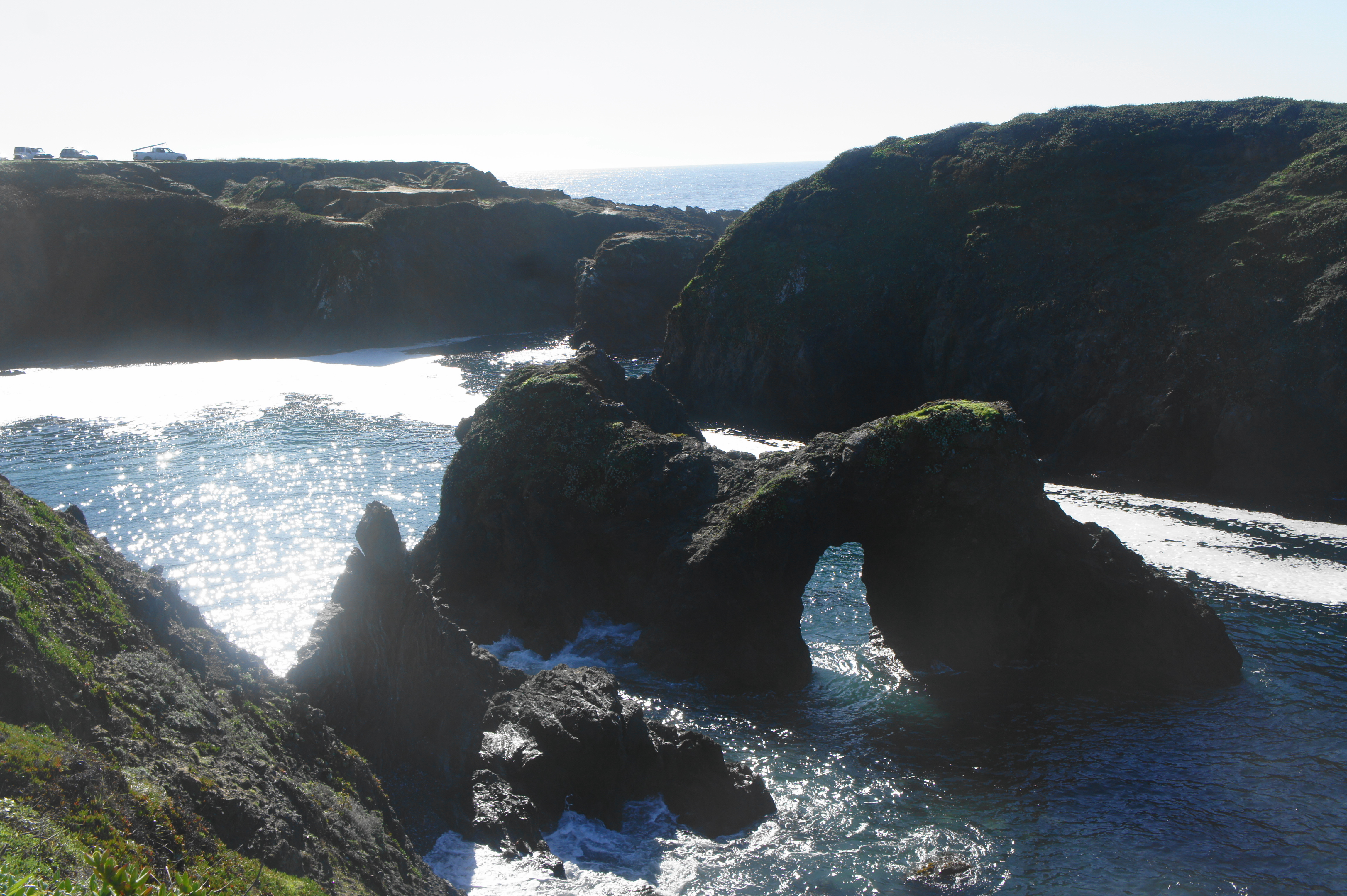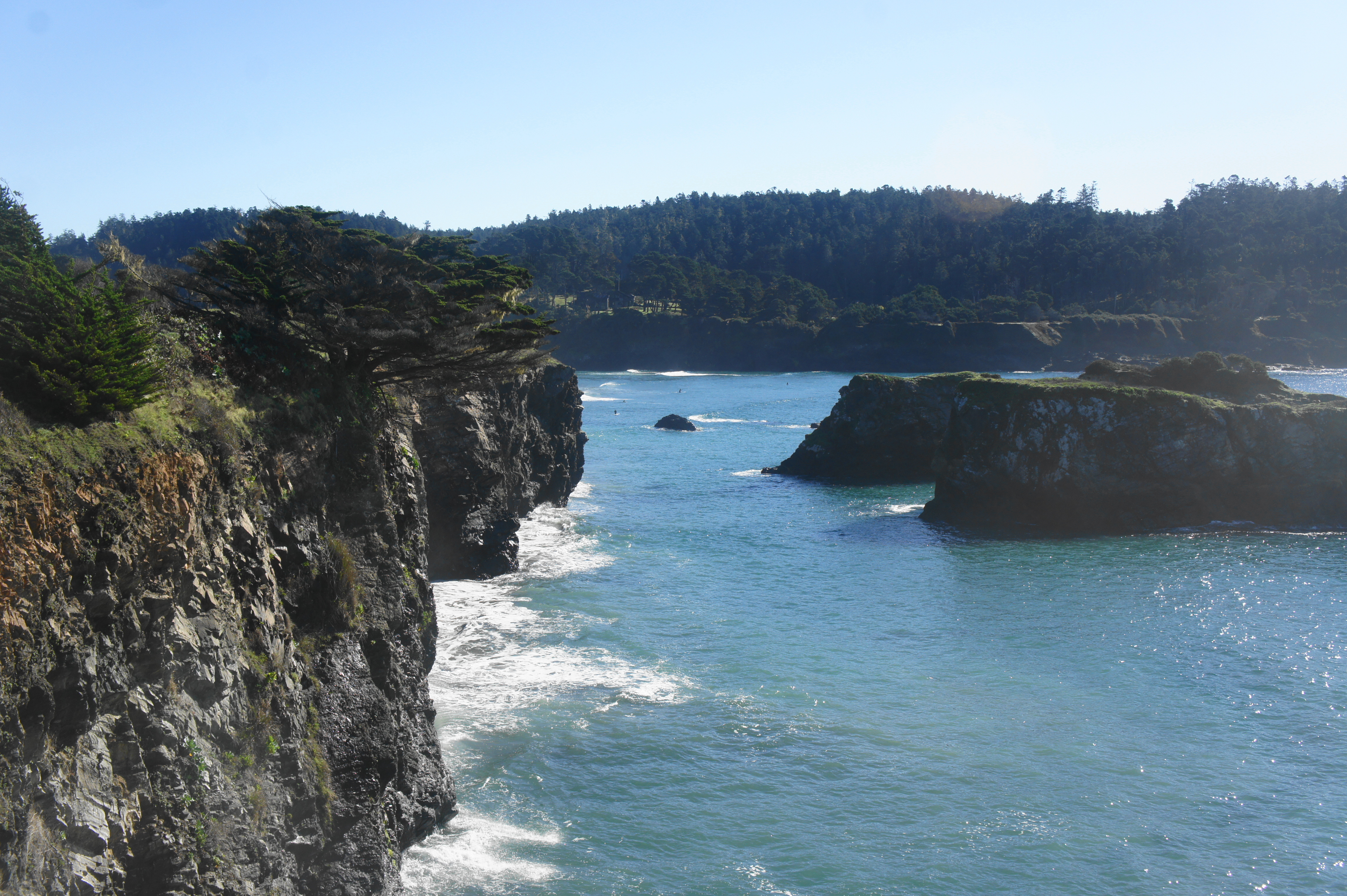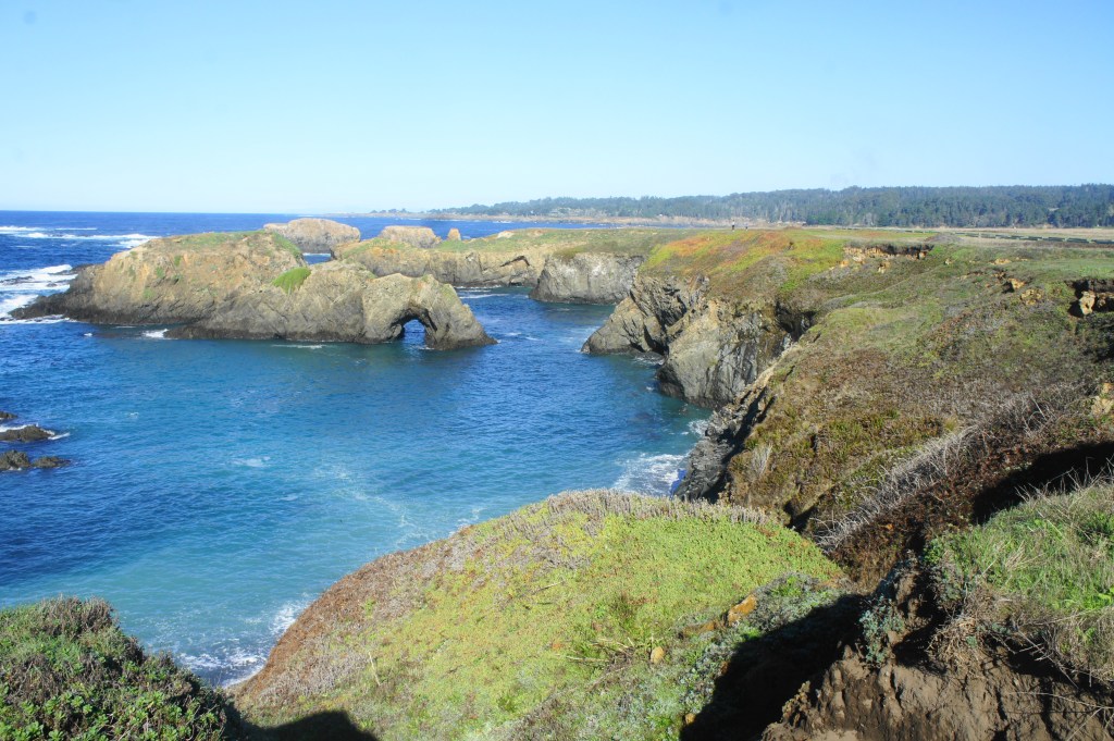 After skirting another cove, the trail passes another small, roadside parking area and angles along the coastline with open views north toward Russian Gulch and Point Cabrillo (one can see the Point Cabrillo lighthouse in the distance). As the trail approaches a cypress grove and Point Kelli, the path abruptly ends, spilling out onto Heeser Drive, where there is a parking area with picnic benches and a restroom.