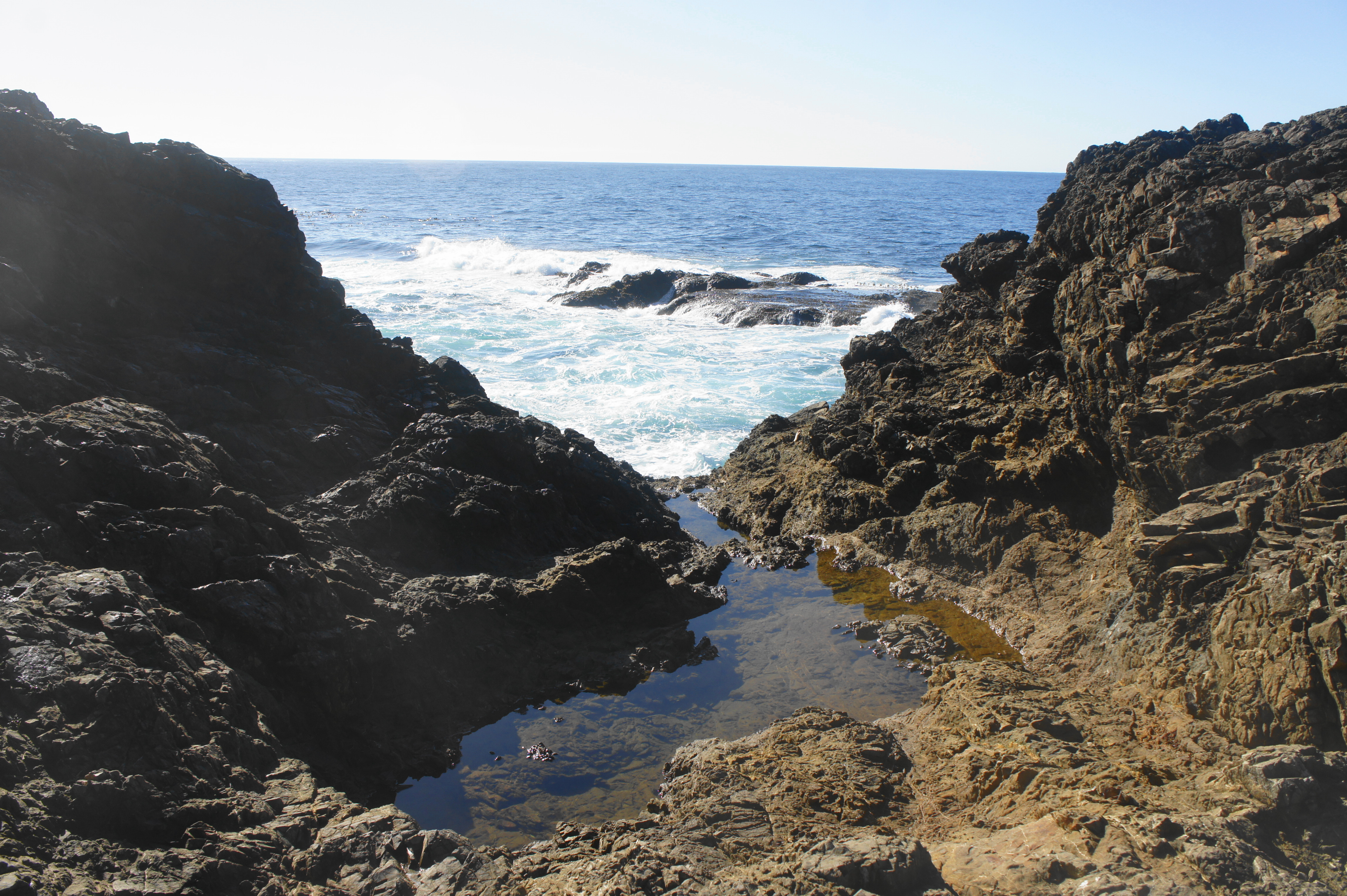 Just beyond the blowhole is the southernmost tip of the peninsula, after which the onward trail rounds back north, with several spur paths leading down to tidepools left by the receding waves. The highly eroded bluffs are teeming with ice plant—an invasive species brought in to stabilize shores in the early- to mid-20th century but which now has earned the ire of naturalists for crowding out native plants.