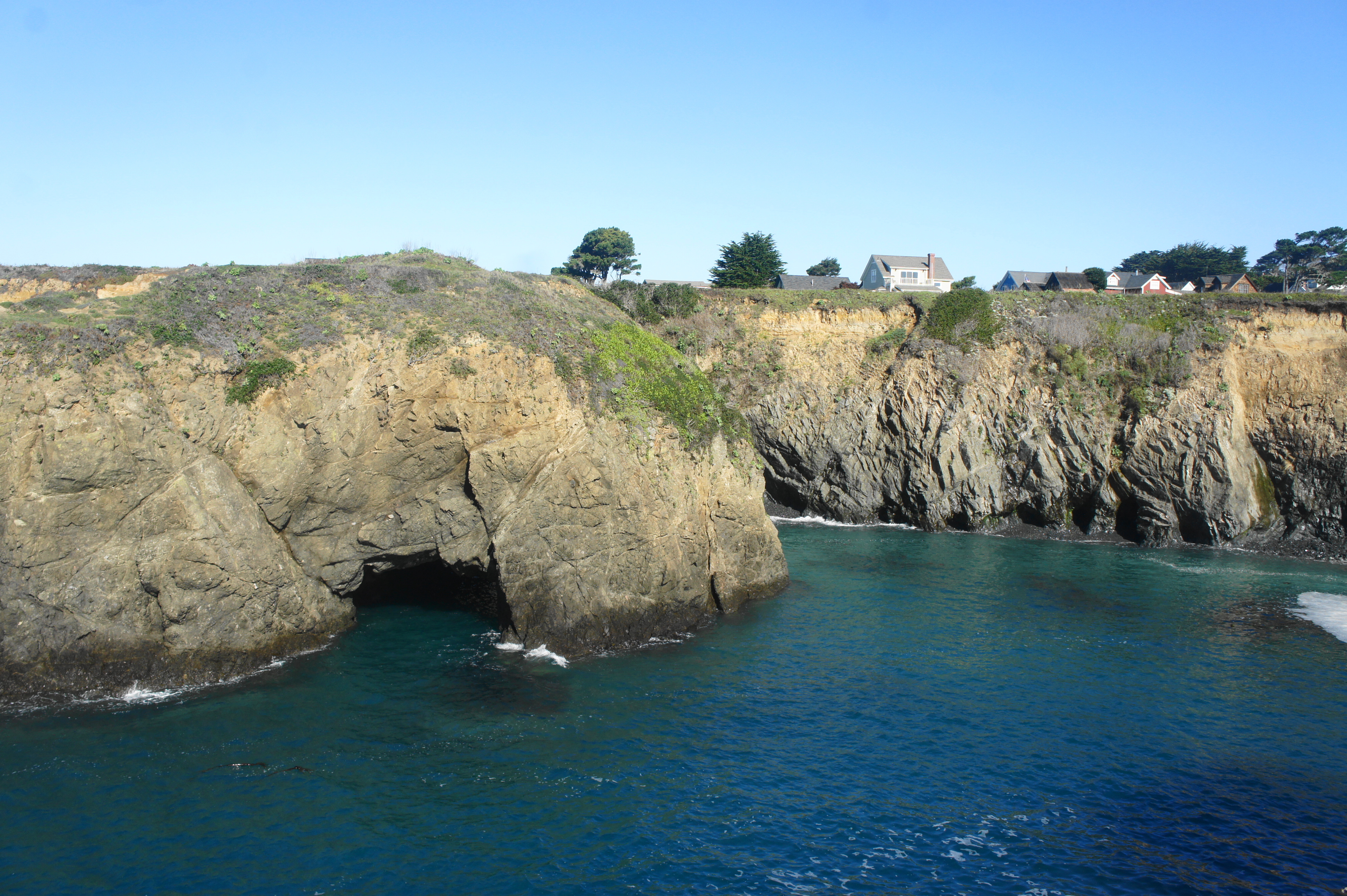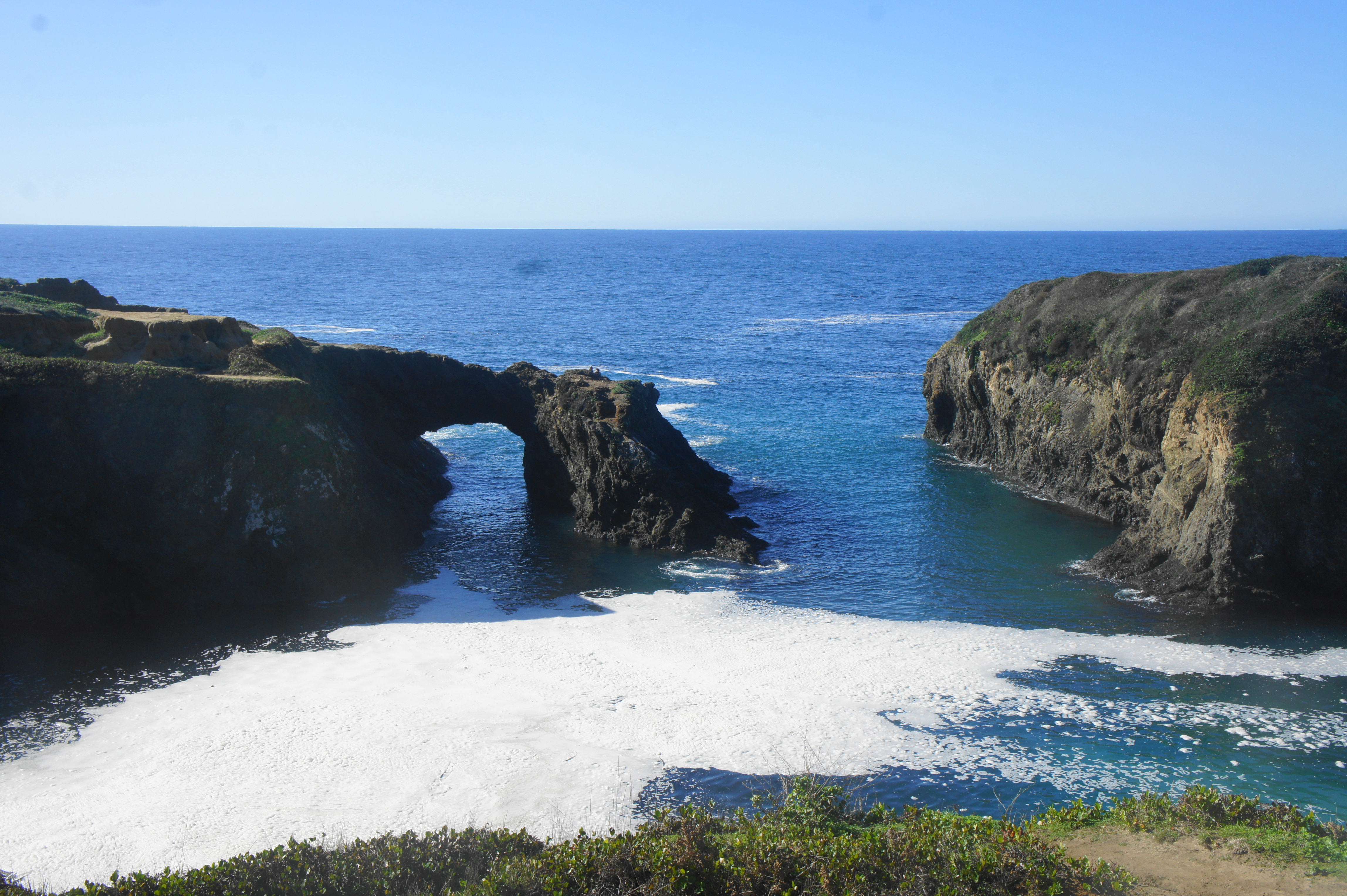 Angling around to the north side of the peninsula, bear left as the main track heads straight, continuing to follow the Mendocino Headlands Trail around a scenic inlet with a gaping arch cutting through the eroded rock below. The best view of the arch comes at around 1.2 miles, after which the trail splits again, and the onward track skirts the cliffs right above the archway.