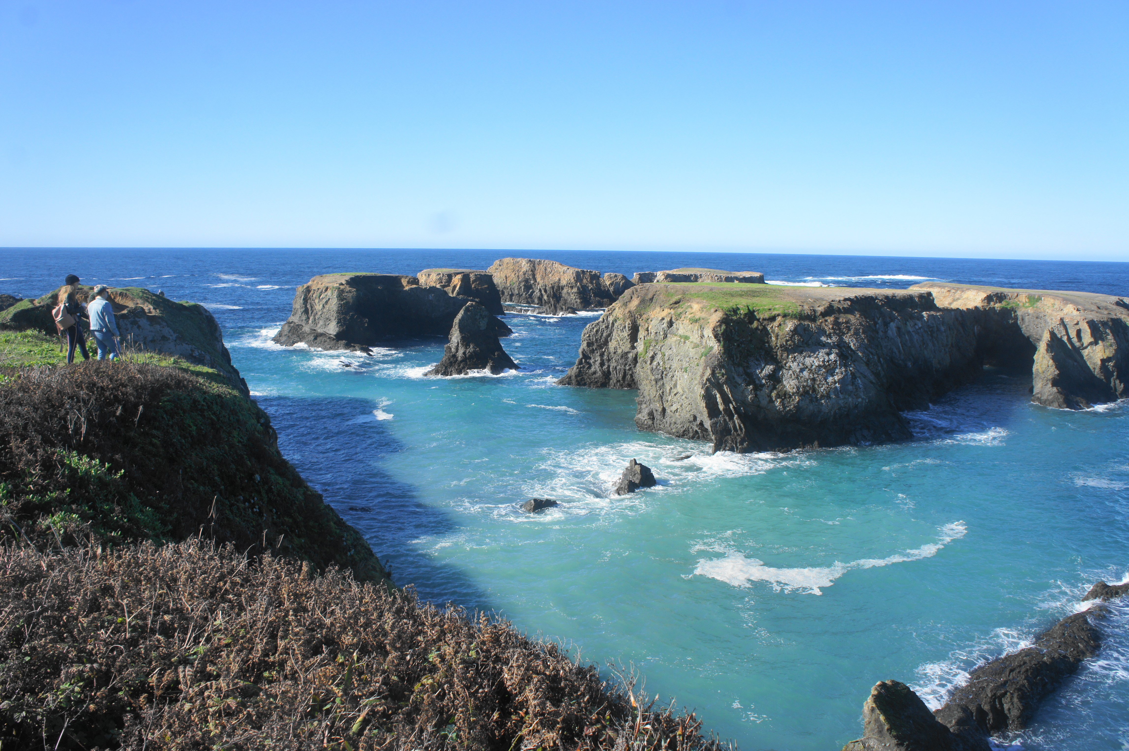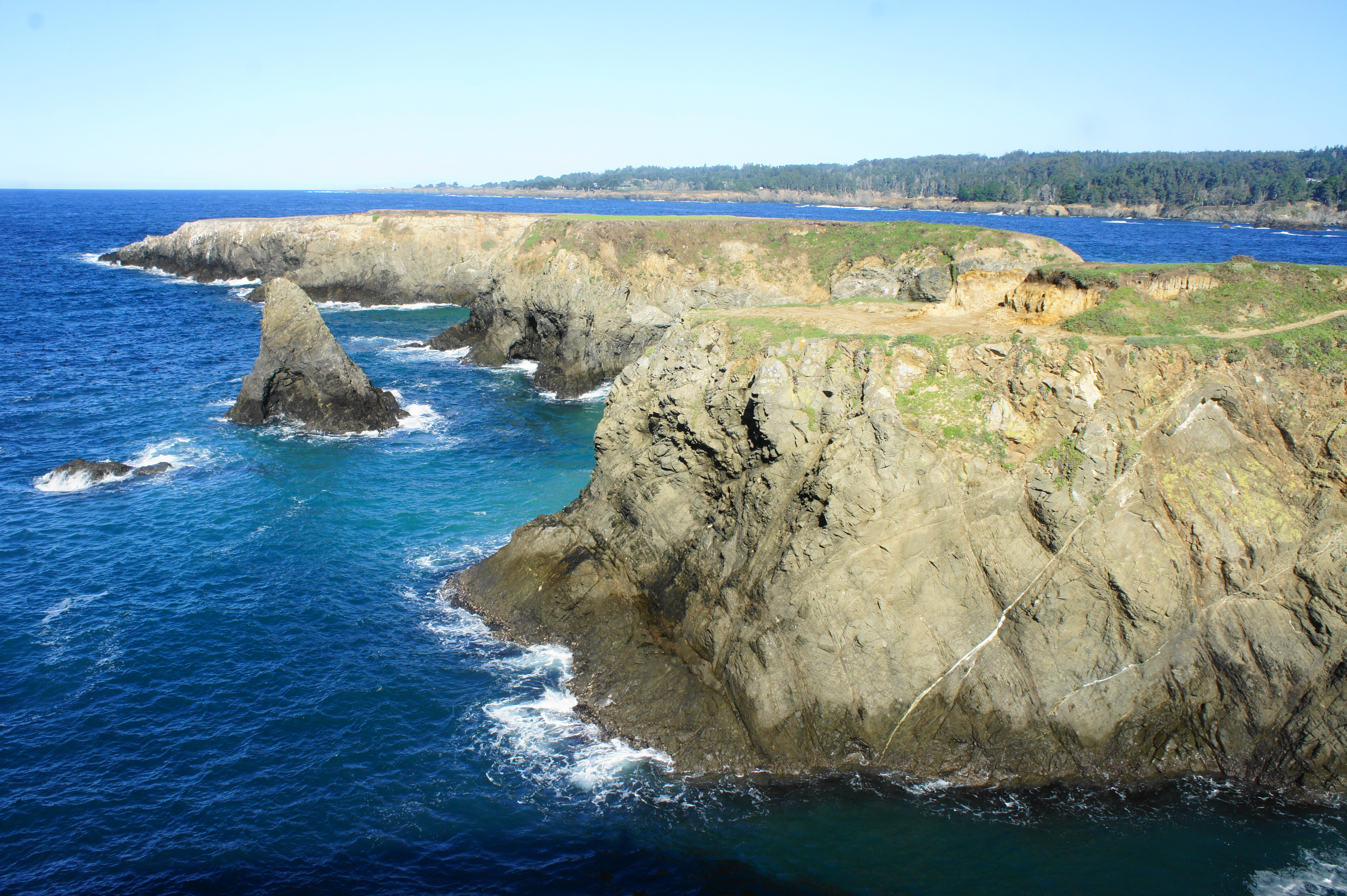 After peering over the edge for your first glimpse, bear right on a faint but well-trodden trail hugging the cliffside as it bounds westward. After traversing the open scrub for 1/10 mile, the Mendocino Headlands Trail reaches a second, pine-studded viewpoint at ¼ mile. From here one can see west to a pair of blocky islands, followed by the exposed peninsula of Point Mendocino, which hikers will reach shortly.
