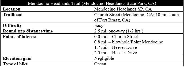 There are many possible entry points for the Mendocino Headlands Trail, but yours truly started at the southeast end and worked clockwise, beginning at the end of Church Street in Mendocino. (Note: This is within easy walking distance of a number of inns/B&Bs in town.) From the gravel parking lot behind the Mendocino Presbyterian Church, two main walking paths head south; take the westernmost track (the eastern one heads down to Big River Beach). Here one enters Mendocino Headlands State Park.