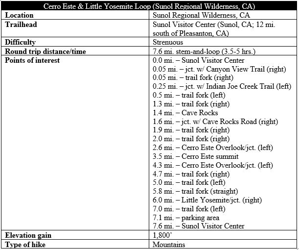Many hikers will be satisfied enough with this vista and proceed down the southern slope toward Little Yosemite. However, those with some extra energy and in search of solitude can bear left, climbing for about ¾ mile to the official summit of Cerro Este and highest point in Sunol Regional Wilderness.