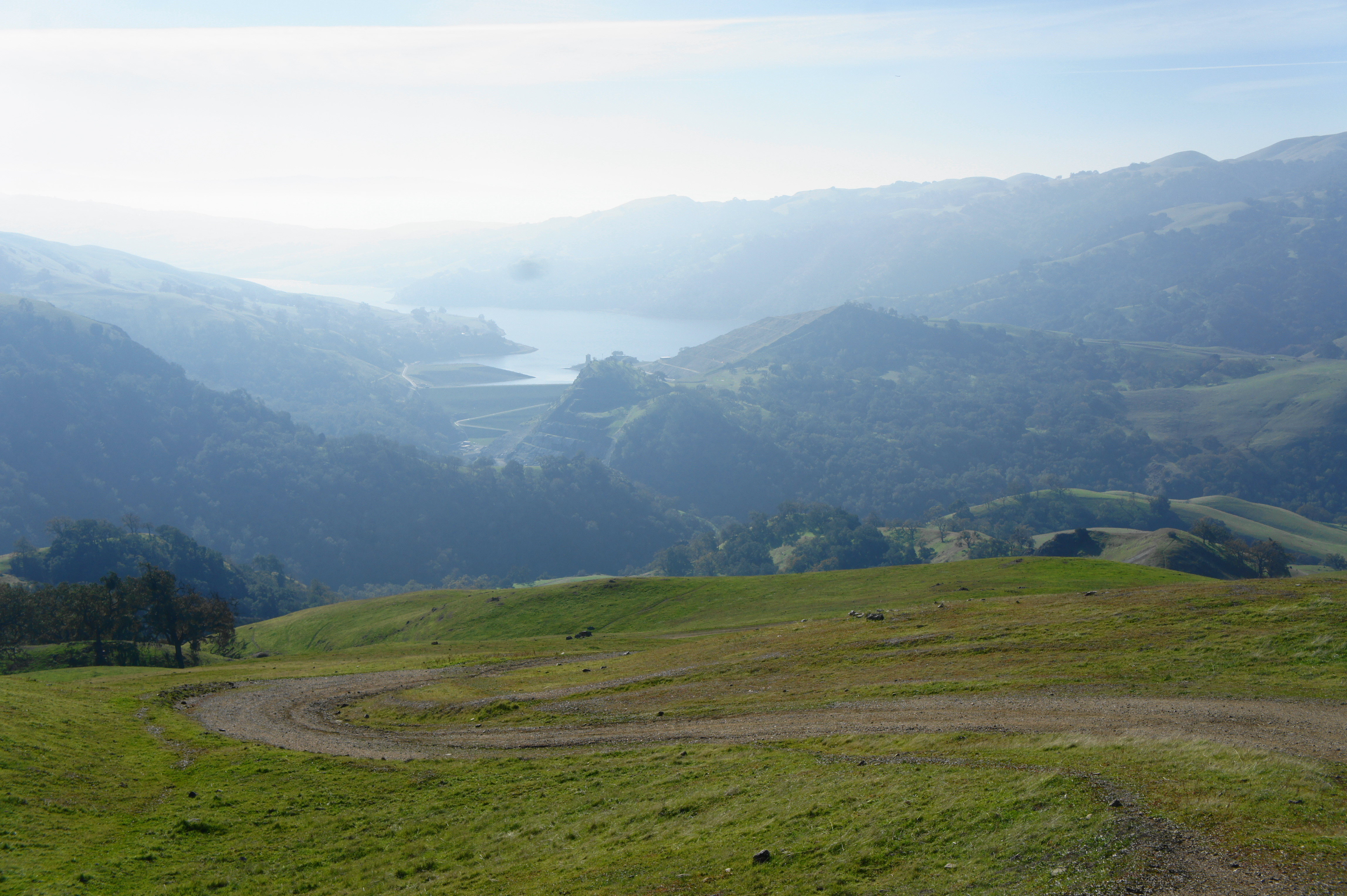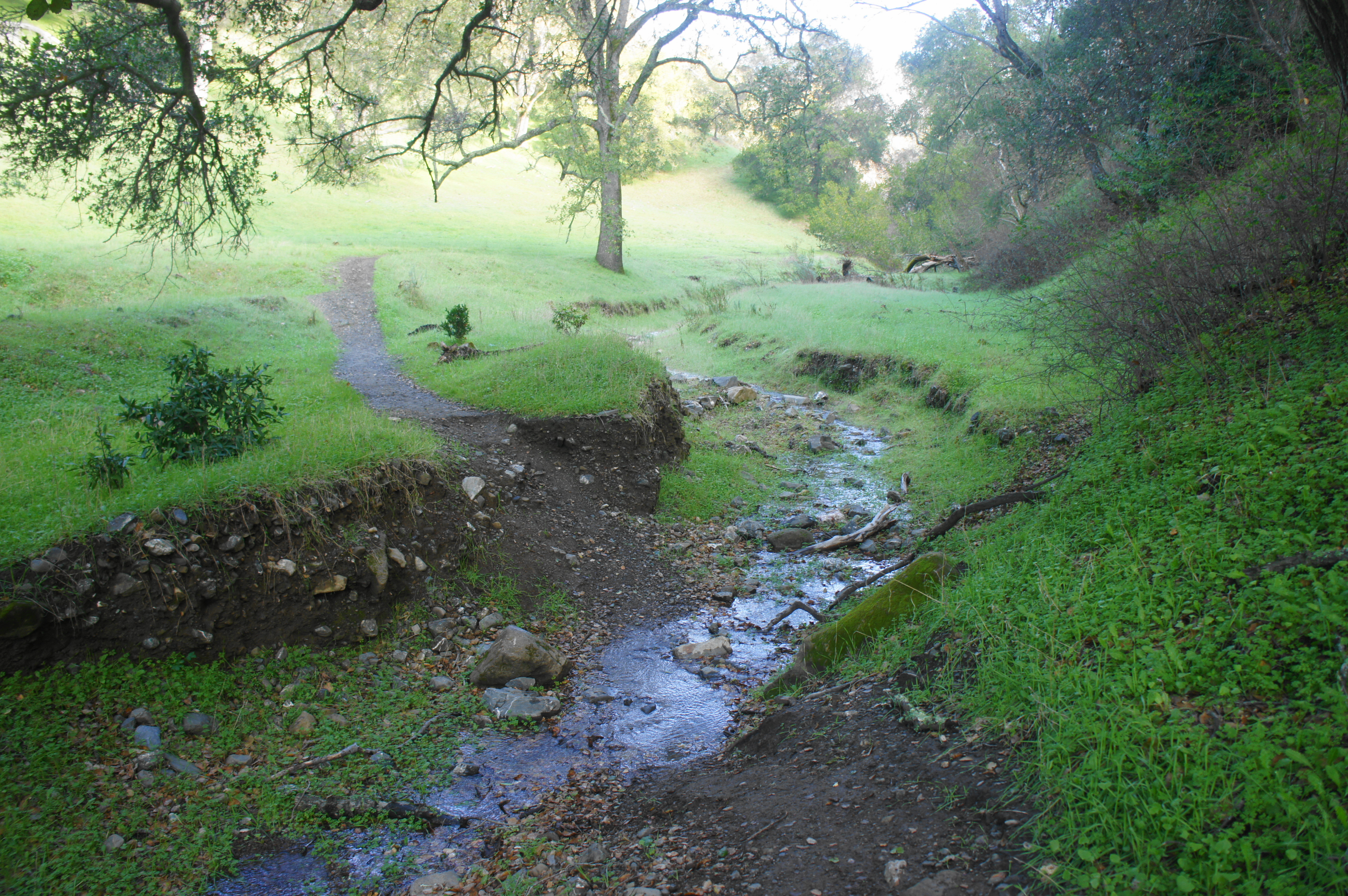 After returning to the main track, head west on Camp Ohlone Road, passing a cattle guard and then descending mildly down-valley. One can still hear and see the rushing waters of Alameda Creek, but the stream is now effectively out of reach, situated down a steep slope of perhaps 100 feet. Eventually the waters calm and the valley broadens, and hikers round a right-hand bend that brings one closer to the road and parking areas.