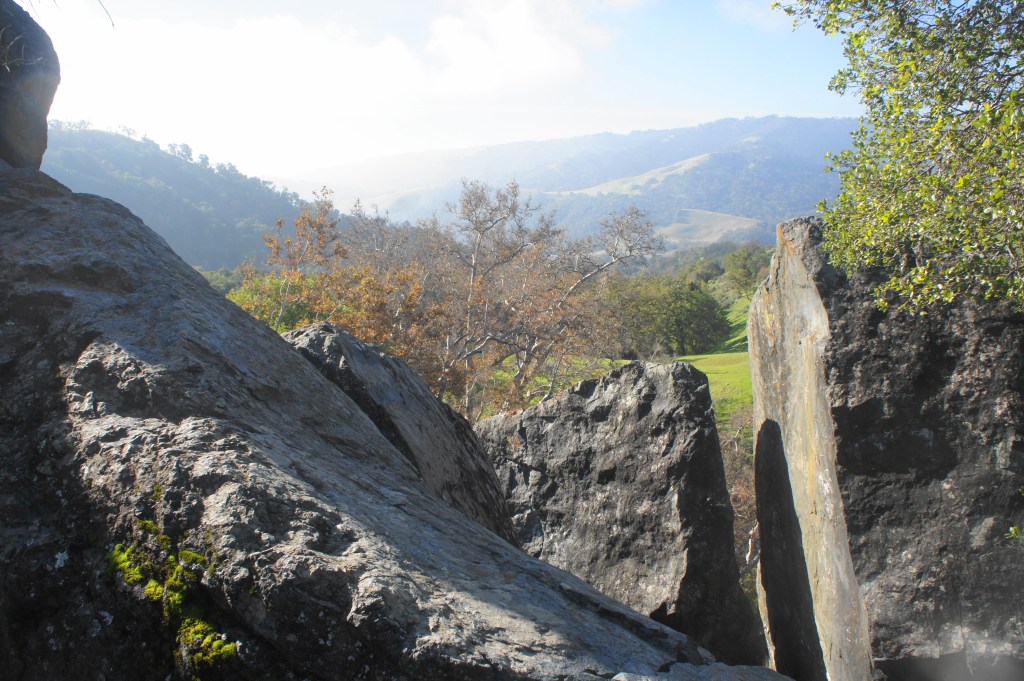 After the sixth crossing, the Indian Joe Creek Trail leaves behind its namesake and climbs sharply and steadily up a woody hillslope between two drainages. The imposing ridgetop of Cerro Este peeks through the trees above, still a good distance from here. After returning streamside and passing a junction at 1.3 miles, climb for another minute or two to reach Cave Rocks, a massive jumble of basalt boulders, perched on a slope overlooking Sunol Valley, with Mission Ridge visible beyond. A short spur trail leads to the rocks, which can be explored but requires some careful scrambling.