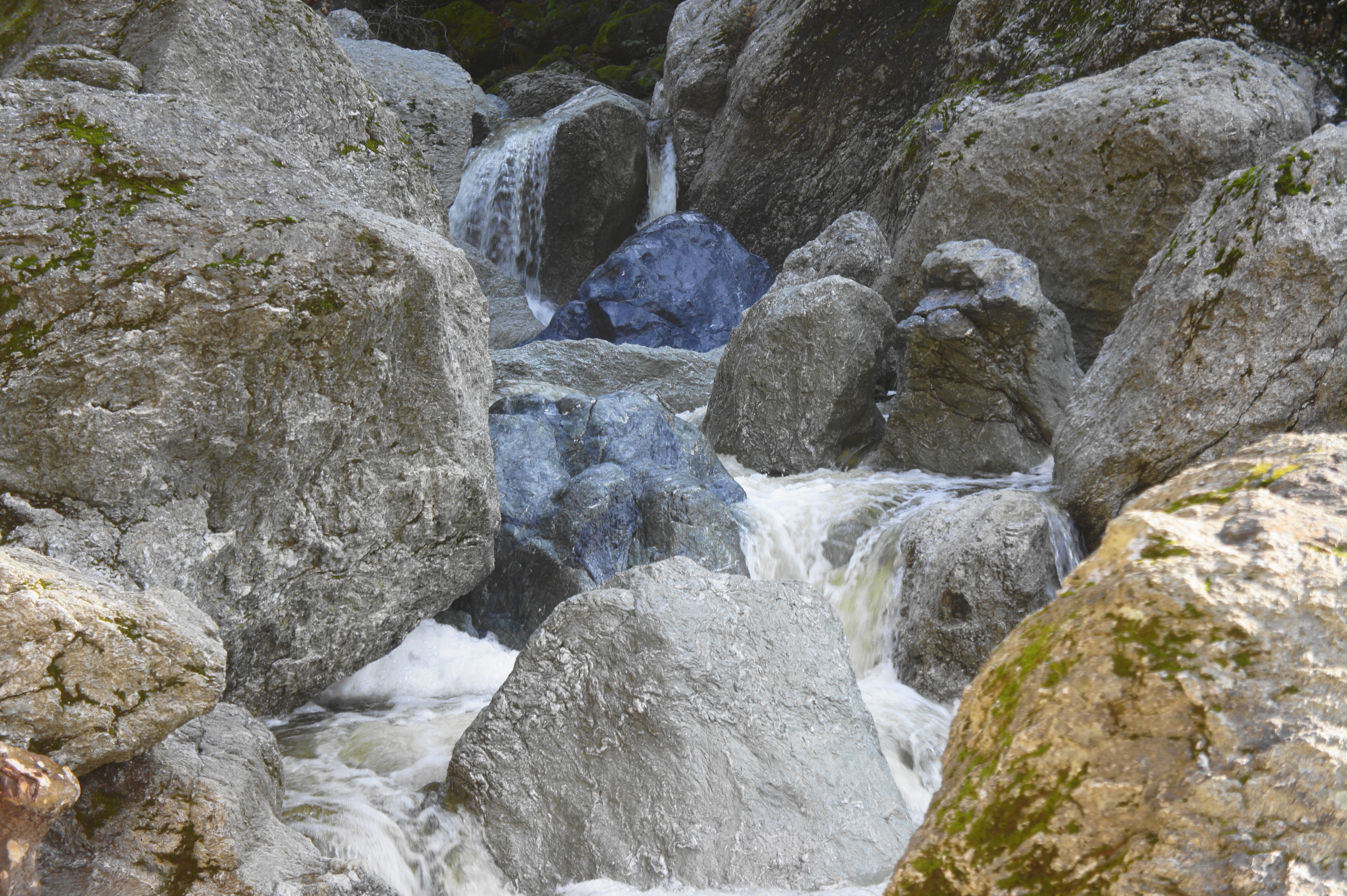 By now, one can hear the rushing cascades of the Little Yosemite Area (at least in winter/early spring), a very popular destination and one of the main draws of Sunol. Here Alameda Creek squeezes through a tight canyon, producing a series of stairstep cascades—none entailing more than 10 feet of freefall—that can be quite pretty but sort of difficult to reach. Immediately across from the end of Cerro Este Road, there is one signed area where hikers can scramble down the sharp banks to the creek’s edge. Unfortunately, some of the taller drops upstream are marred by the presence of rock graffiti.