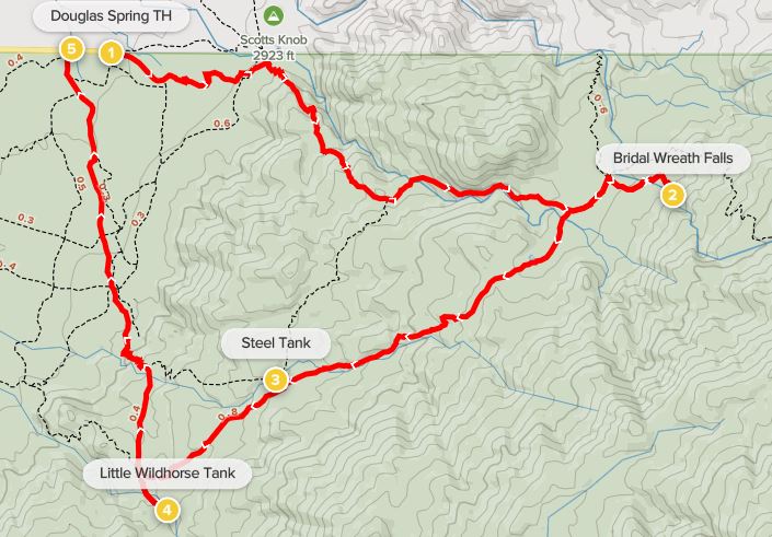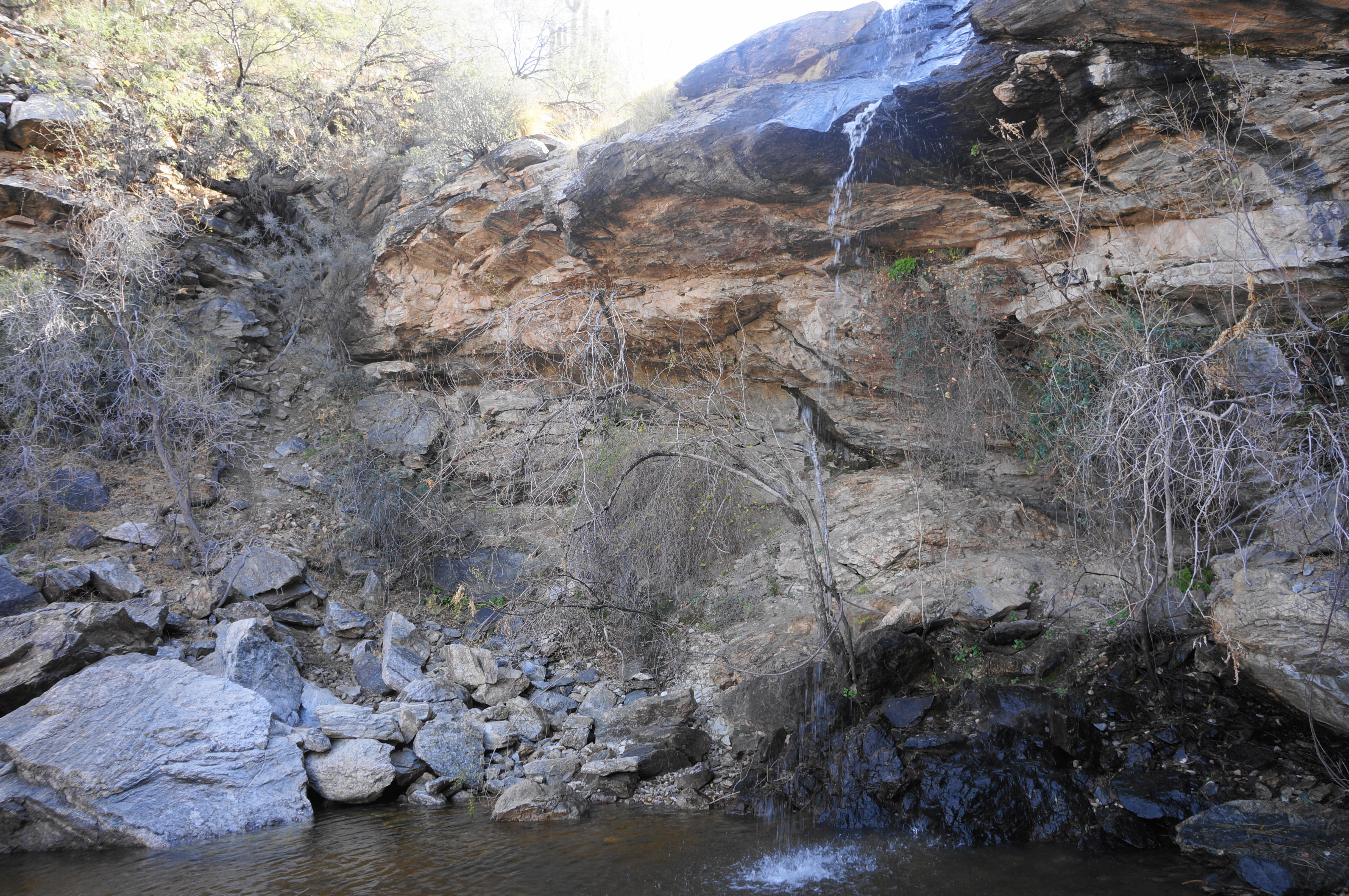 At about 2.4 miles, stay left at the junction with the Three Tank Trail, which hikers will take later to reach Little Wildhorse Tank. Continuing on the Douglas Spring Trail, crisscross a minor drainage and then come to another fork around ¼ mile later. Here hikers should bear right at the four-way junction, taking the short Bridal Wreath Falls Trail as it descends through thicker brush. Cross the rocky drainage, fed by the waterfall, then climb along the north banks for a bit before the trail drops again, this time ending in the drainage itself. Use careful footing as you make your way upstream, quickly arriving at Bridal Wreath Falls.