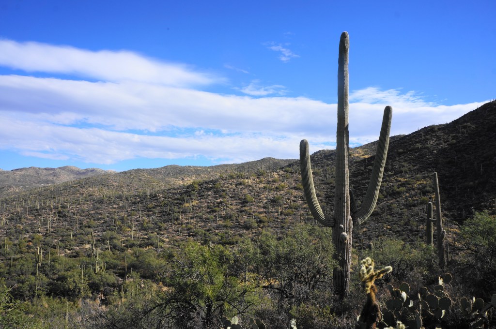 Follow the Three Tank Trail as it drops to clear a drainage and then rises steadily toward a low ridge, passing the usually dry Aguila Tank on the right. At 3.9 miles, the trail rises to the hike’s highest point (about 3,800’), a saddle with fine views across the Santa Cruz Valley. In the distance, one can spot the Tucson Mountains, partly encompassed by the west unit of Saguaro National Park.
