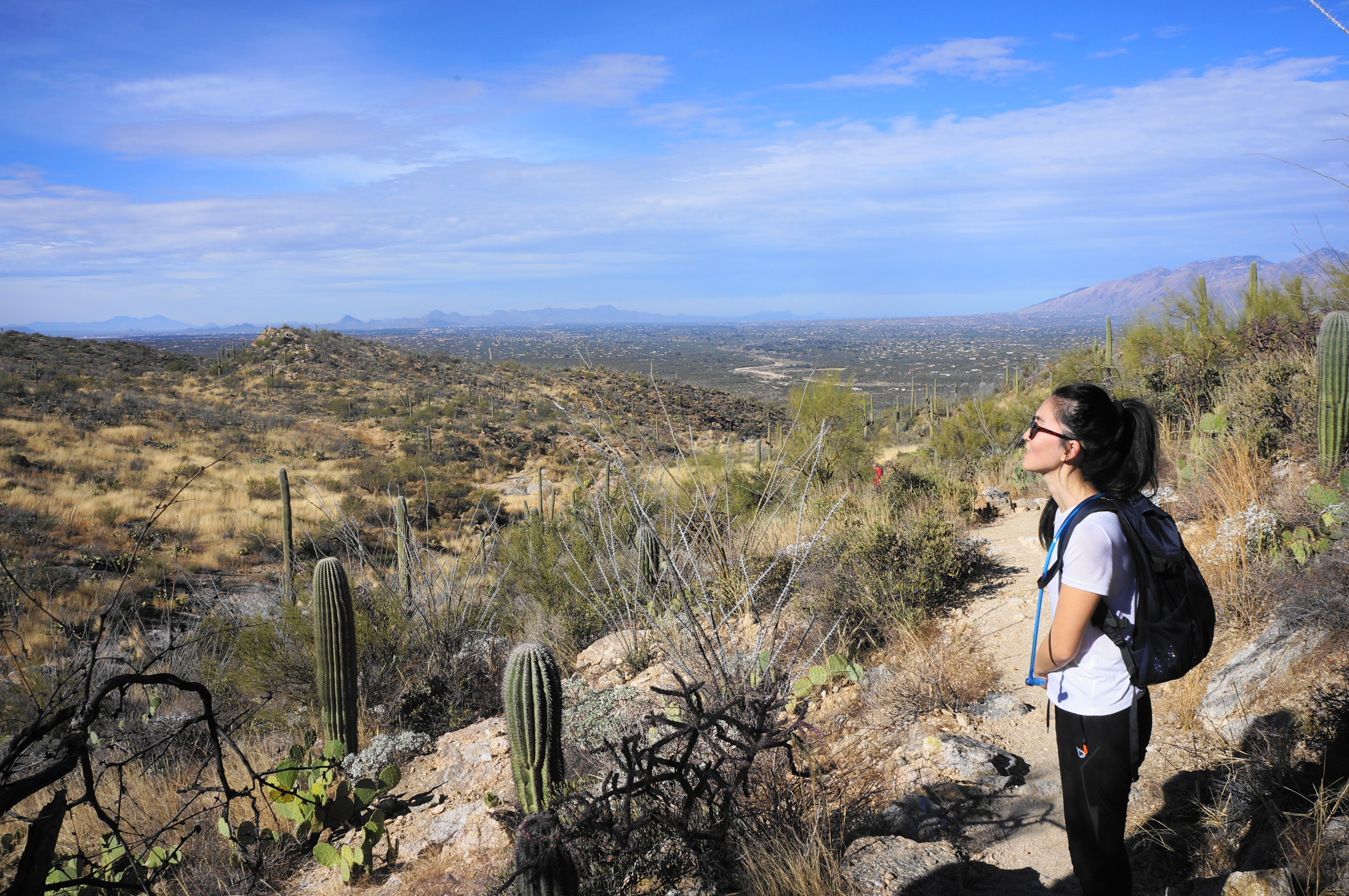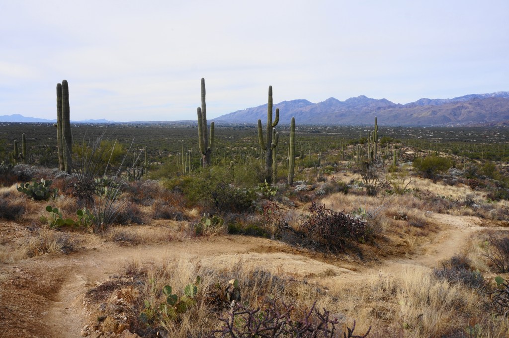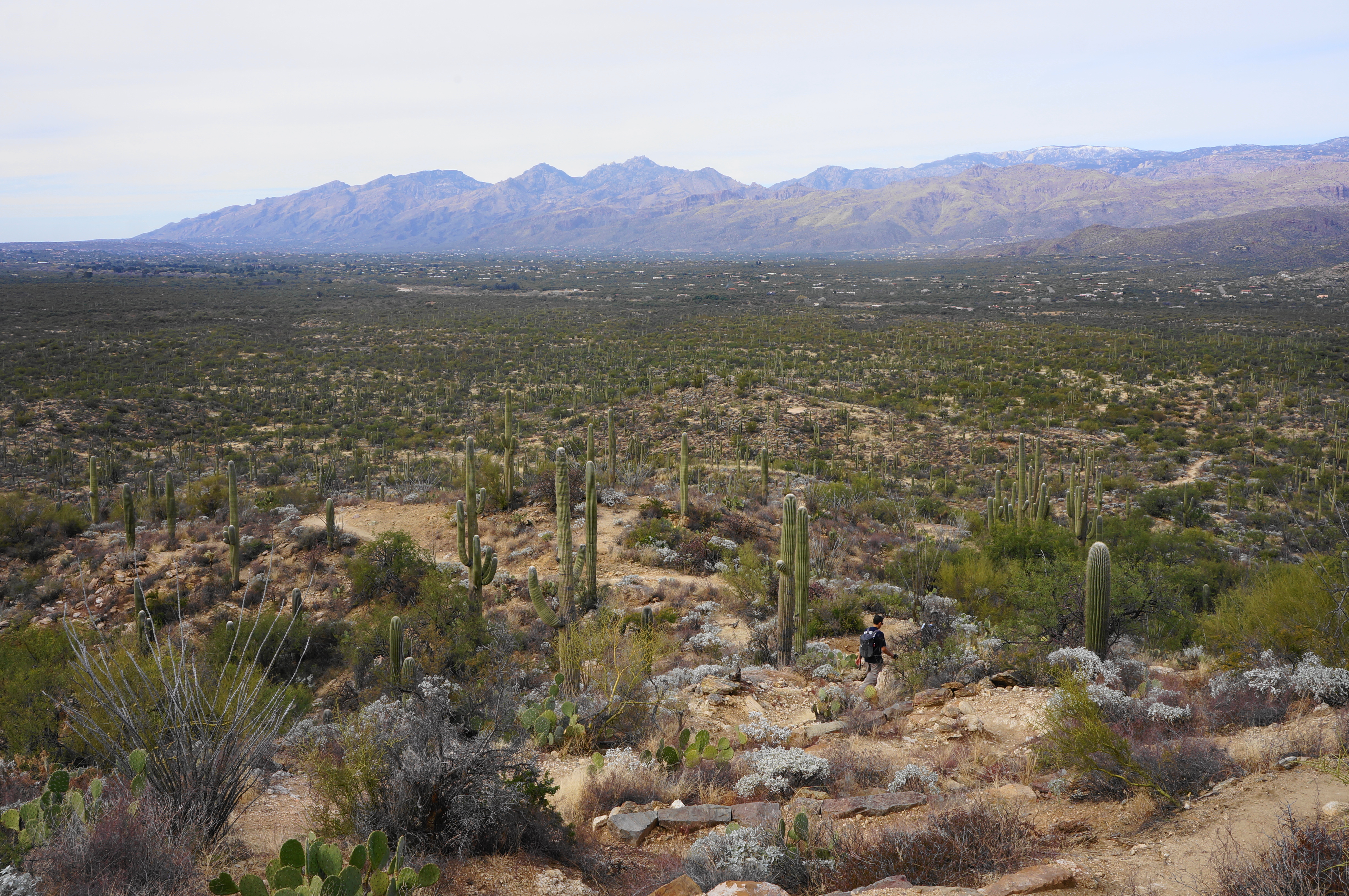 From here the path rises mildly to a second junction, this time with the Converse Trail. Stay left again, entering a section that rises into the foothills of the Rincon Mountains. A steady uphill incline brings hikers up to around 3,100 feet. After a brief flat, the ascent continues, climbing steeper stone steps, with expansive views across the broad valley to Tucson and the Santa Catalina Mountains. Ahead, the landscape is dominated by Tanque Verde Ridge, a long hogback that eventually connects with Mica Mountain (8,666’), the highest point in Saguaro National Park. (Note: Reaching Mica Mountain requires at least a 2-3 backcountry trip.)