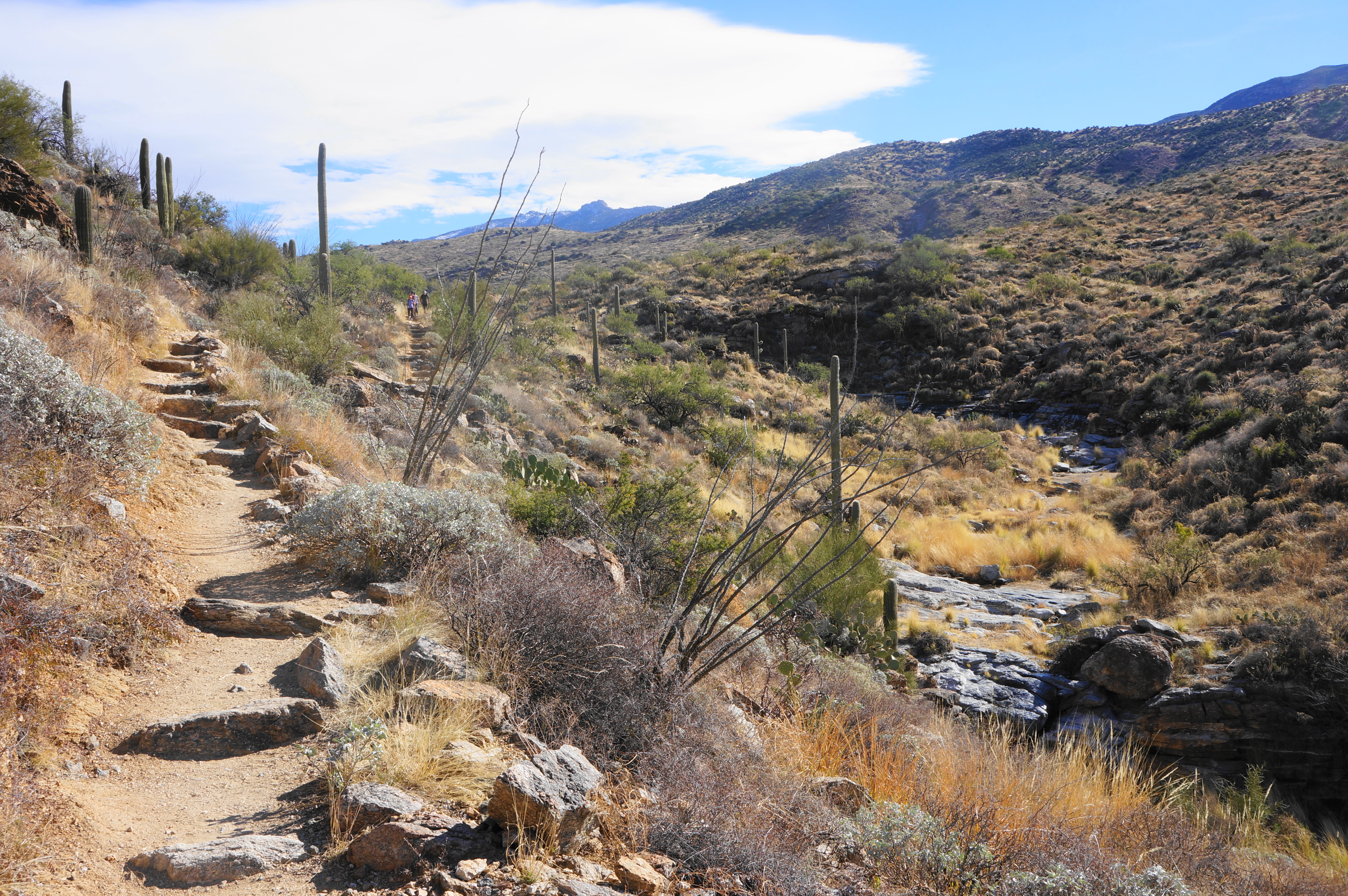 Yuccas and ocotillos become more ubiquitous—and saguaros sparser—as the Douglas Spring Trail rises higher, reaching about 3,400 feet before a third junction. Although hikers will eventually find themselves on the Carrillo Trail en route to Little Wildhorse Tank, for now stay left on the Douglas Spring Trail toward Bridal Wreath Falls.
