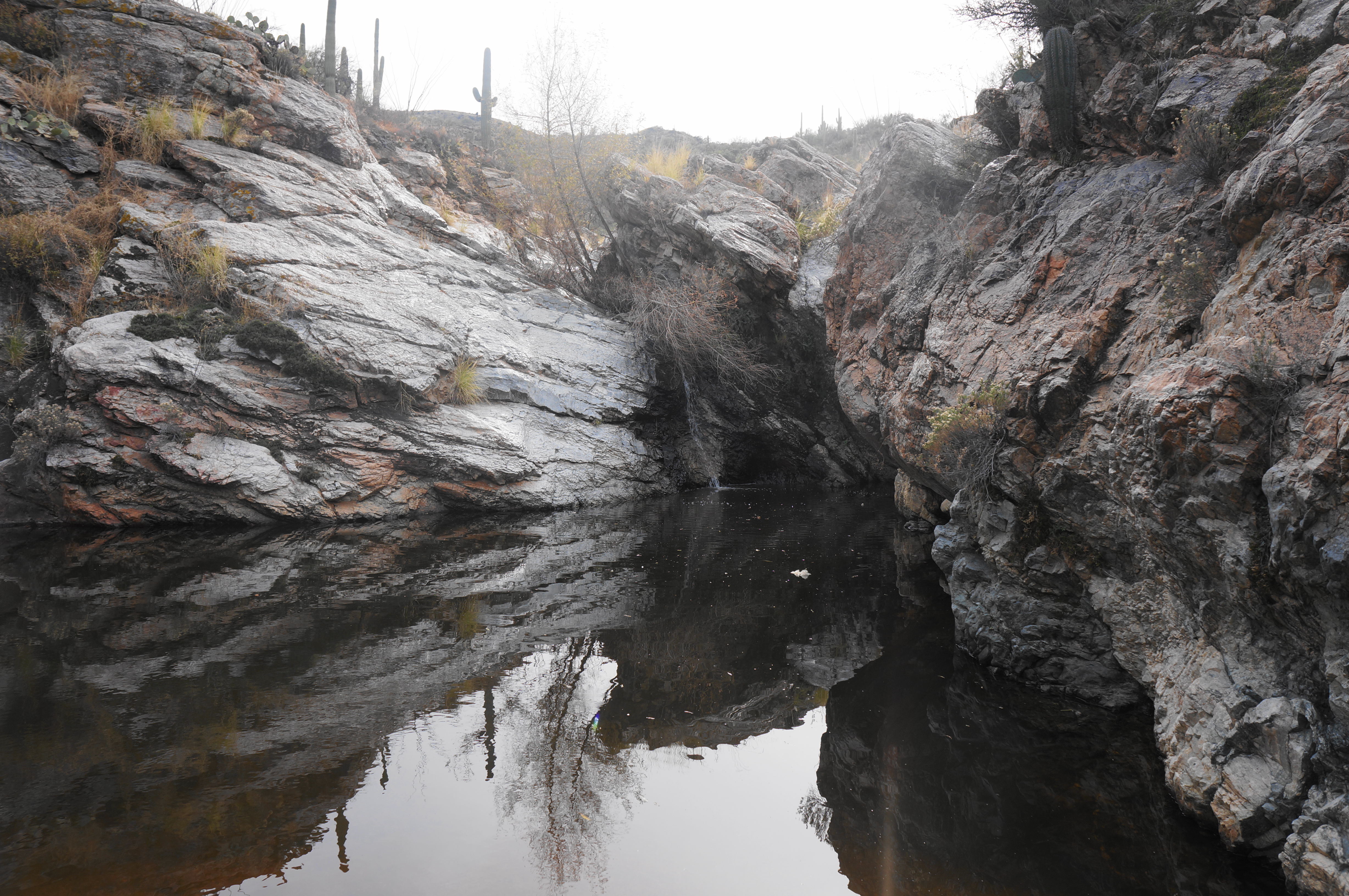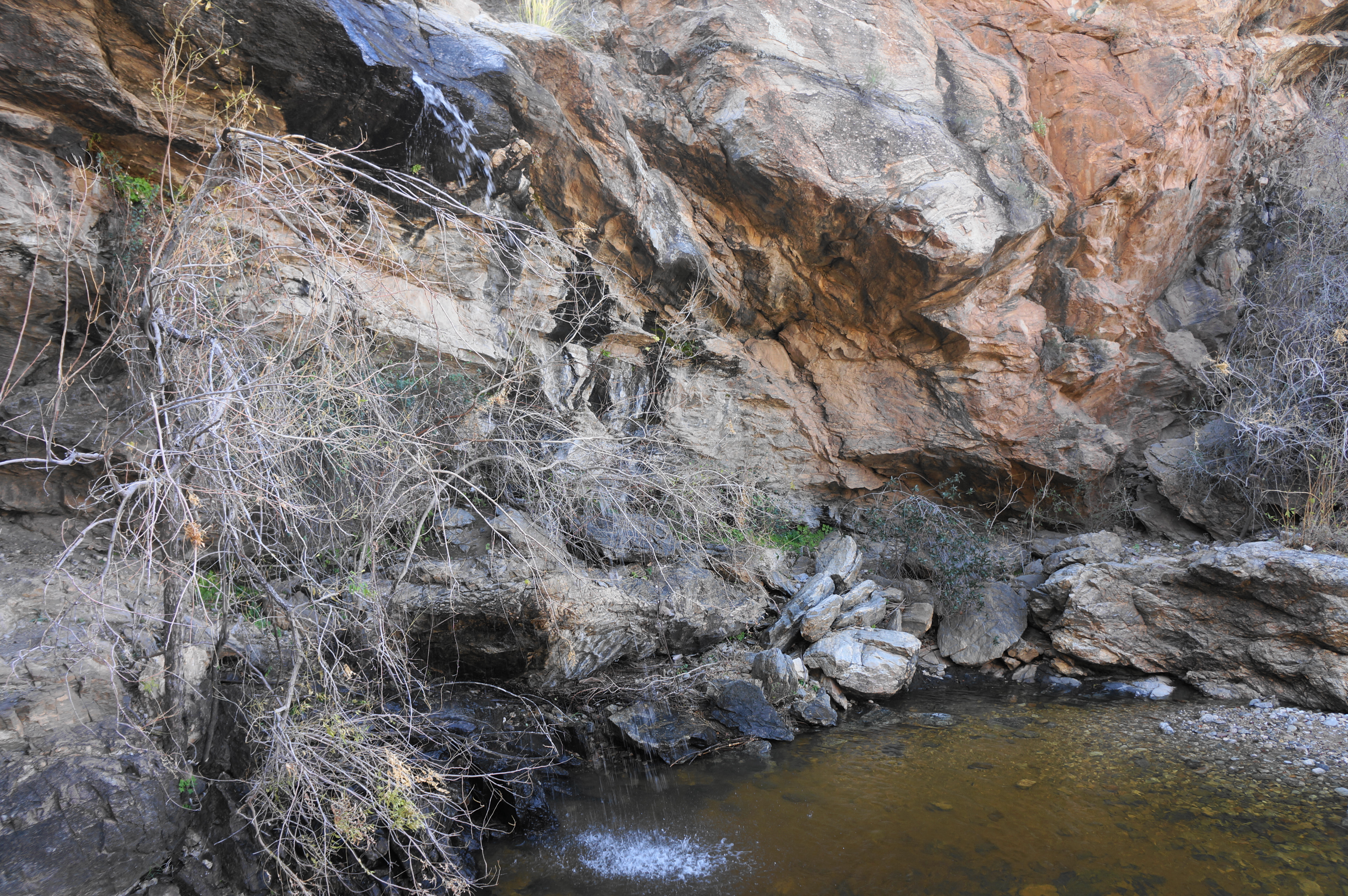 At last, the trail descends to a gravelly beach and Little Wildhorse Tank, a shady pool fed by rains and snowmelt from the seasonal stream. This pretty spot boasts a full-fledged riparian environment, a mini-oasis in the Sonoran Desert. Hikers can stop here for a snack and rest before continuing on to finish the loop.