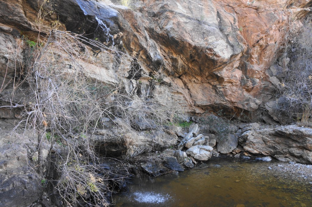 Given that it usually has only a faint or nonexistent flow, the waterfall is no Niagara Falls, but the multihued cliff and clear pool makes the area a pleasant enough sight. A small beach and adjacent rocks offer places to stop for a snack and enjoy the shady glen, a relatively rare sight in the sun-soaked desert.