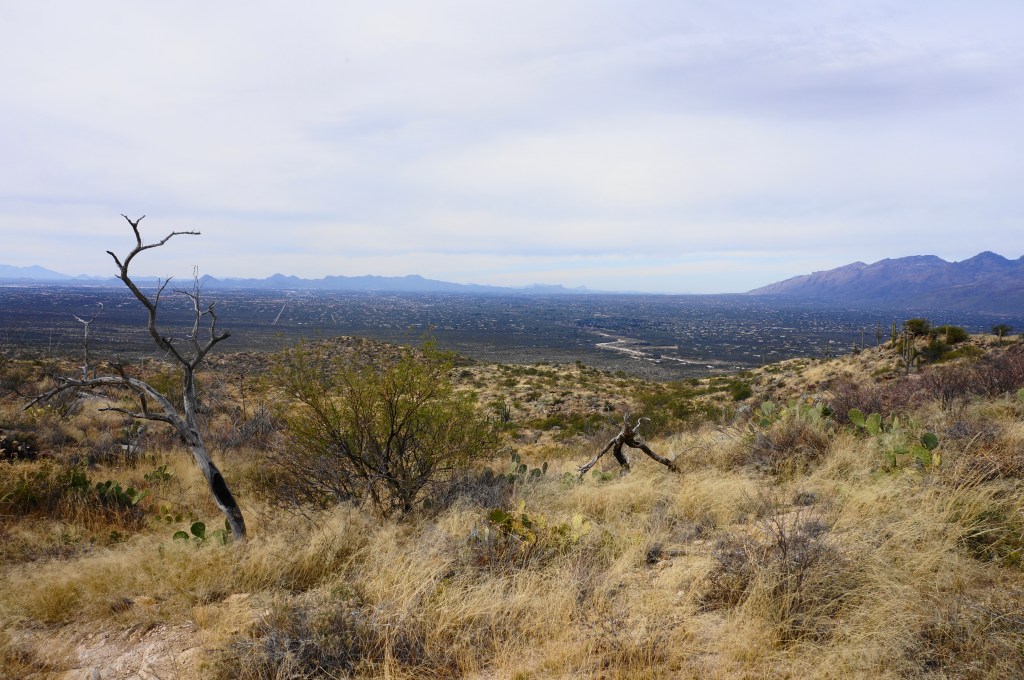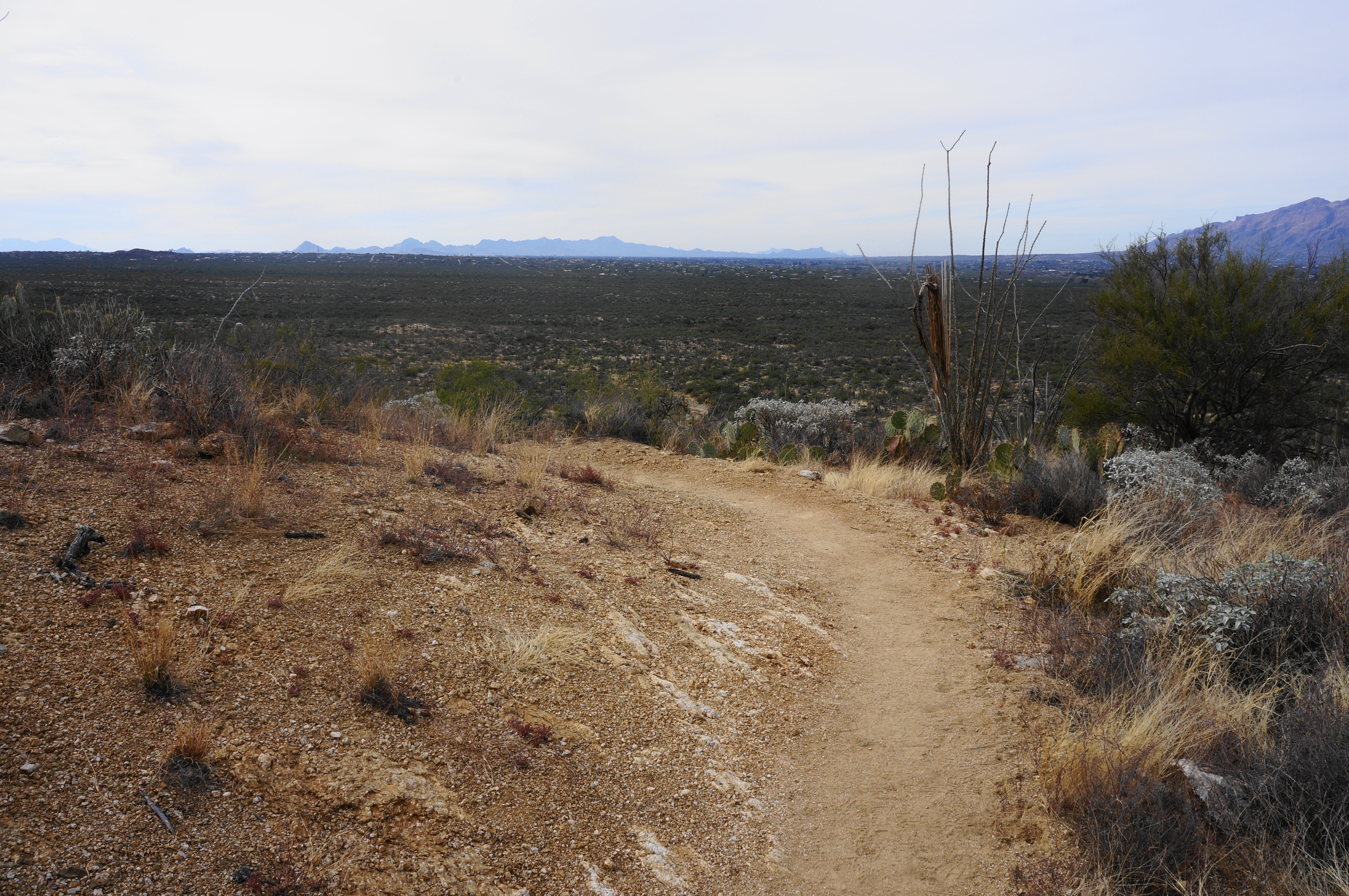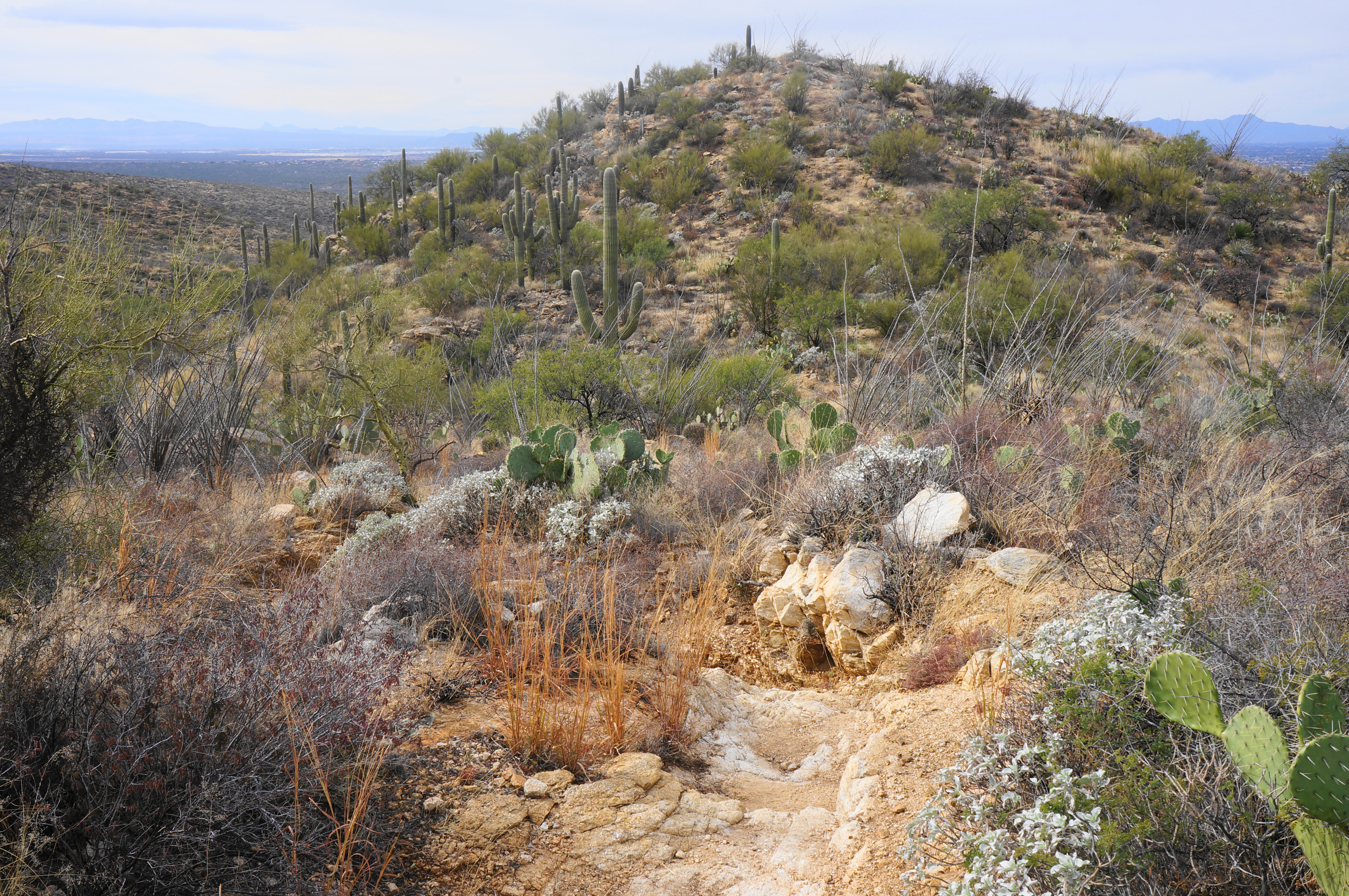 Once across the wash, ascend a staircase and parallel the drainage from high above, looking back across the valley to Tucson and beyond. The trail soon levels off and then crosses a side drainage flanked with brush. Continue to climb up to a sun-soaked plain. This area was once charred by the 1989 Chiva Fire, although it is hard to tell today as tufty grasses and brush have overtaken the flat once again.